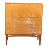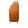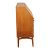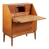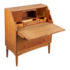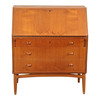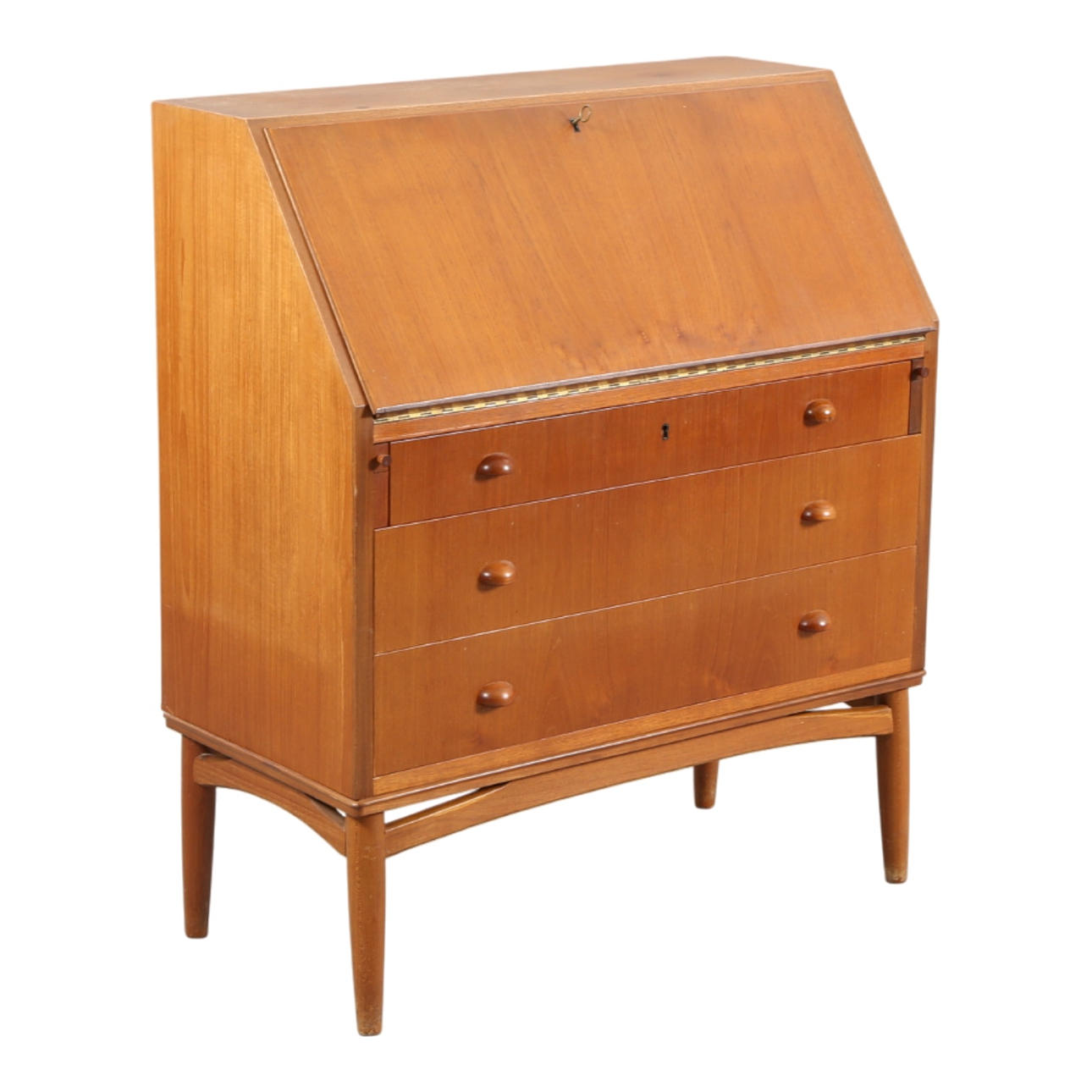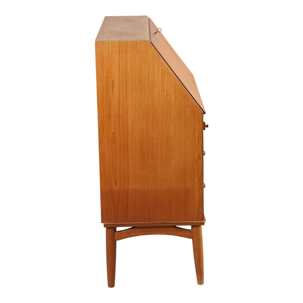 Chatol af finéret teak, front med tre skuffer, herover skråtstillet skriveklap, bag hvilken låger, skuffer og rum. 1950'erne. H. 105, B. 90, D. 44-80 cm. En nøgle medfølger.