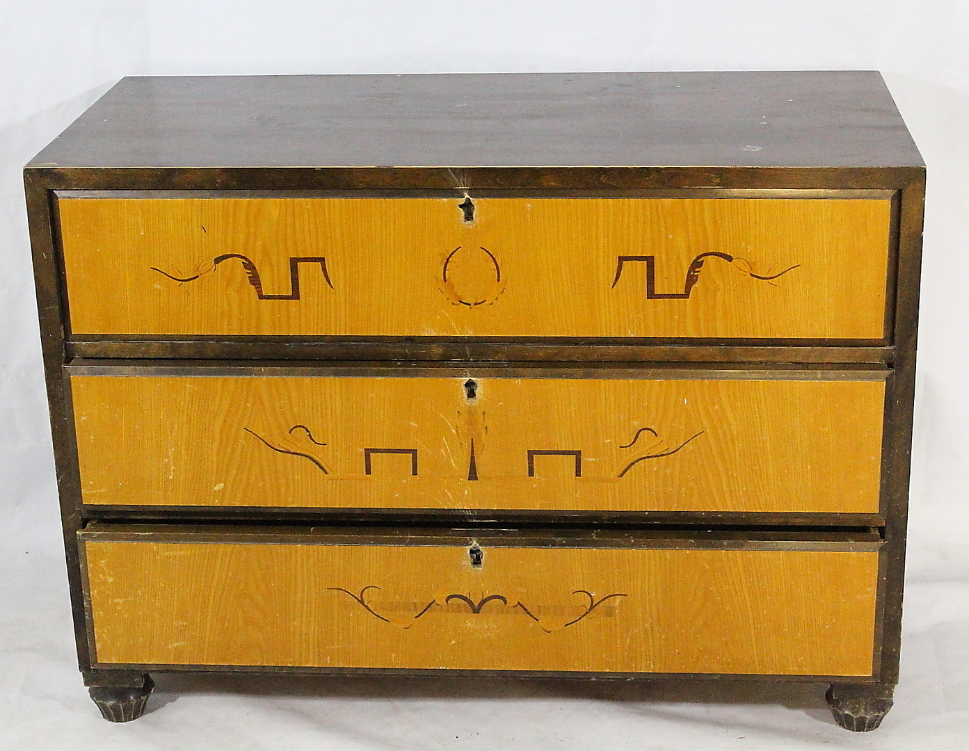 481430. Kommode, tre-skuffer, træ med intarsia.
