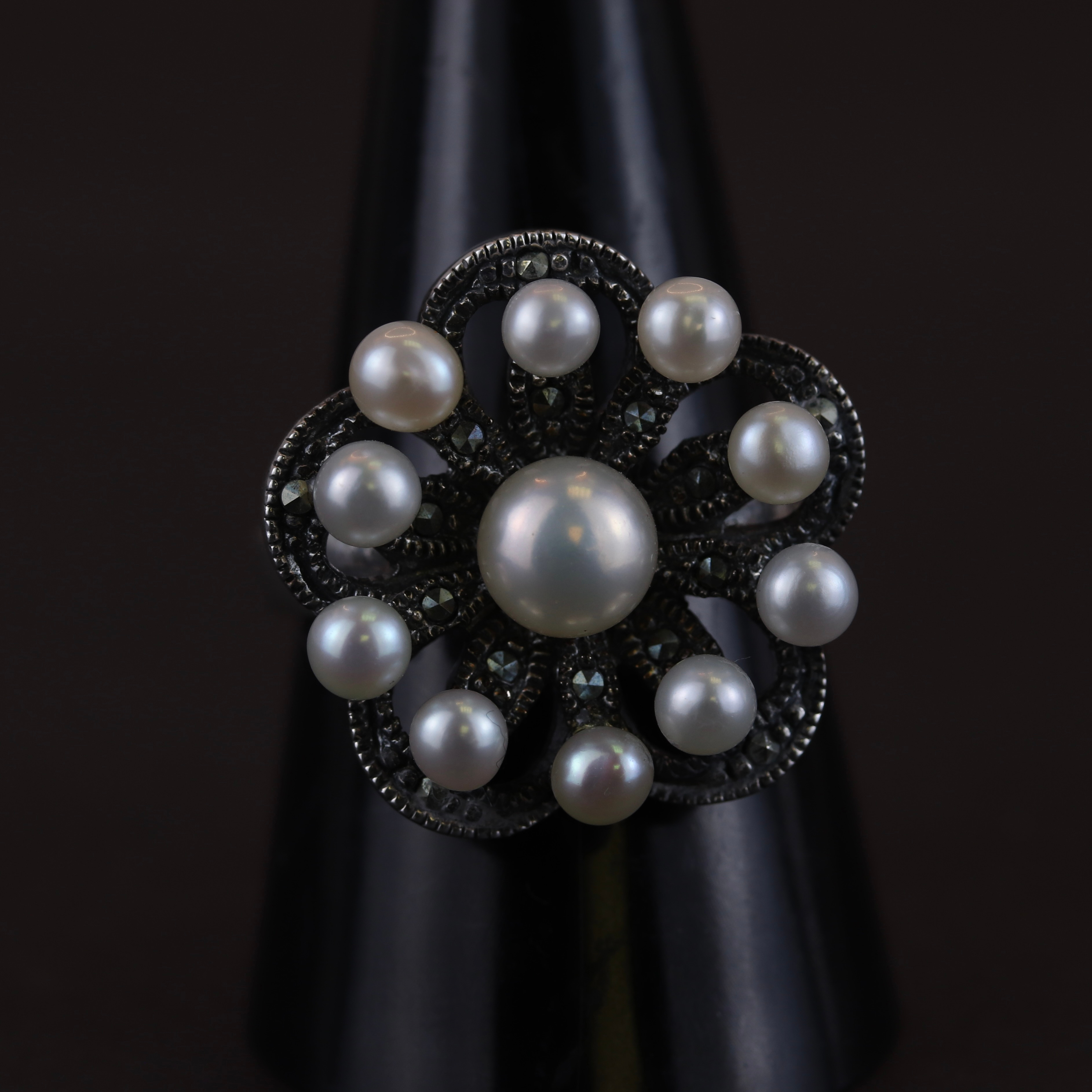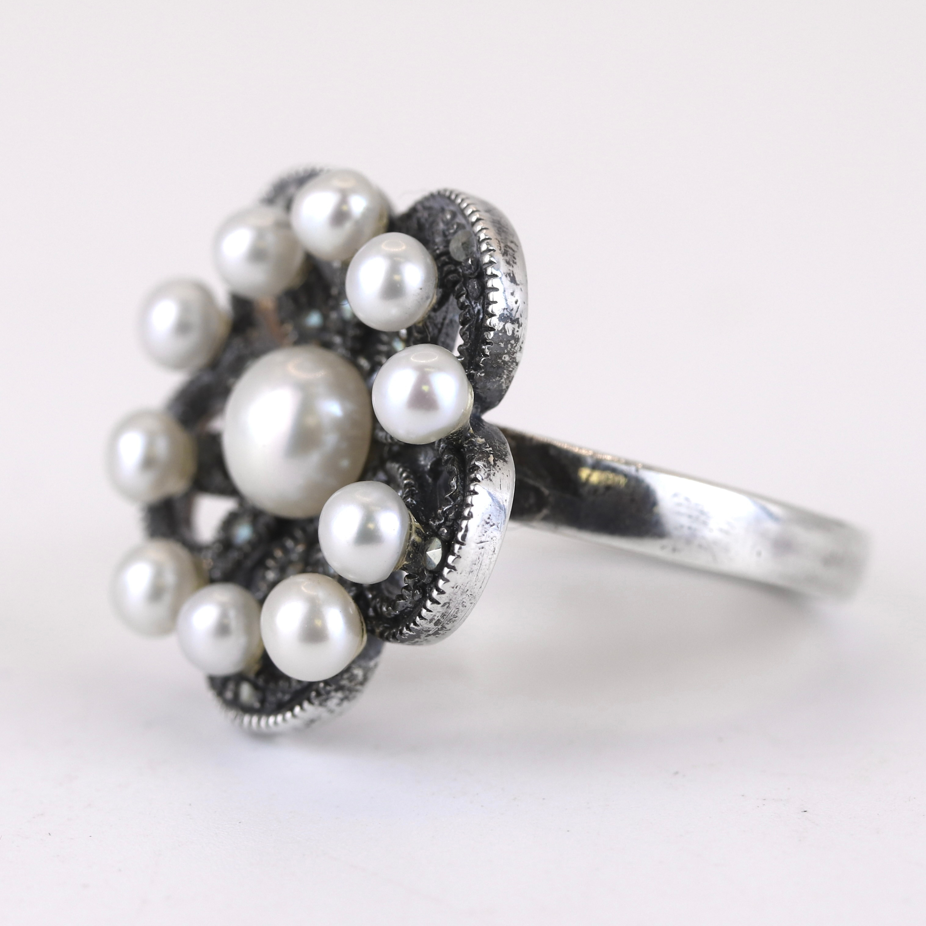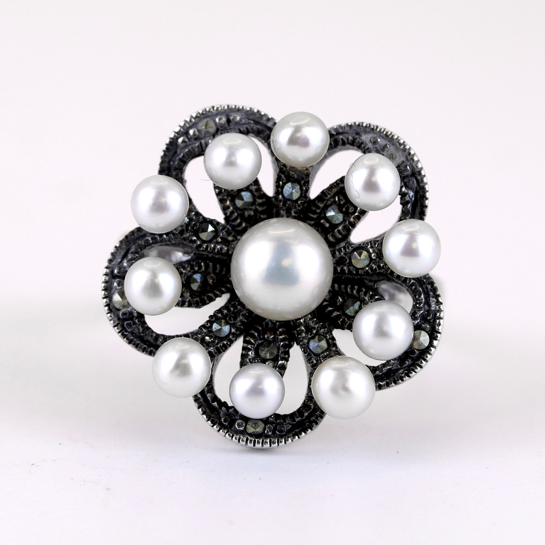 4856427. SØLVPERLE OG MARCASIT BLOMSTERRING.