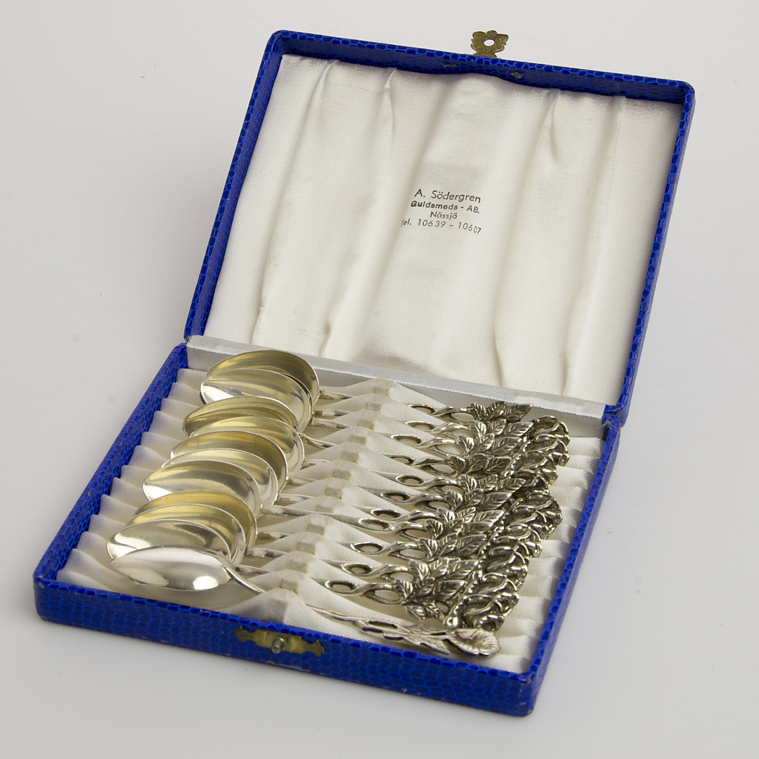 486255. Kaffeskeer, 12 stk. i etui, "Rosen", sølv.