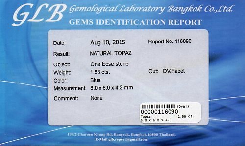 486772. TOPAZ, 1,58 CT. Blå, certifikat.