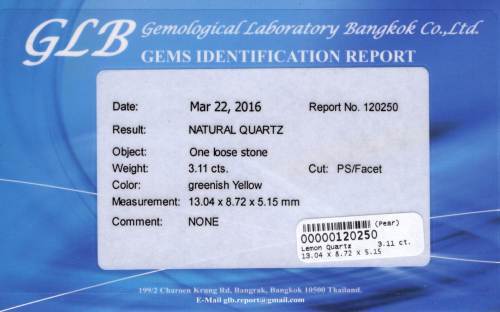 486774. CITRONKVARTS, 3,11 CT. Certifikat.