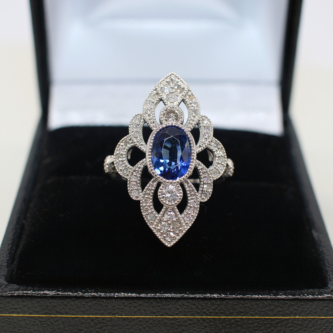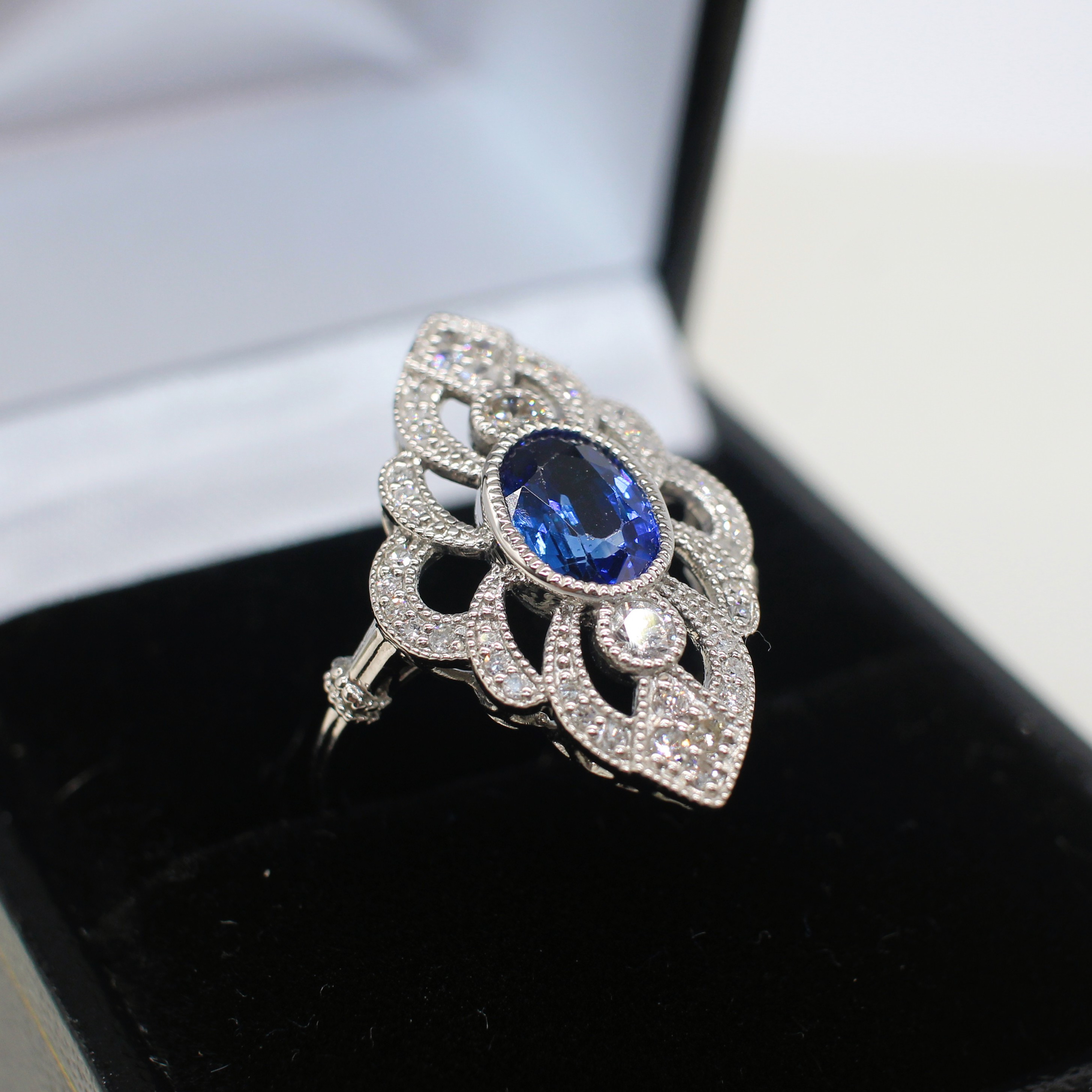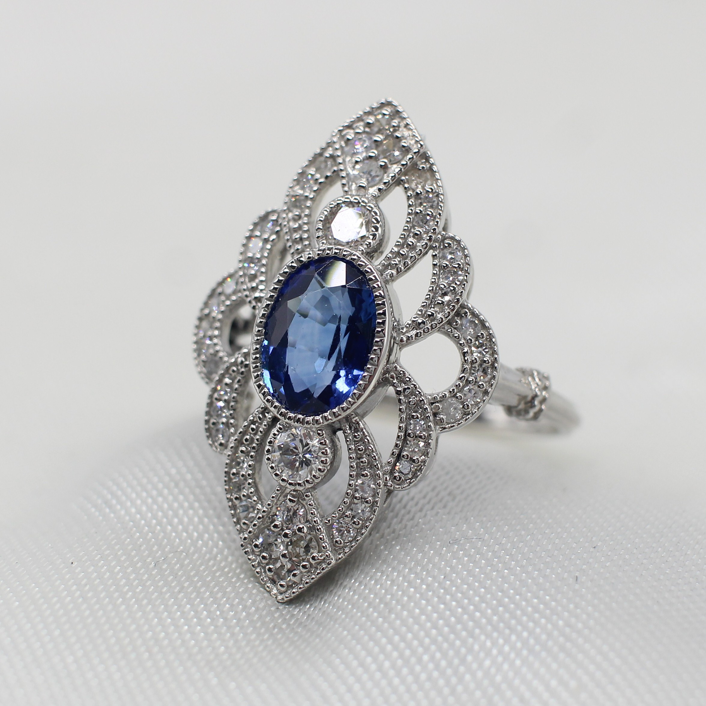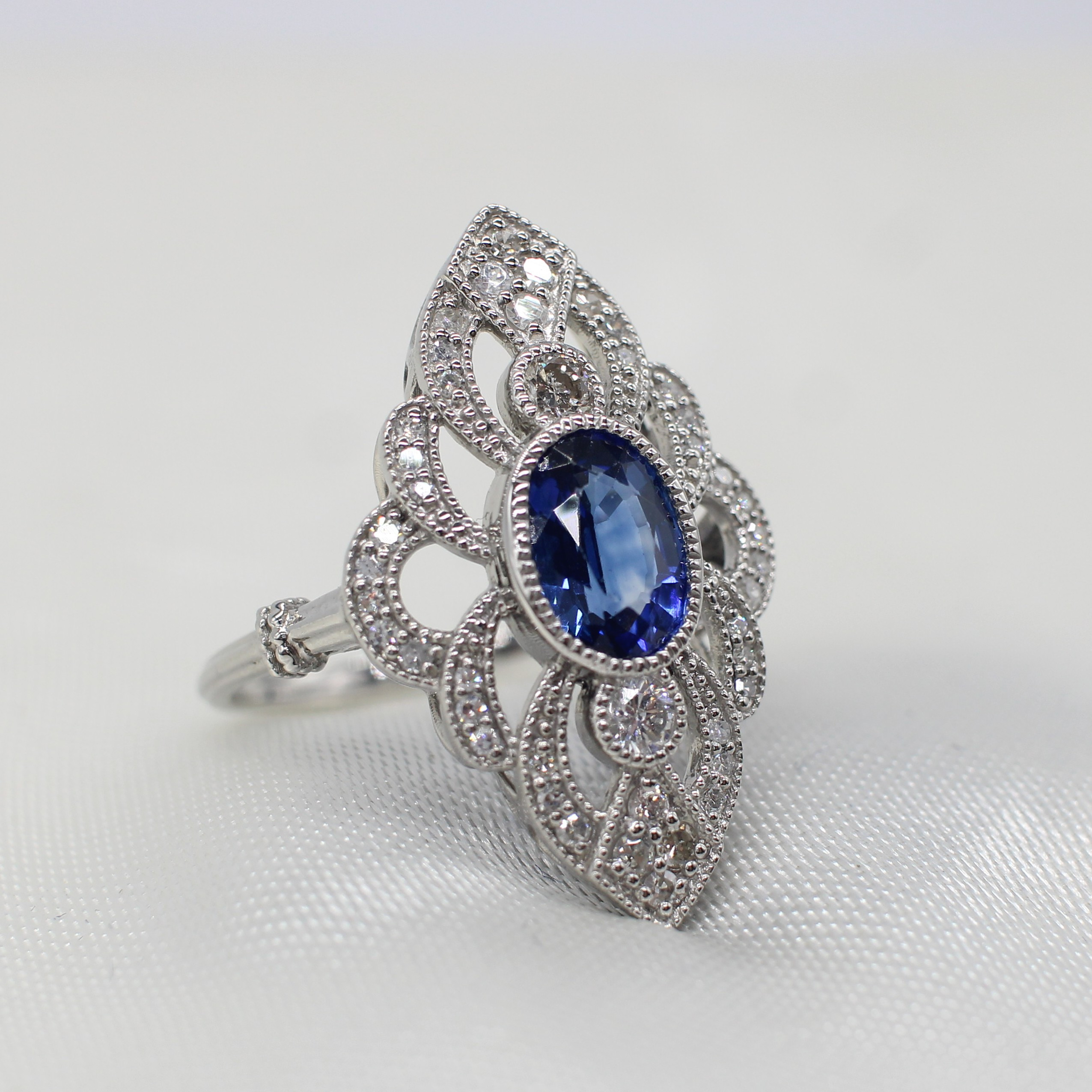4892455. SAFIR & DIAMANT MARQUISEFORMET RING.