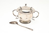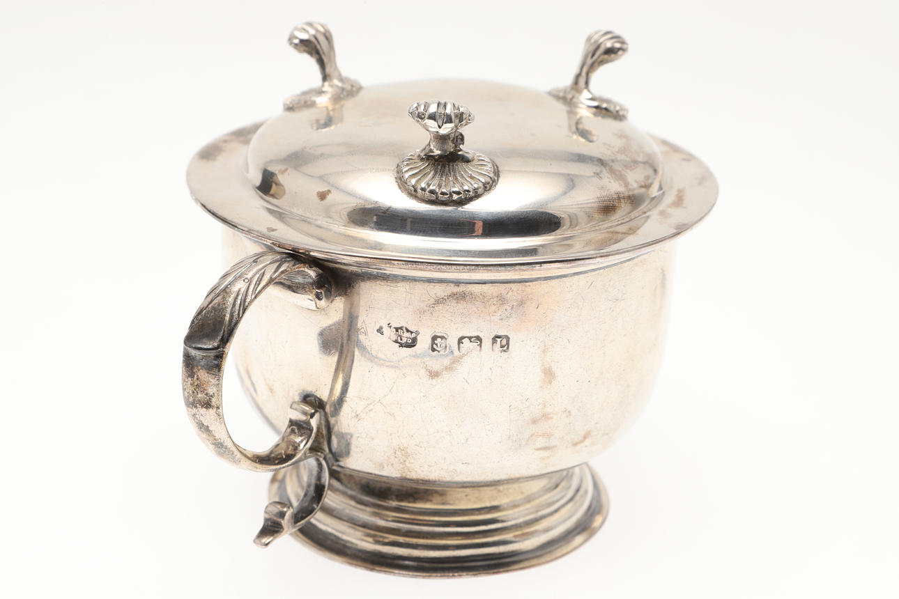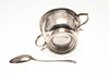 For at inkludere en kop med dobbelt håndtag, en lille plade (fungerer også som både låg og base) og en matchet ske. Mærket for S Blanckensee & Son Ltd, Birmingham, 1935. Skeen stemplet for Viners Ltd, Sheffield, 1934 (med jubilæumsmærke). Samlet sølvvægt 9.5ozt. Tasken måler Højde 11,5 cm x Bredde 18,5 cm x Dybde 16,5 cm.