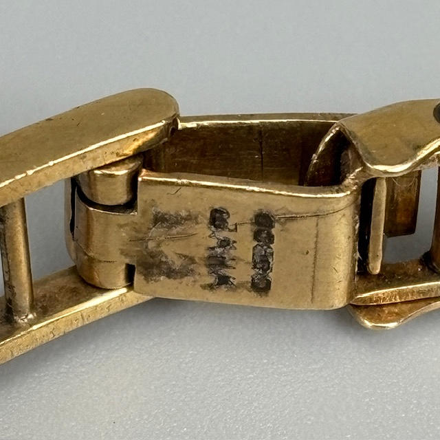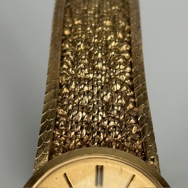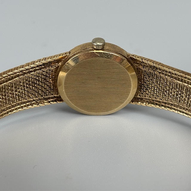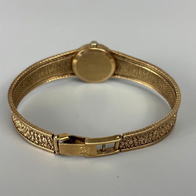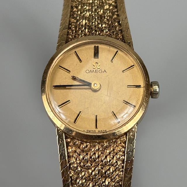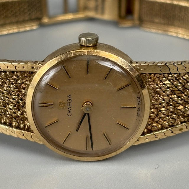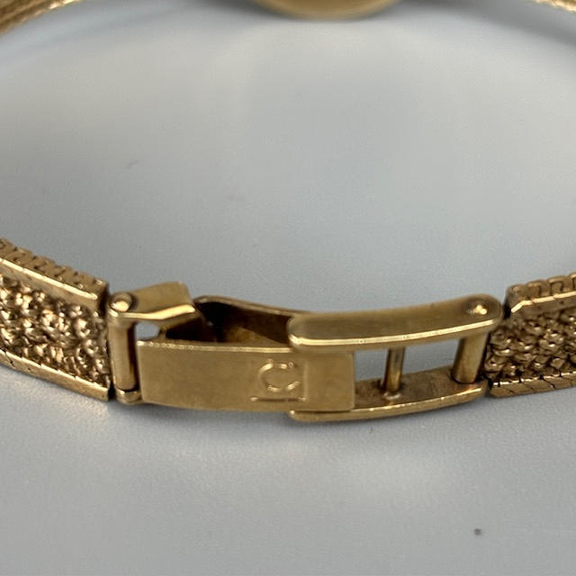 Vintage 9kt guld omega armbåndsur til damer, fuldt stemplet 9 karat indvendig kasse, serienummer 7115526, model 1061, guldfarvet skive med batoner, ca. 9 cm diameter fuldt stemplet 9kt guldarmbånd ca. 18 cm inklusive lås, ca. 19,5 g ekskl. urværk inklusive glas.