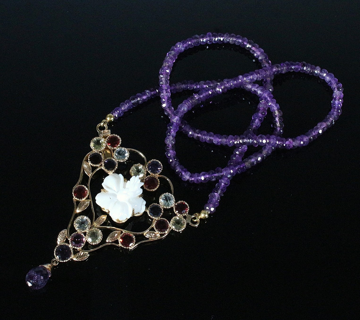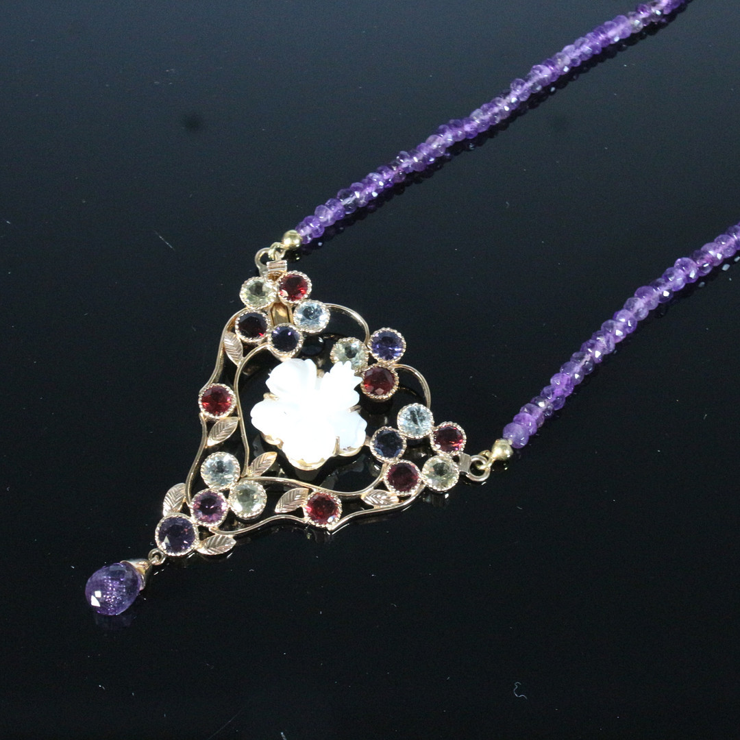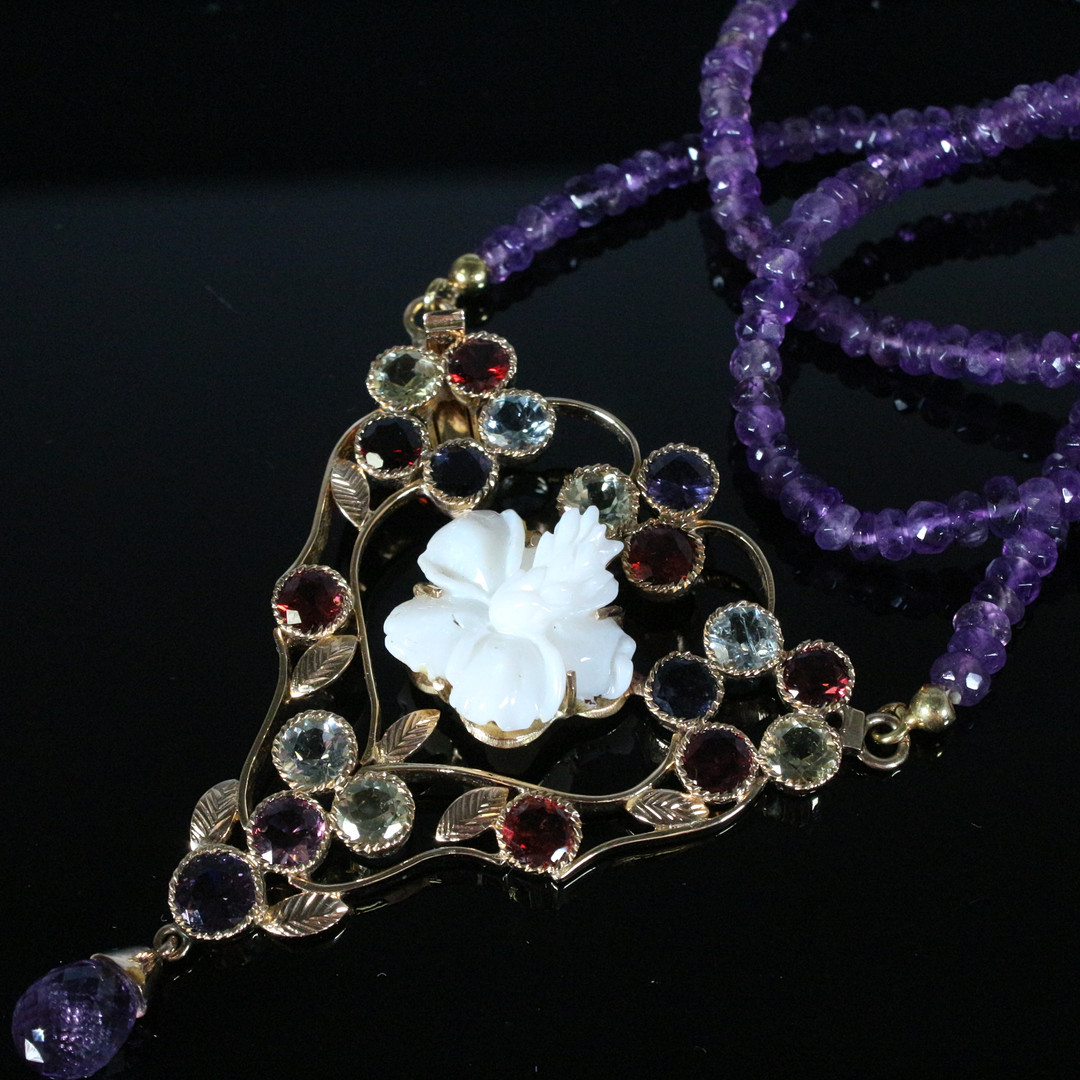 4913493. Halskæde med ametyster og opalblomst.