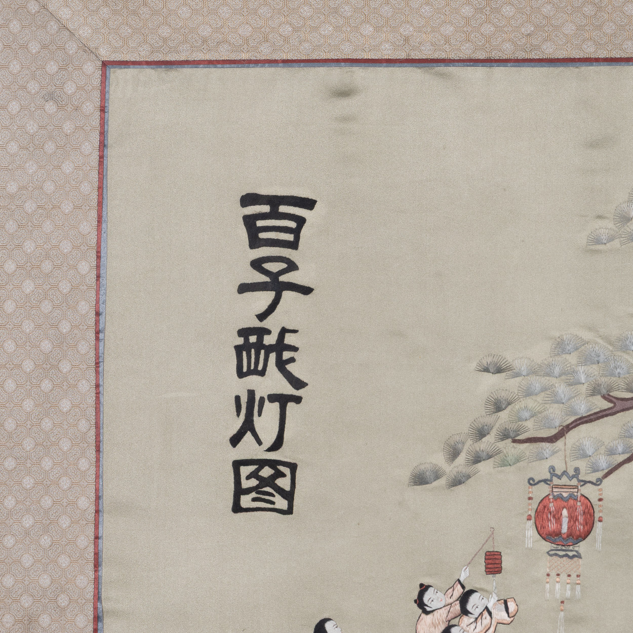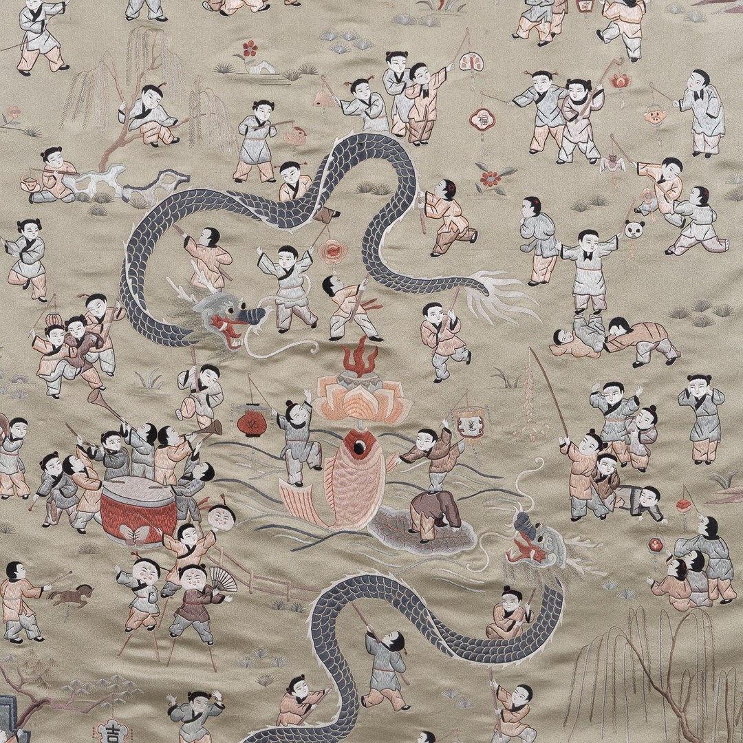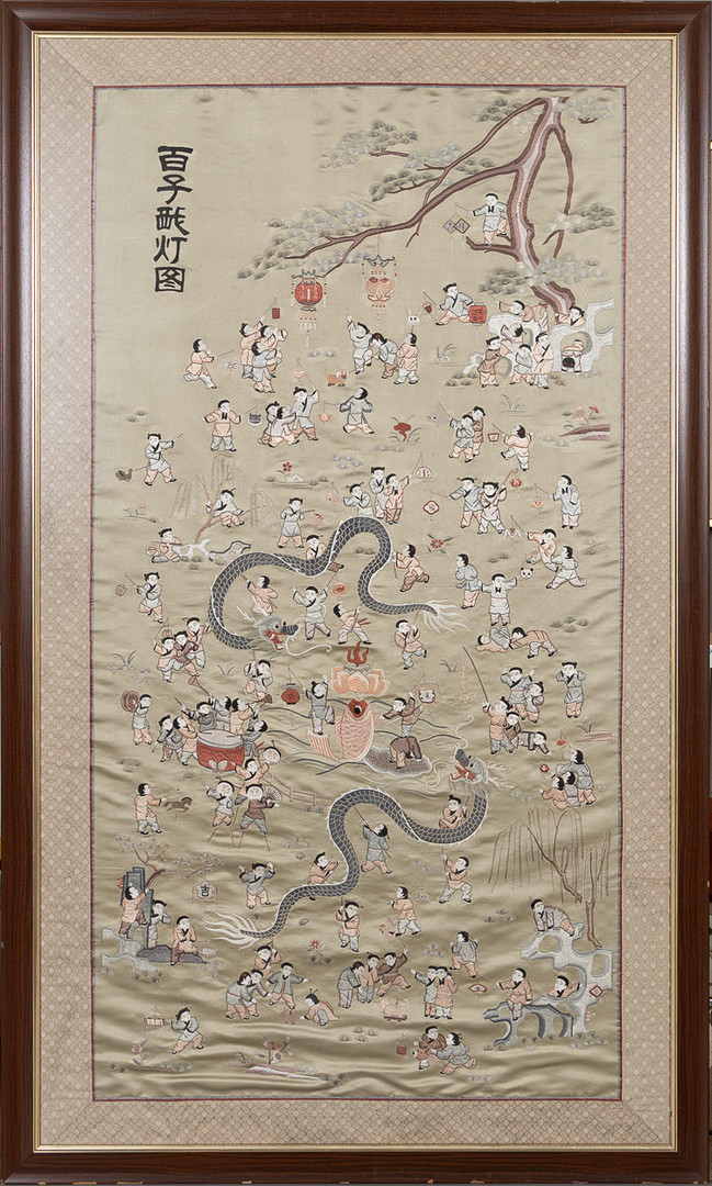4917106. PANEL, formentlig Kina, silkebroderi, indrammet.