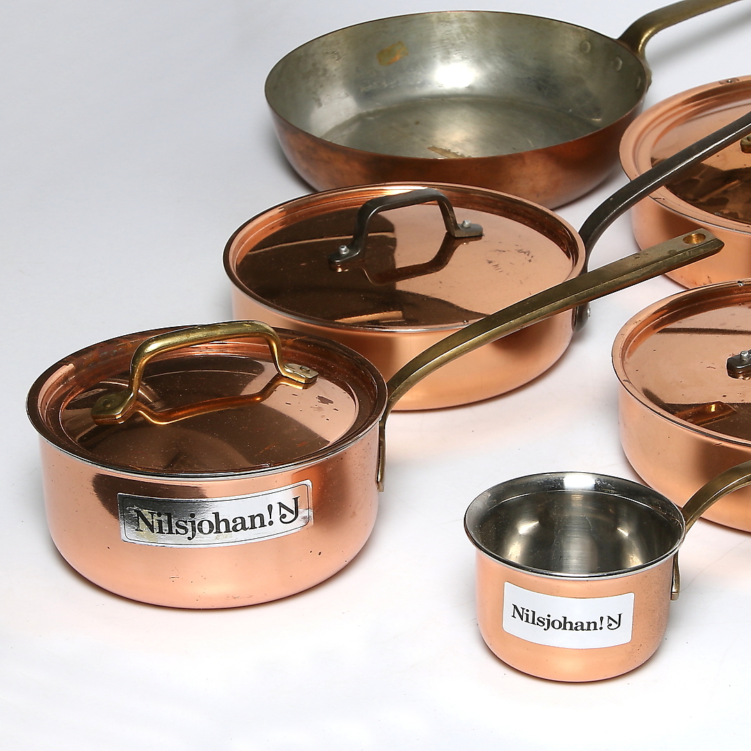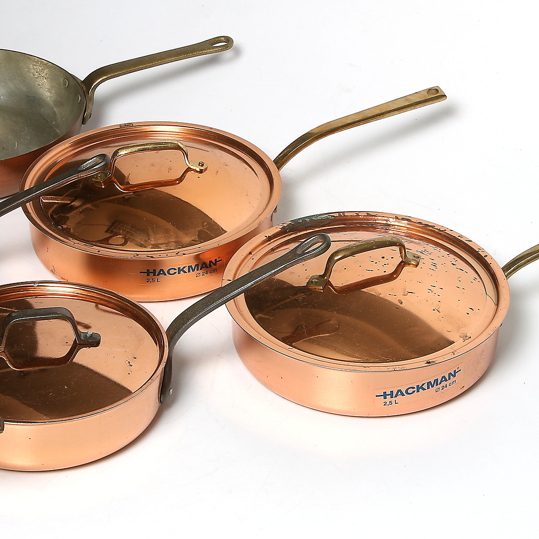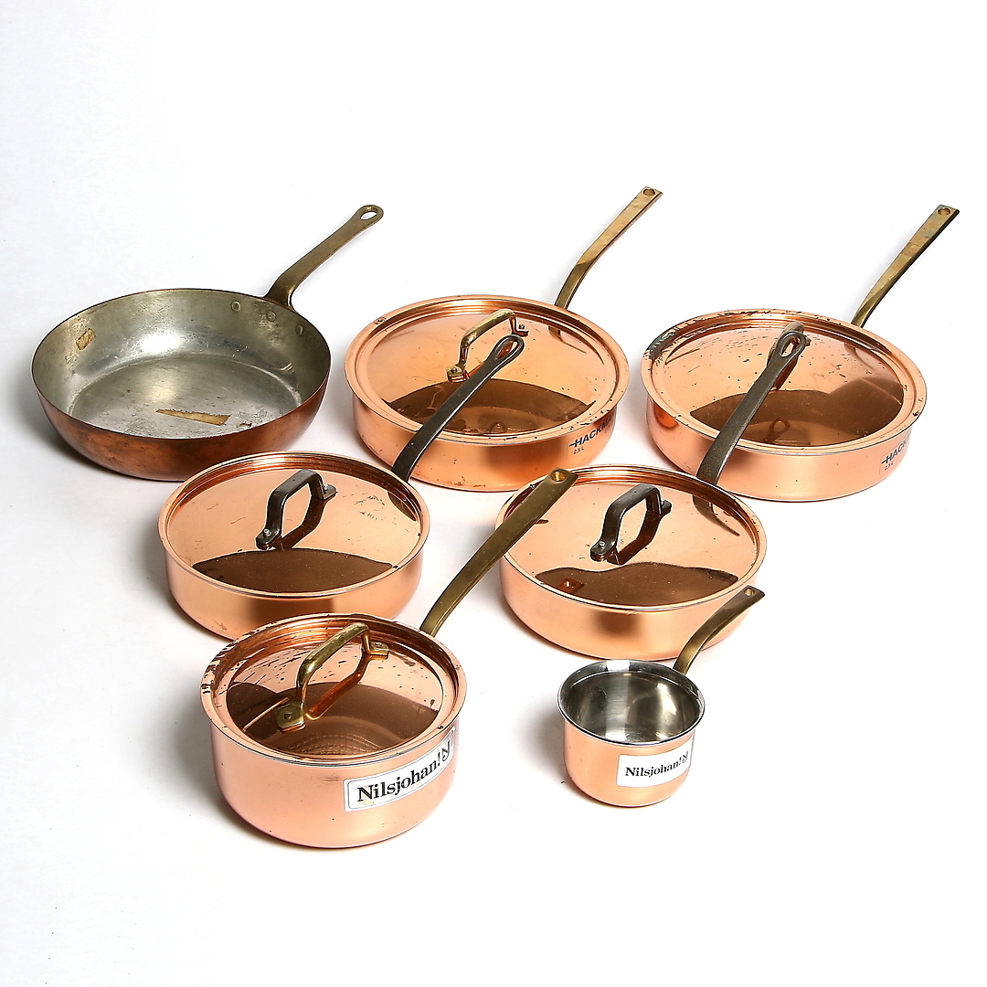 491971. TRAKTORPANDER og KÆR, 7 stk., kobber, bl.a. Hackman og Nilsjohan, 1900-tallet.