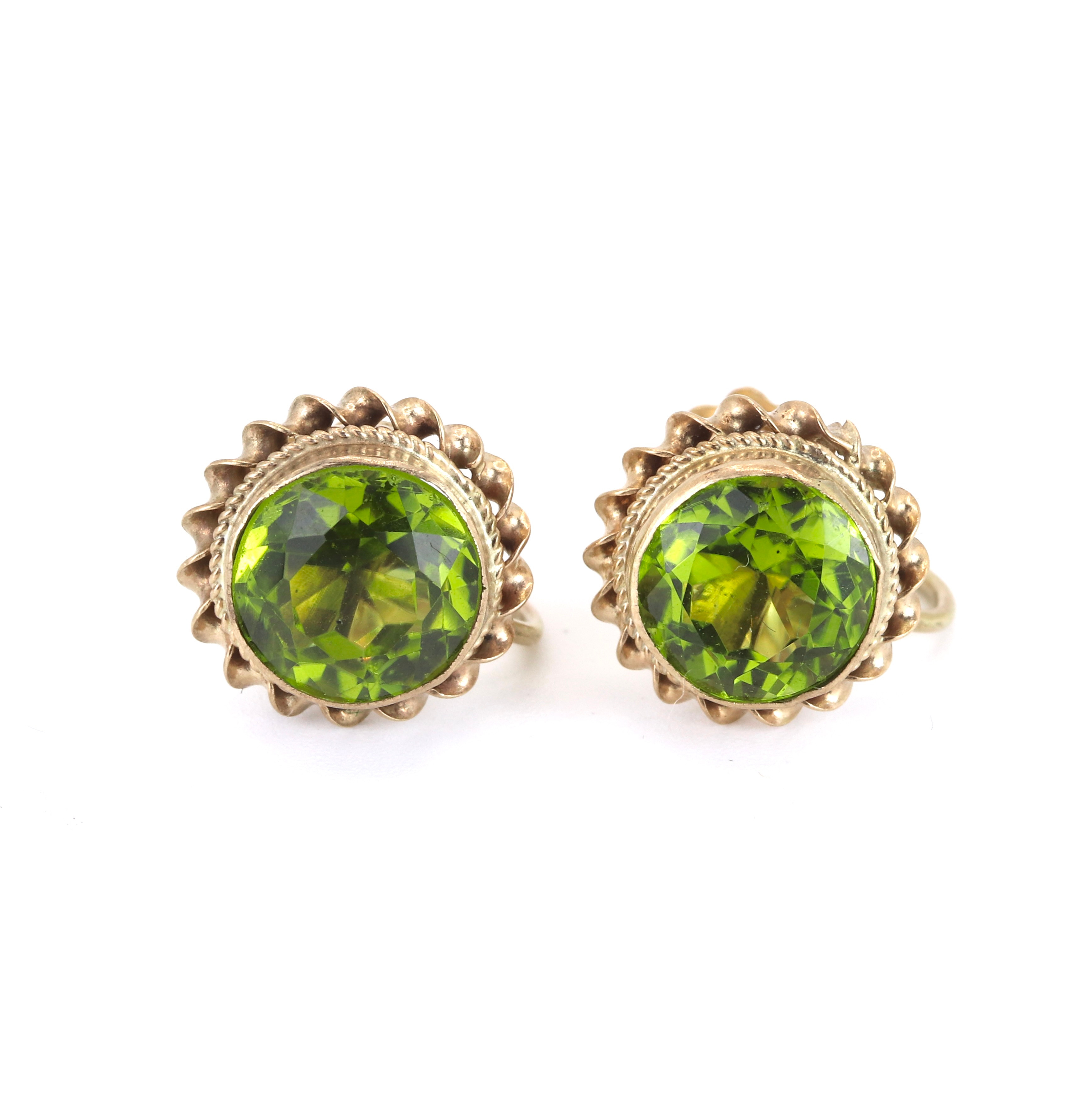 4923956. 9 KARAT GULT GULD PERIDOTSÆT MED STIFTØRERINGE.