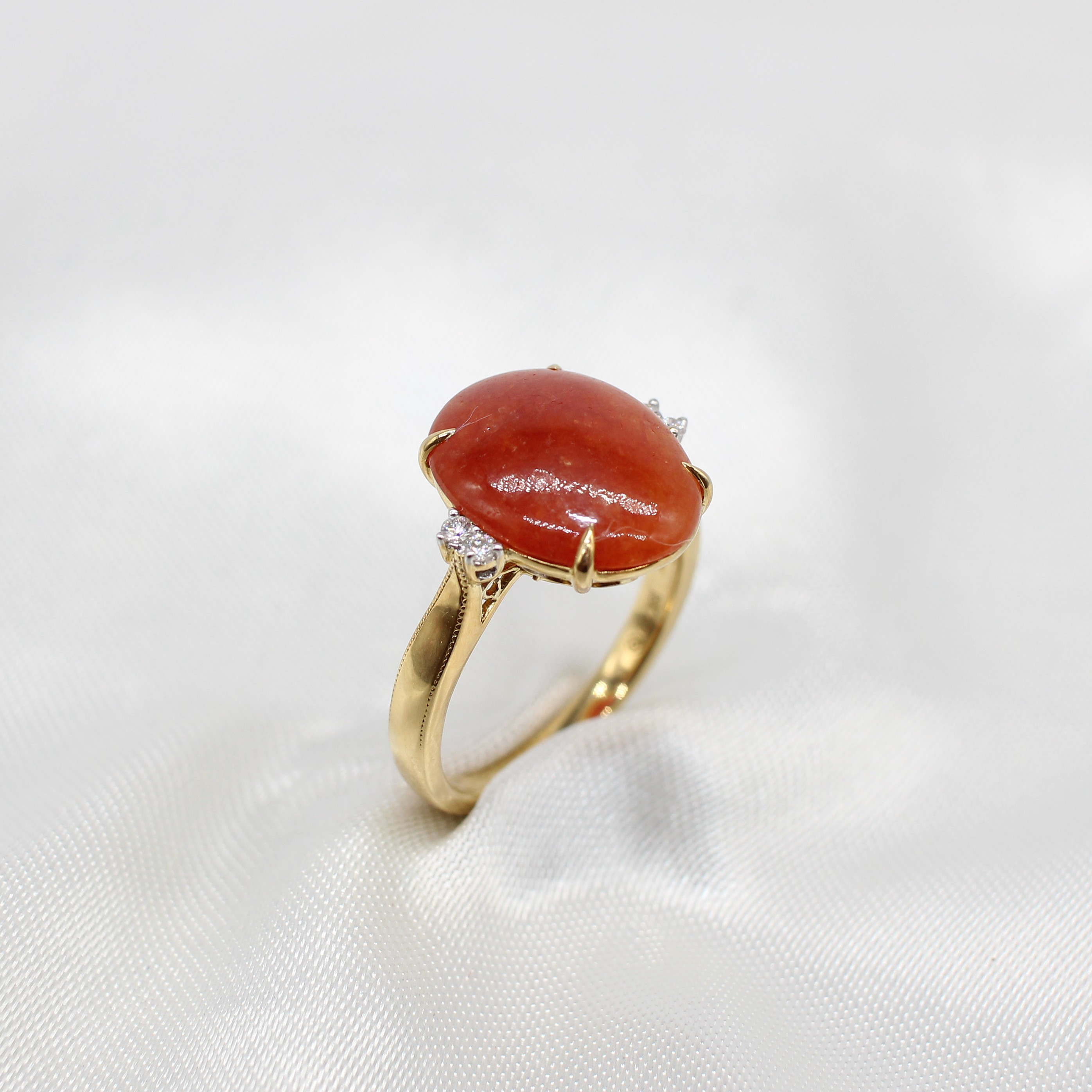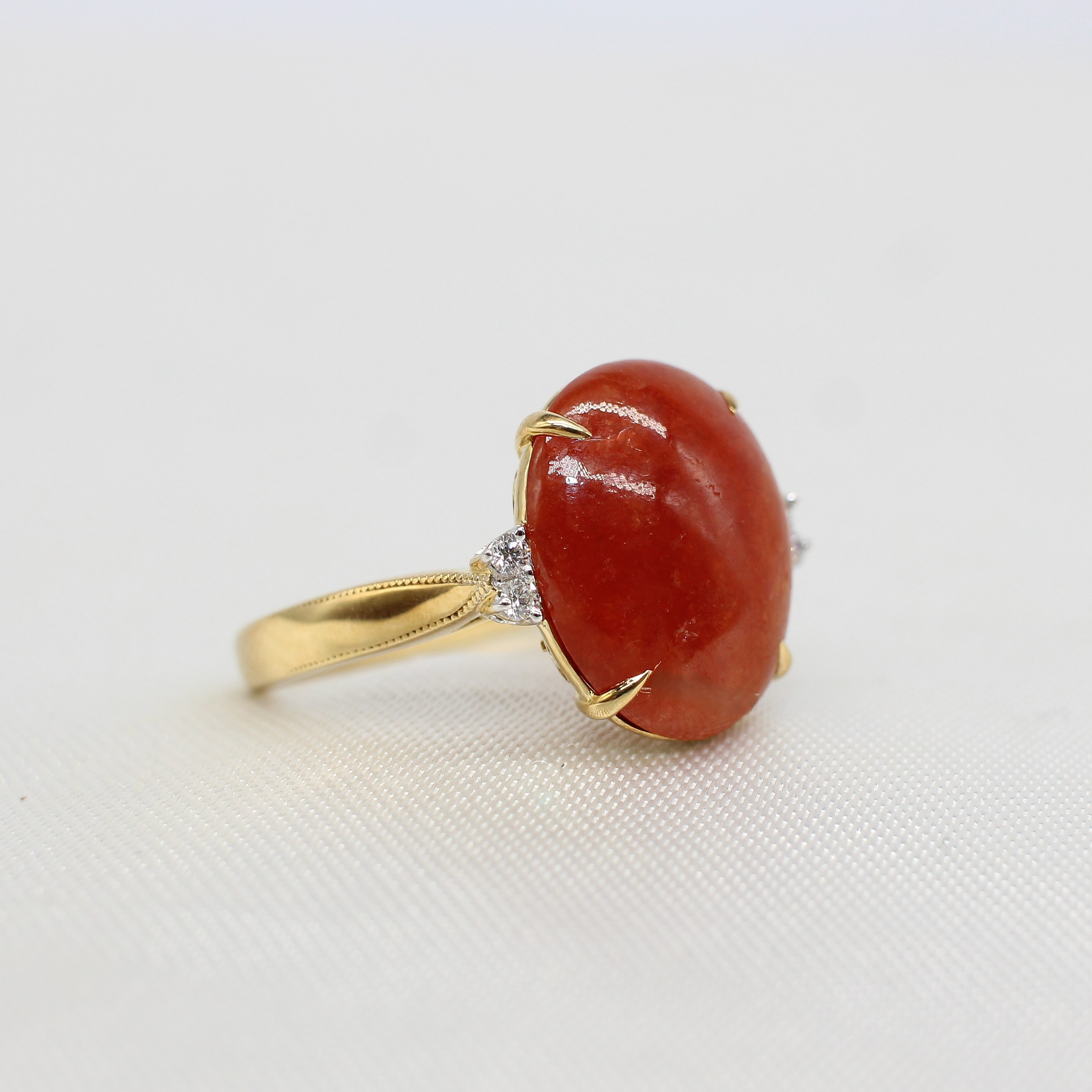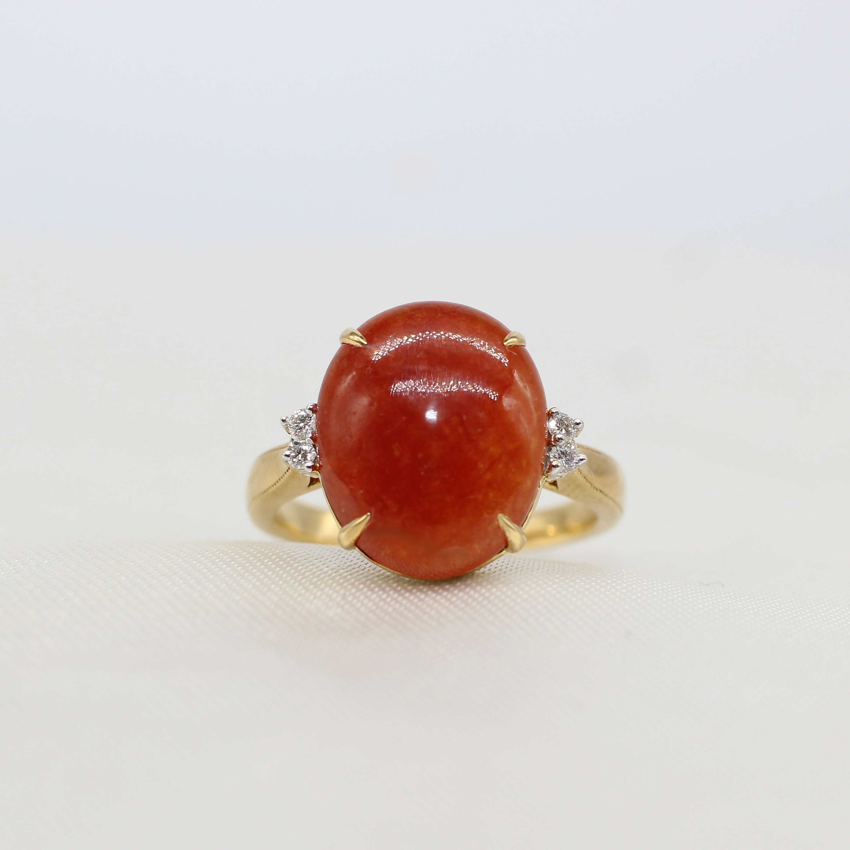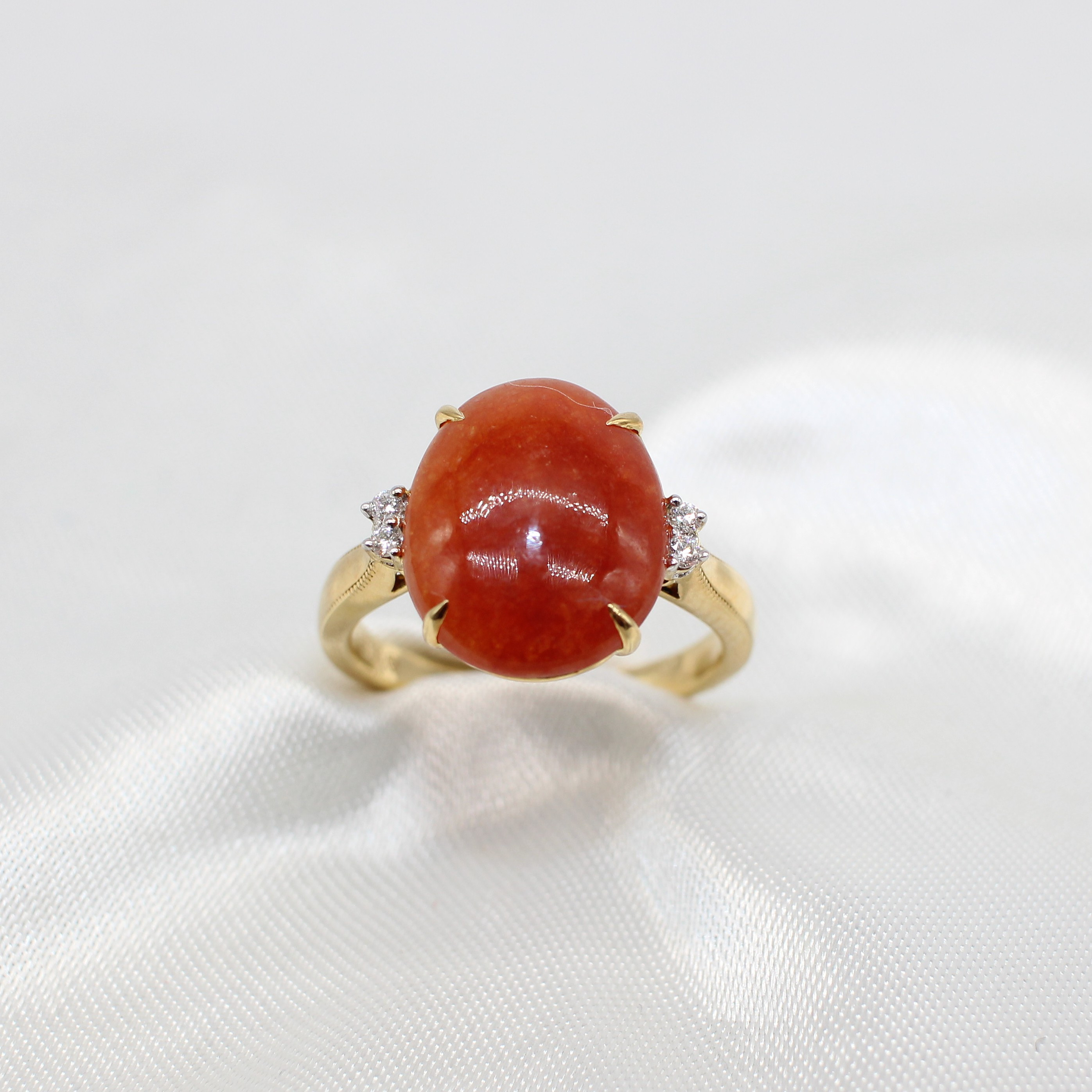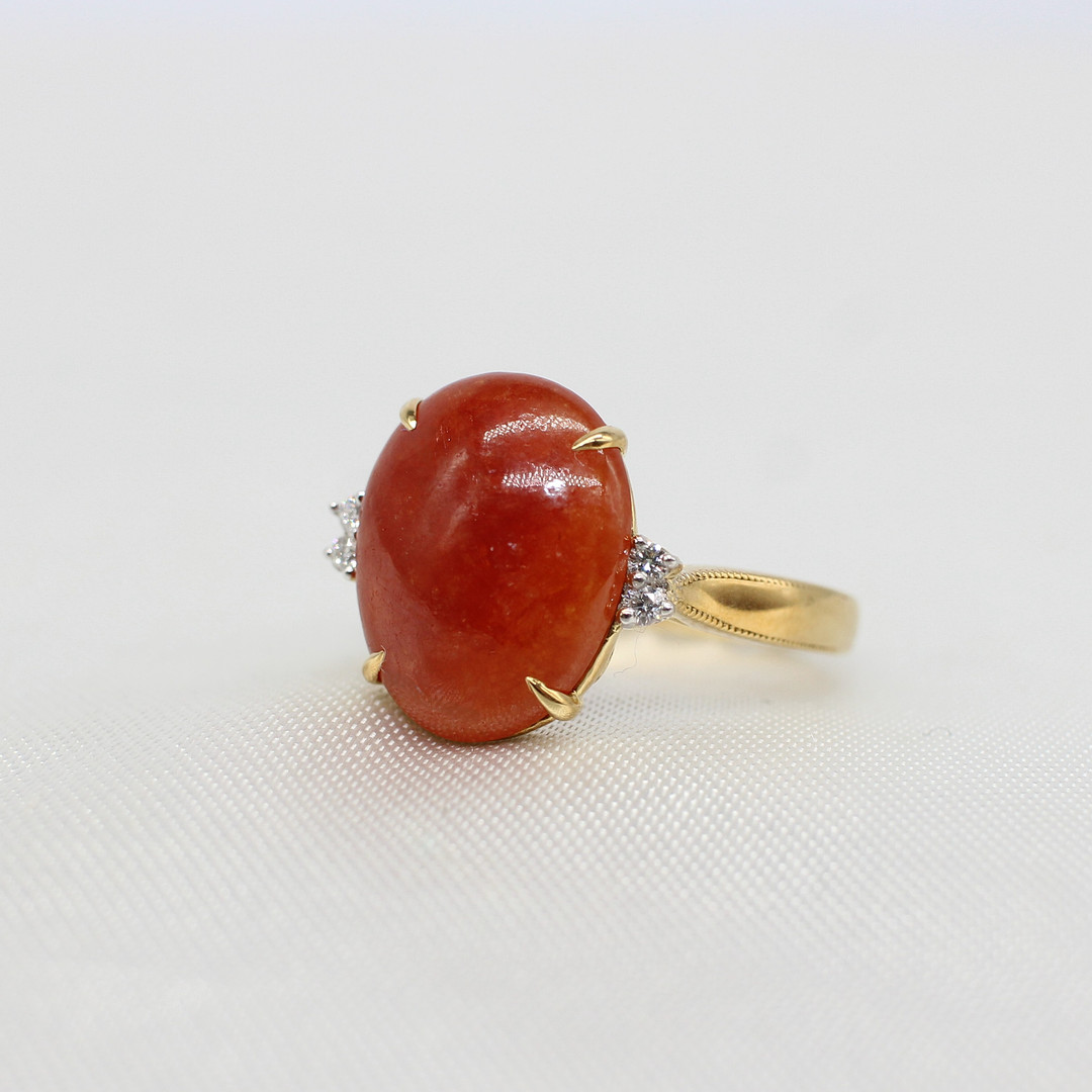 4927413. USÆDVANLIG 18K KARNELIAN- & DIAMANT-RING.