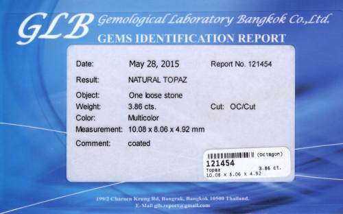 492938. TOPAZ 3.86CT. Regnbue, certifikat.