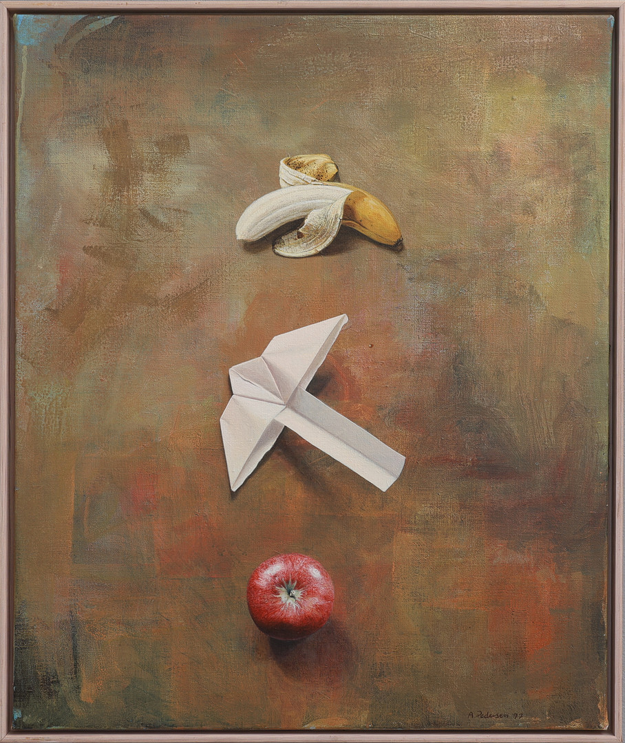 4938045. ANDERS PEDERSEN. SAMMENSÆTNING MED BANAN, ÆBLE SAMT PAPIRPLAN.