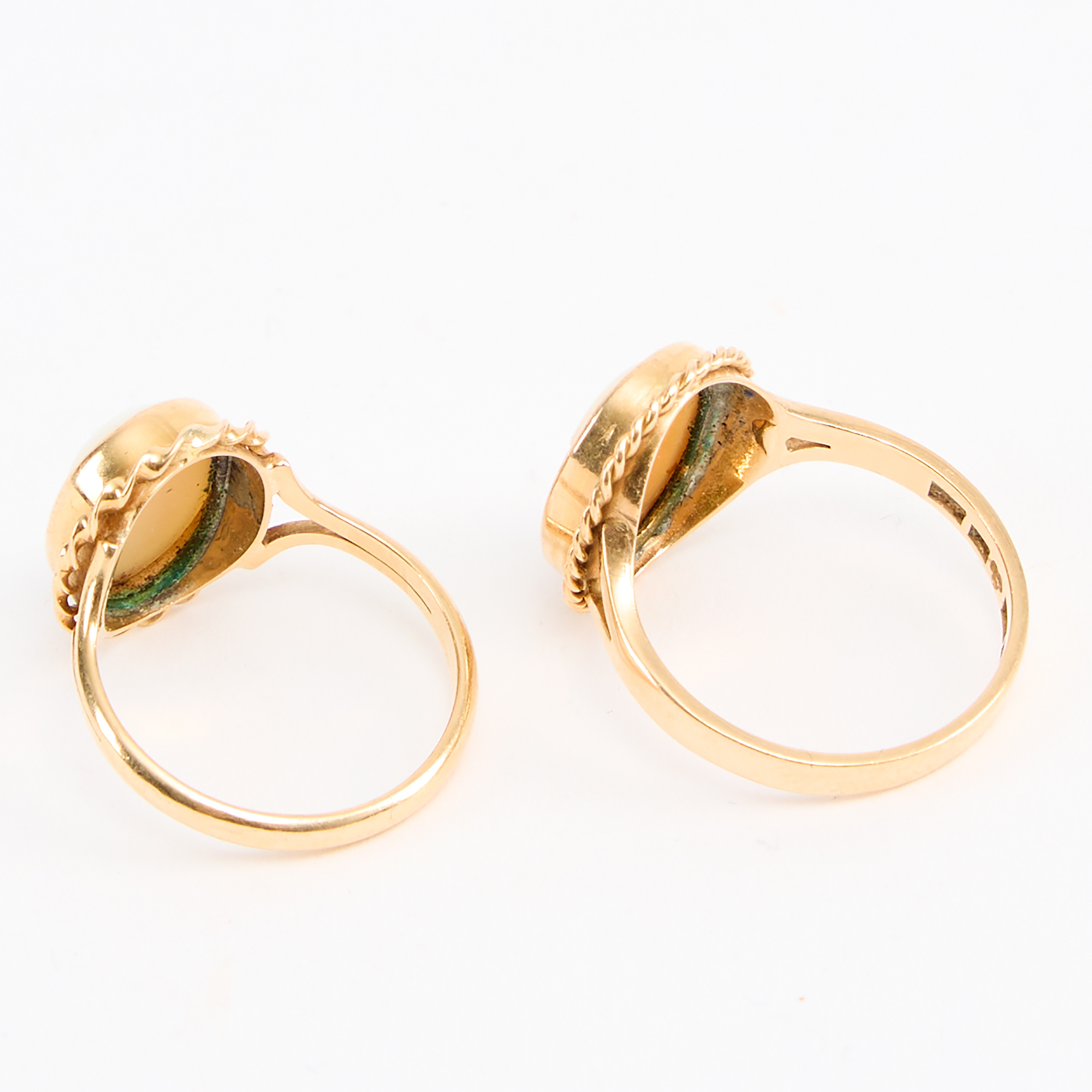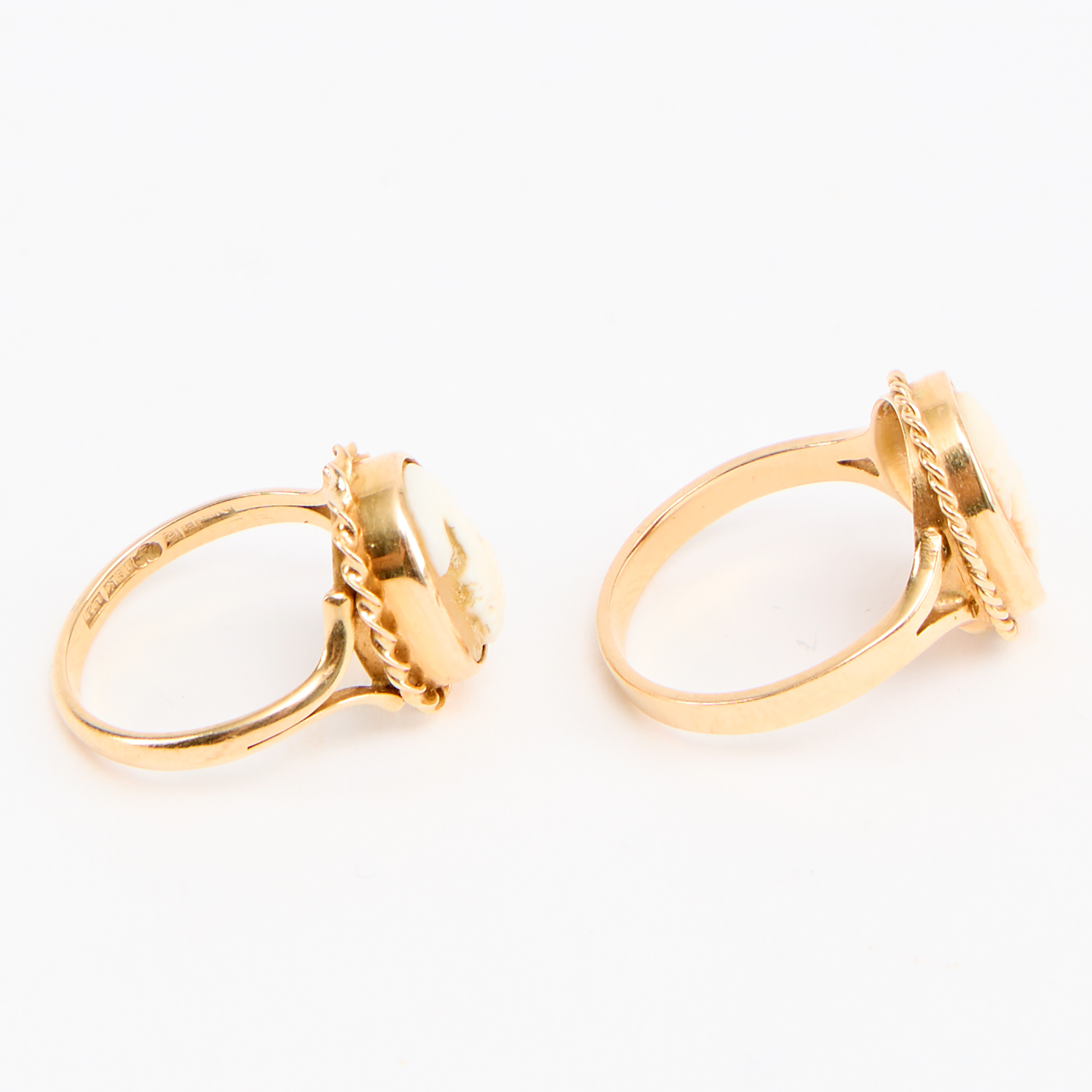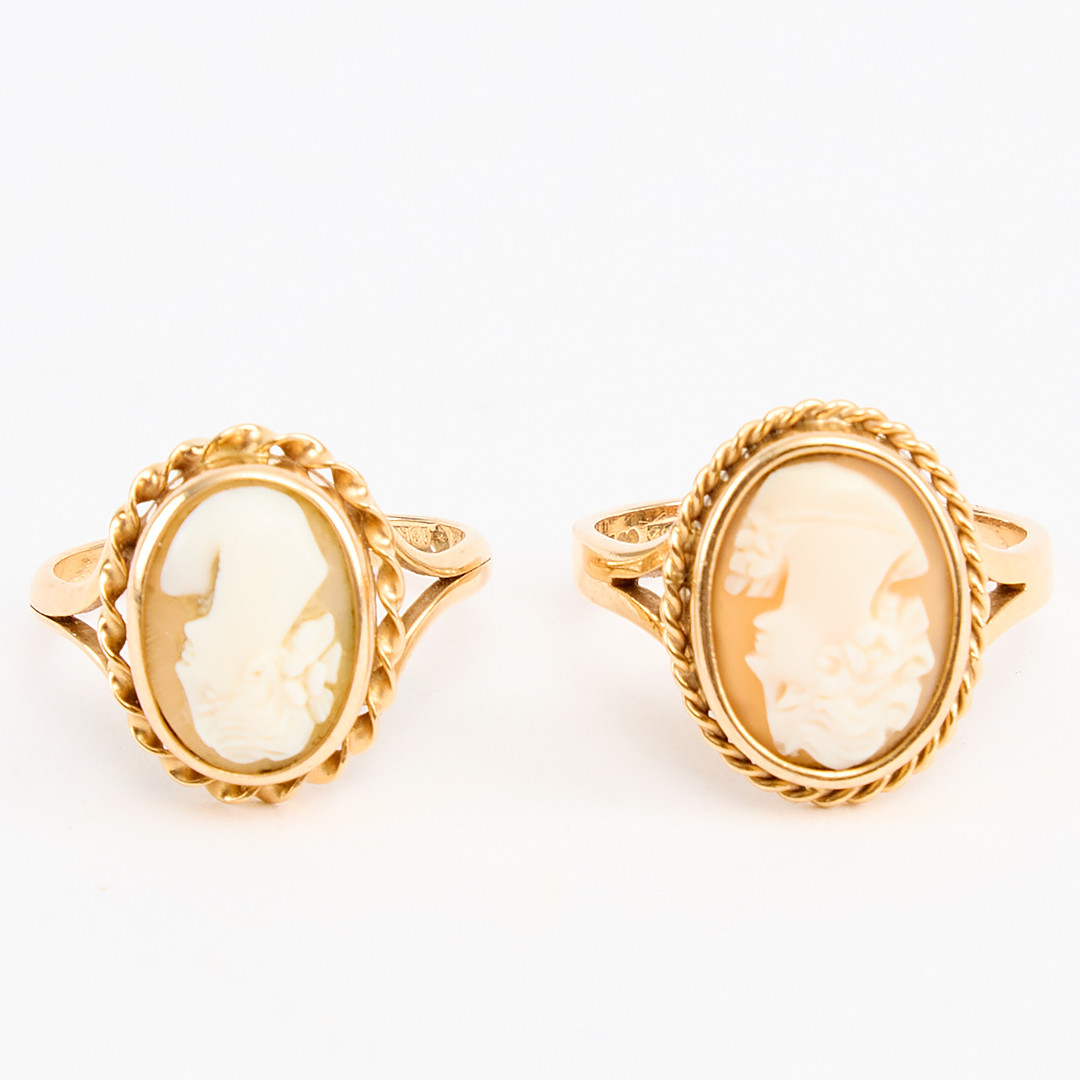 4956764. RINGE, to stk., guld 18K og caméer.