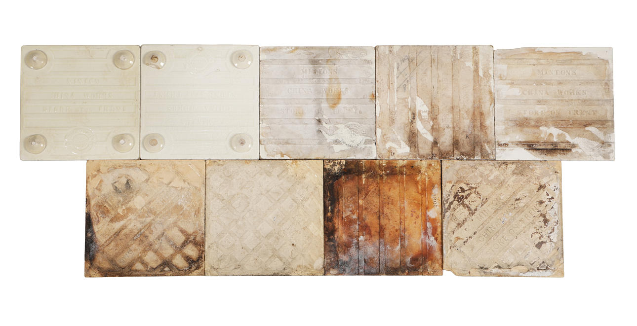 Inkluderer seks fliser designet af William Wise fra serierne „Country Life“ og „Animals of the Farm“, en flise, der viser hjørnet af Cowgate & St. Mary's Street Edinburgh, to Minton trivetfliser fra serien „European Views“, „Boppart on the Rhine“ og „Rodez Cathedral“, alle 15,5 cm brede, 15,5 cm høje (9).