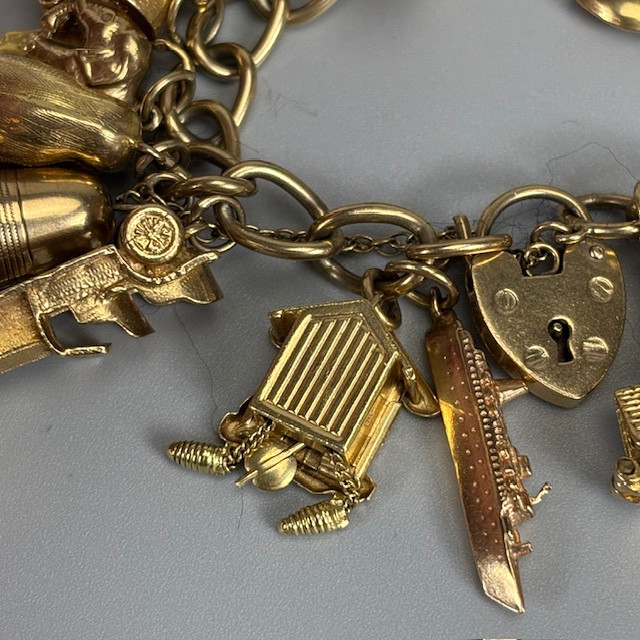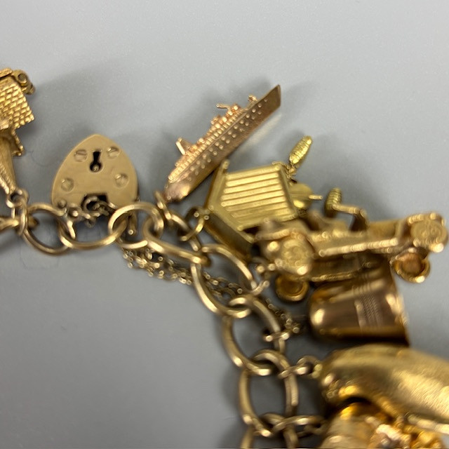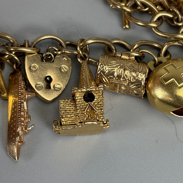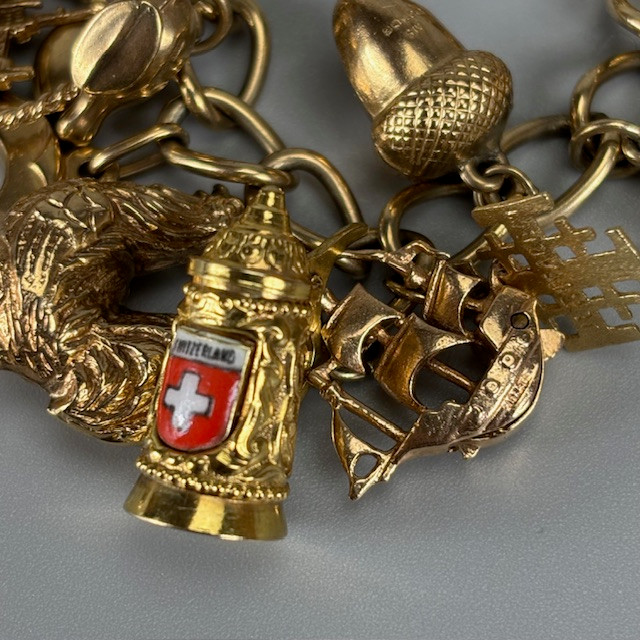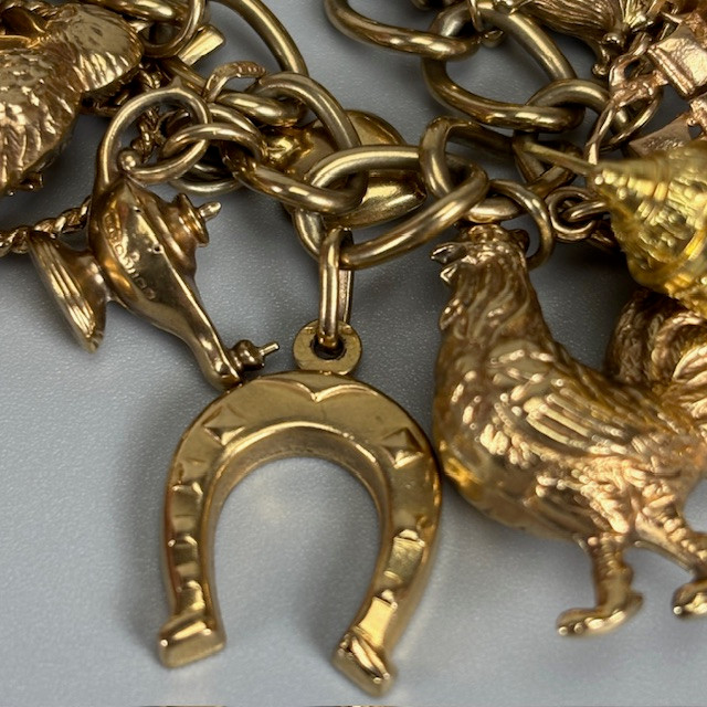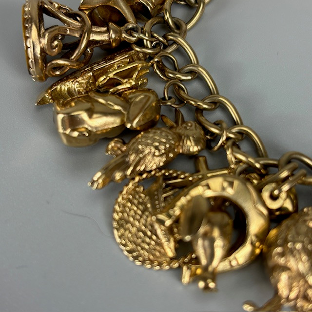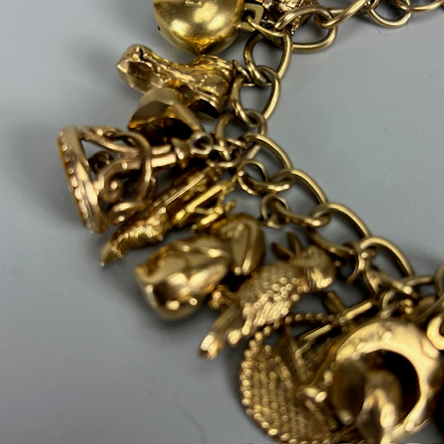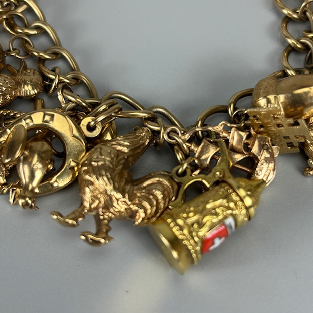 4970274. 9KT GULD CHARMEARMBÅND MED CHARMS.