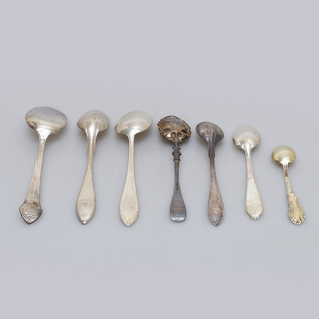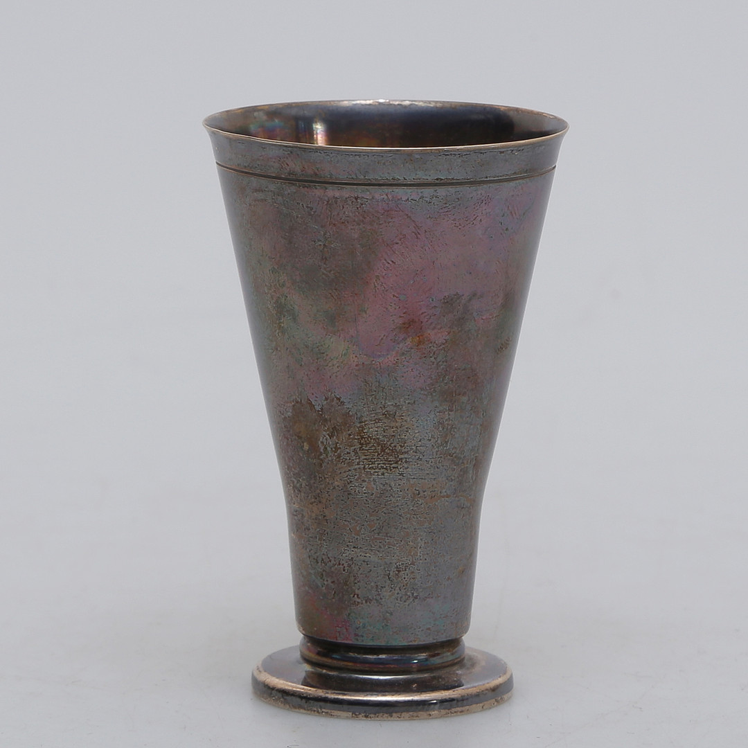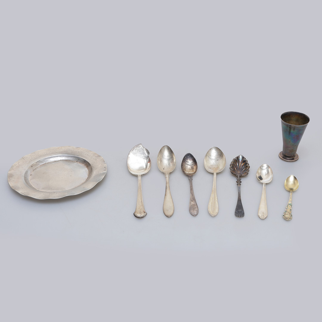 4971444. 9 STYKKER SØLV, UNDERKOP, BÆGER, SKEER.