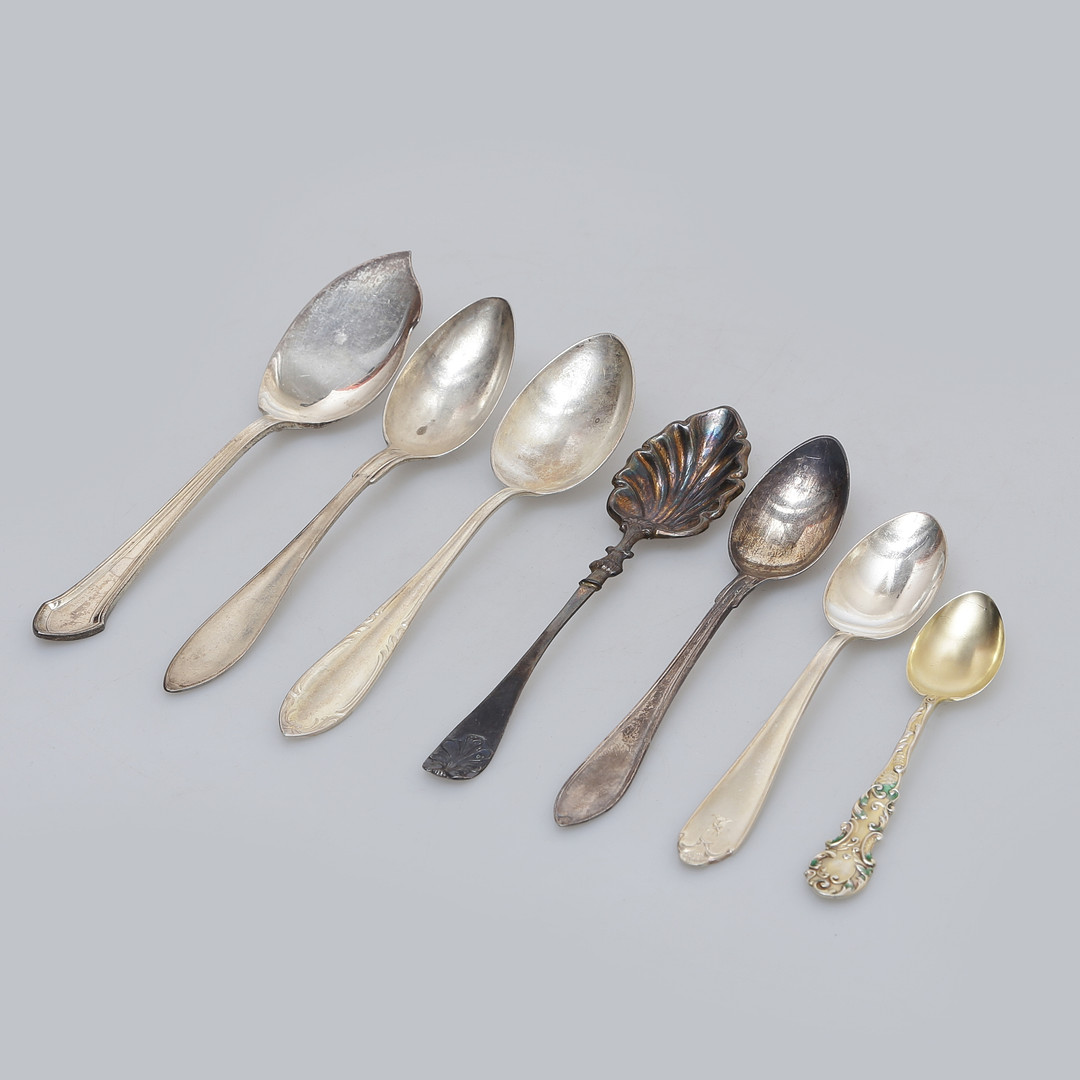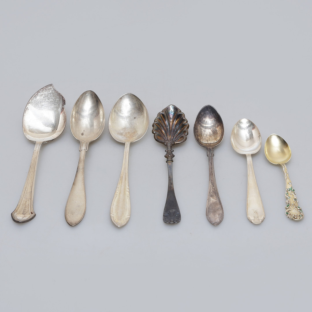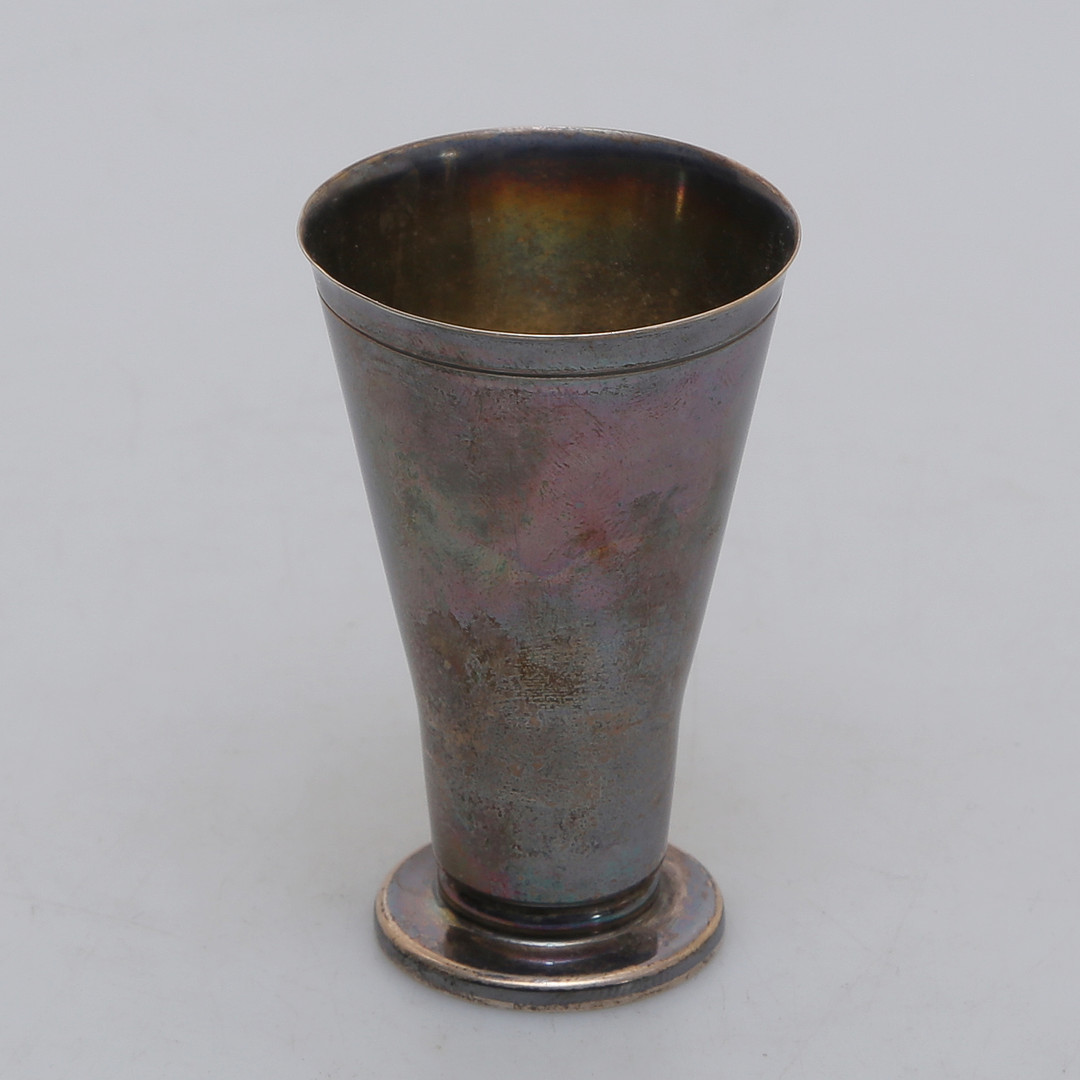 4971444. 9 STYKKER SØLV, UNDERKOP, BÆGER, SKEER.