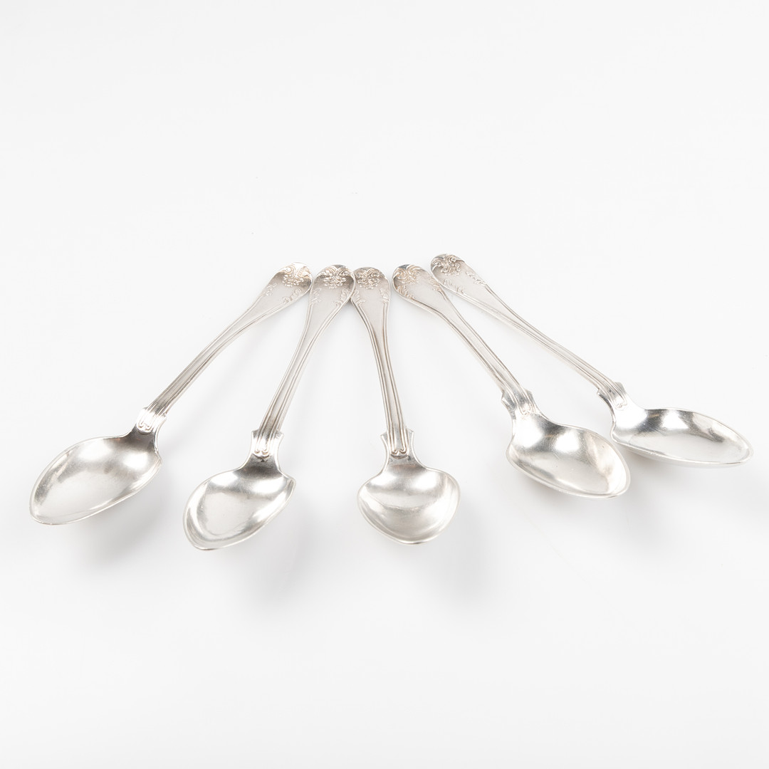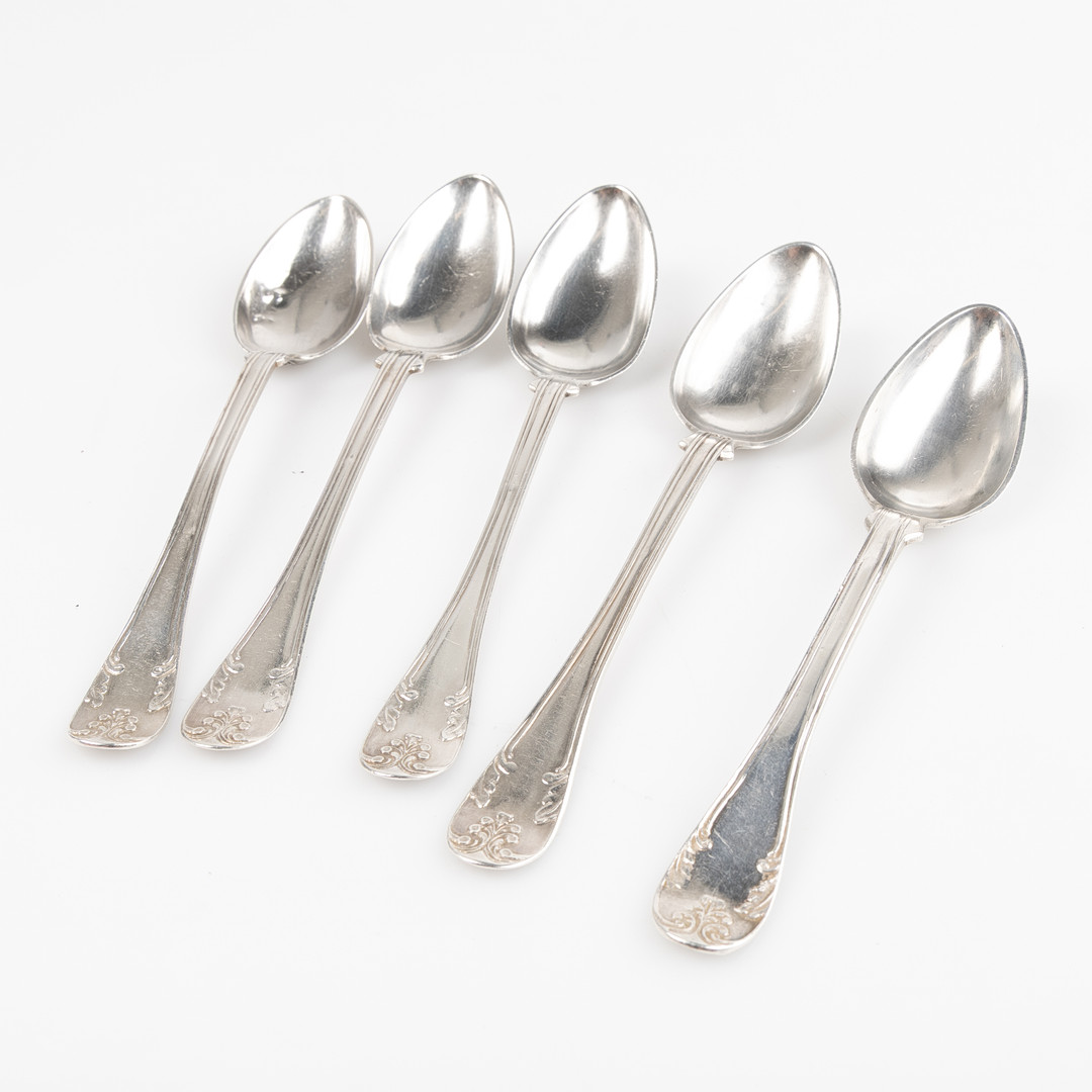 4980807. TESKEFULDE, 5 stk. sølv, stemplet 1875-1877.