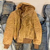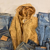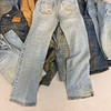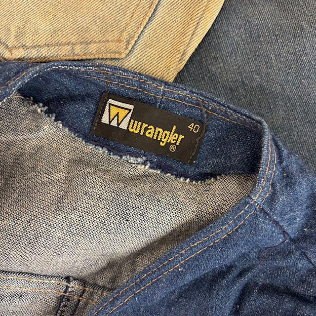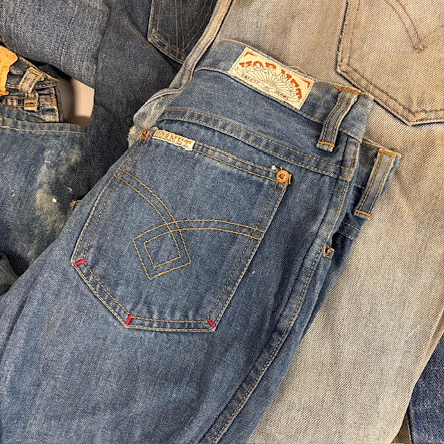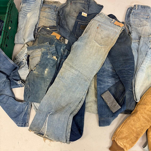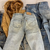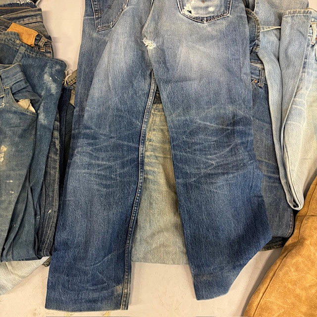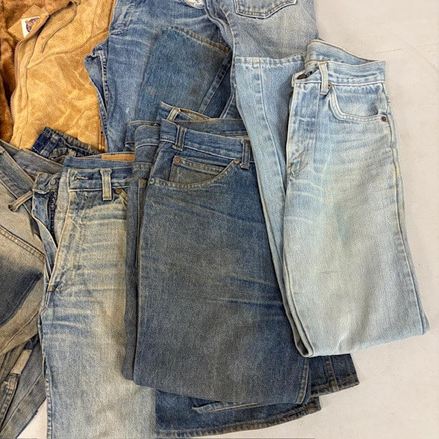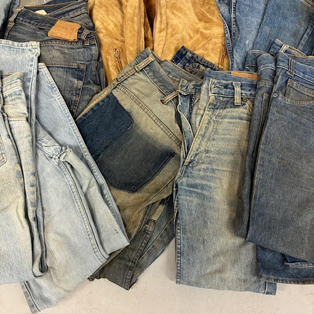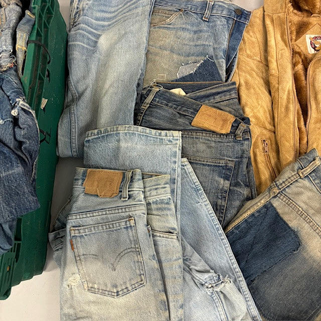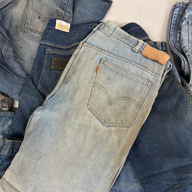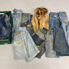 Mængde af slidte denim jeans og toppe, størstedelen Levi Red og Orange Tab fra 1970'erne og 80'erne, forskellige størrelser, 22 par jeans, en skjorte, 2 taljefrakker sammen med en bomberjakke med hætte i ruskind fra 1980'erne.