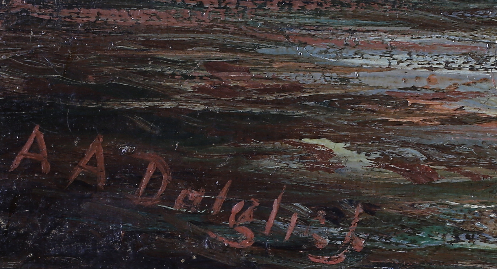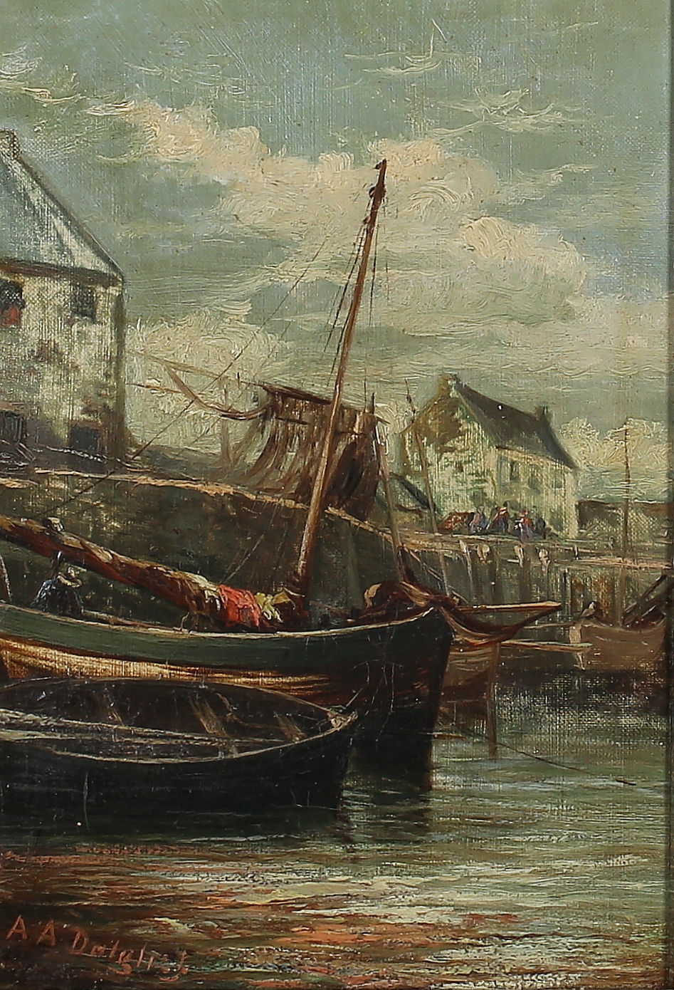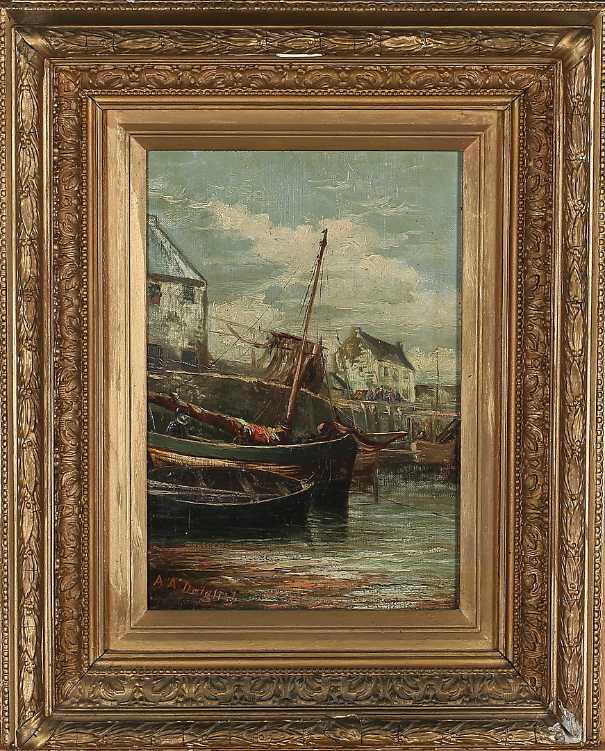 499462. ANDREW ADIE DALGLISH. (akt.1867-1904) Fiskerihavn, olie på lærred, sign.