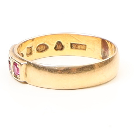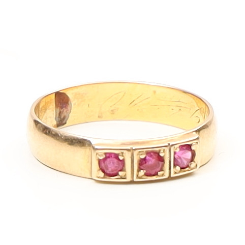 4996422. RING, 18k, med 3 indsatte røde dekorer.