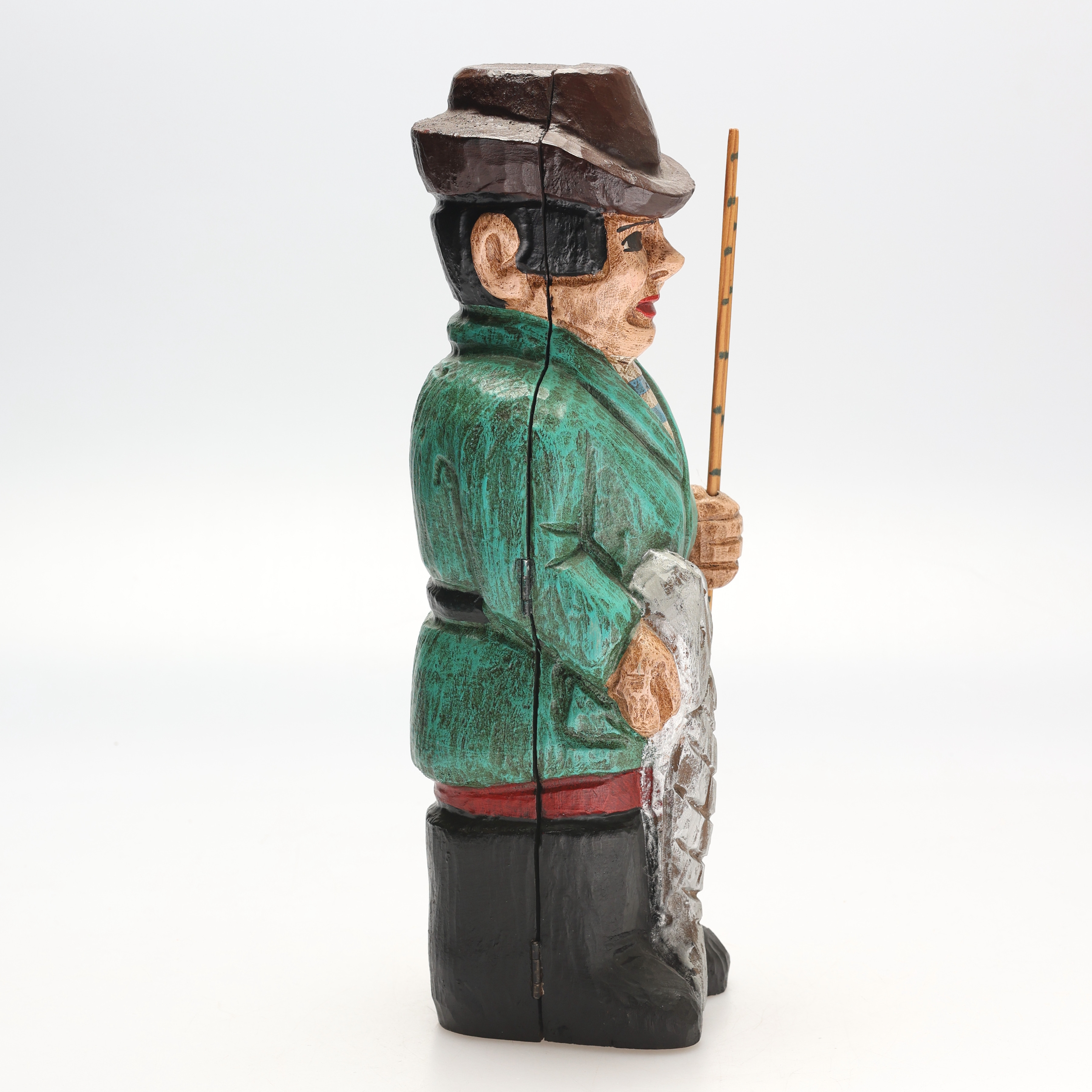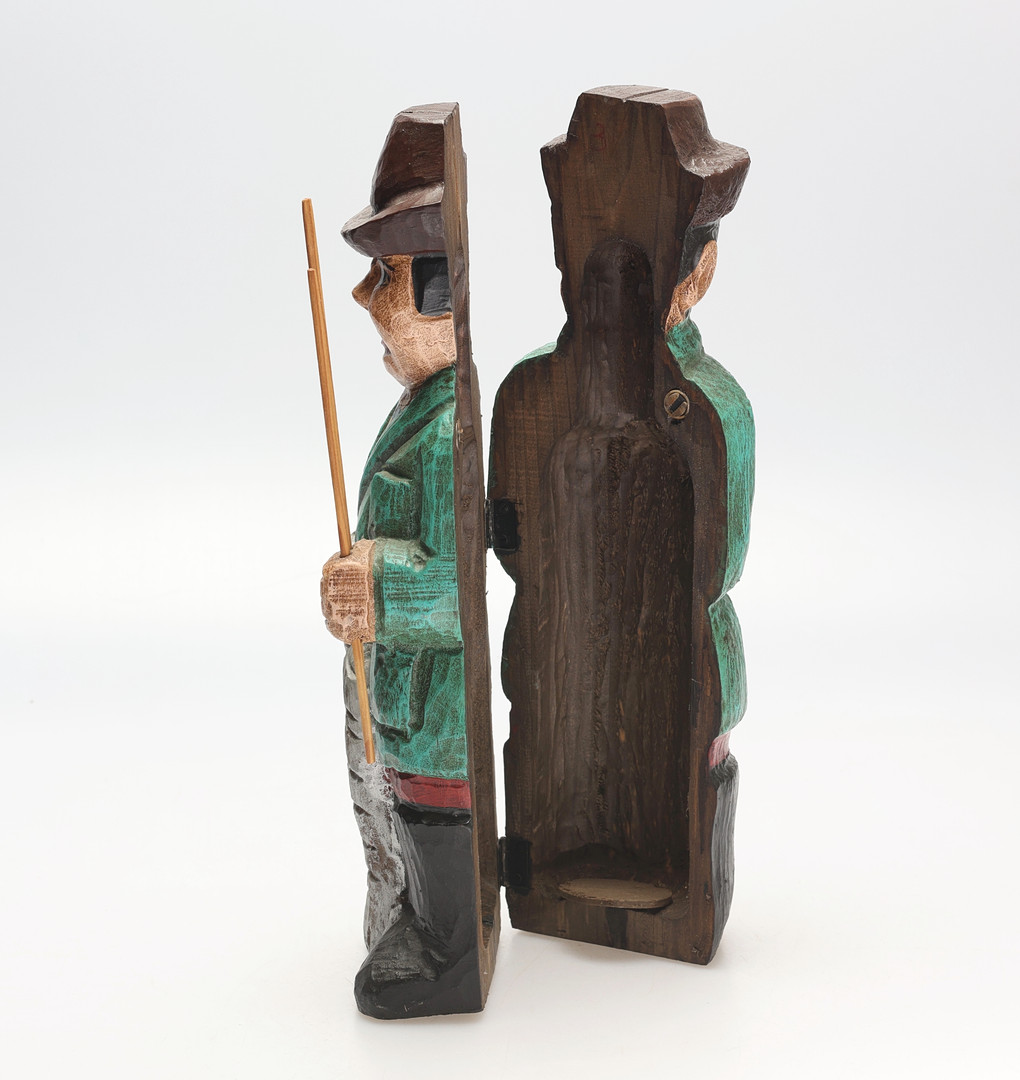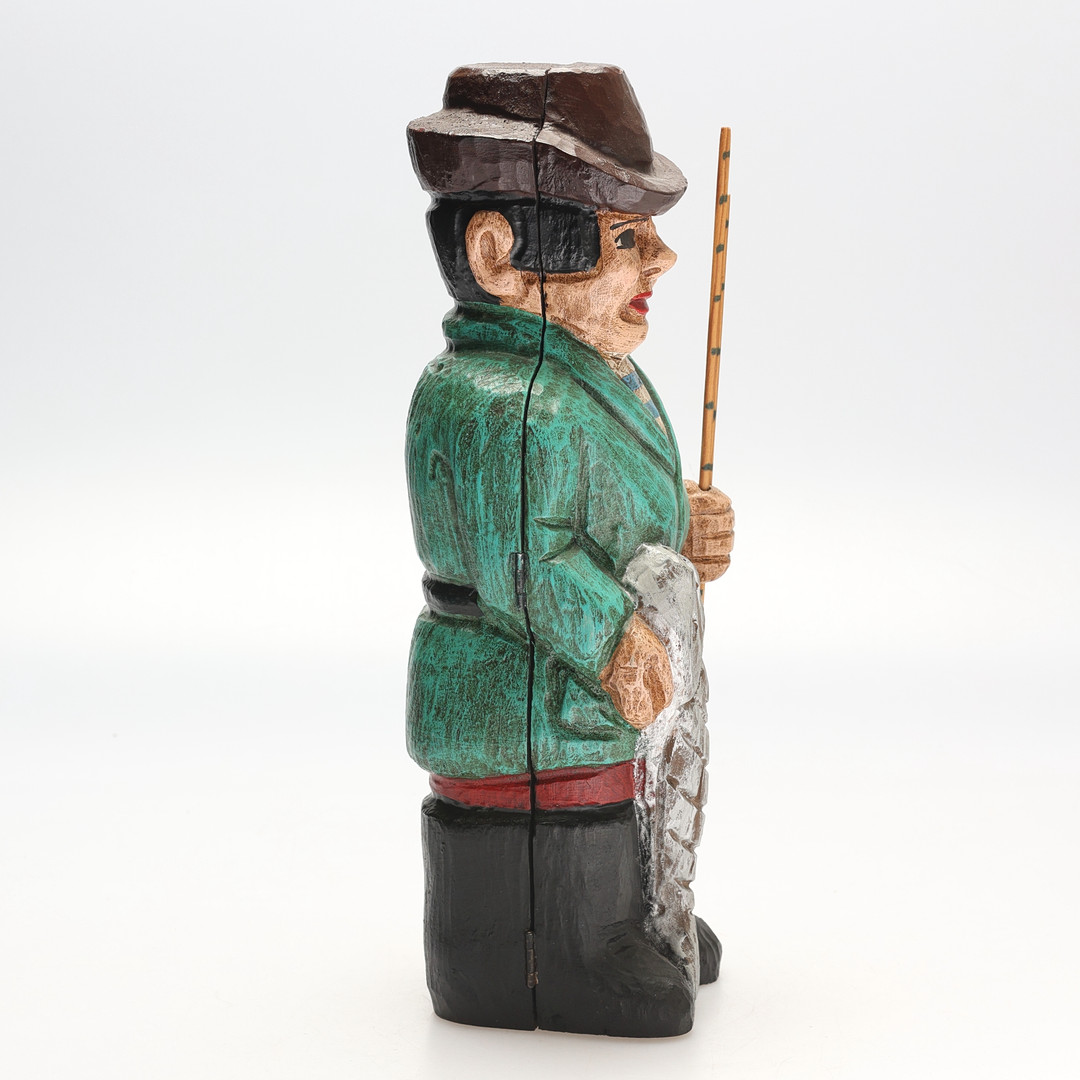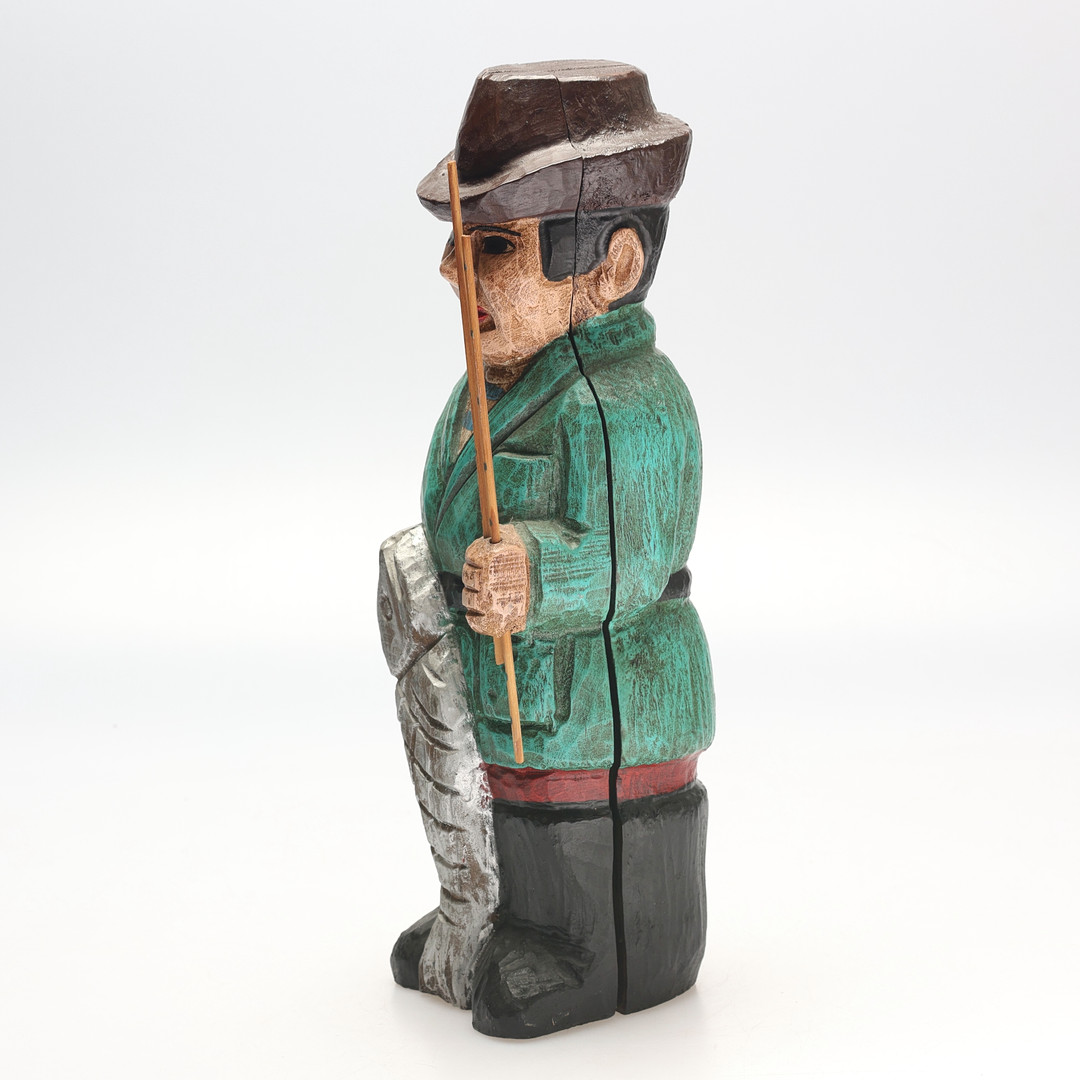 5000419. FLASKEHUD. Træ, der skildrer en fisker.