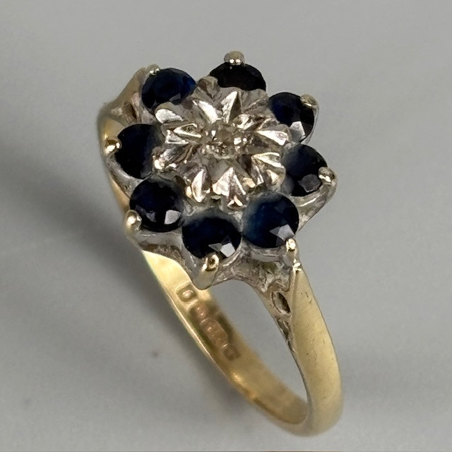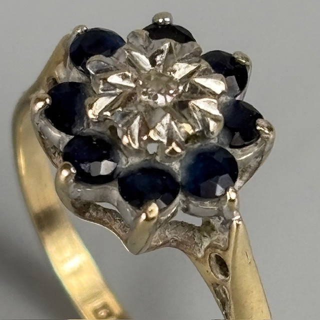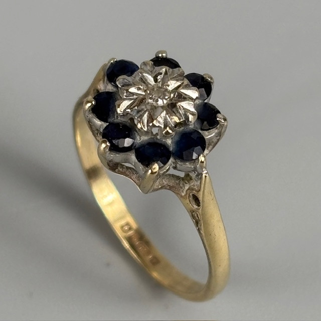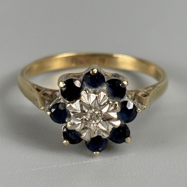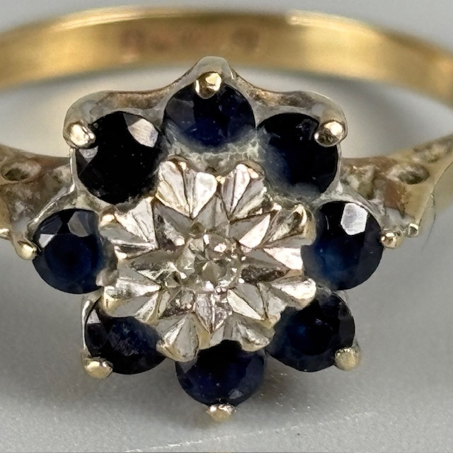 5007721. 9KT GULD SAFIR OG DIAMANT RING.
