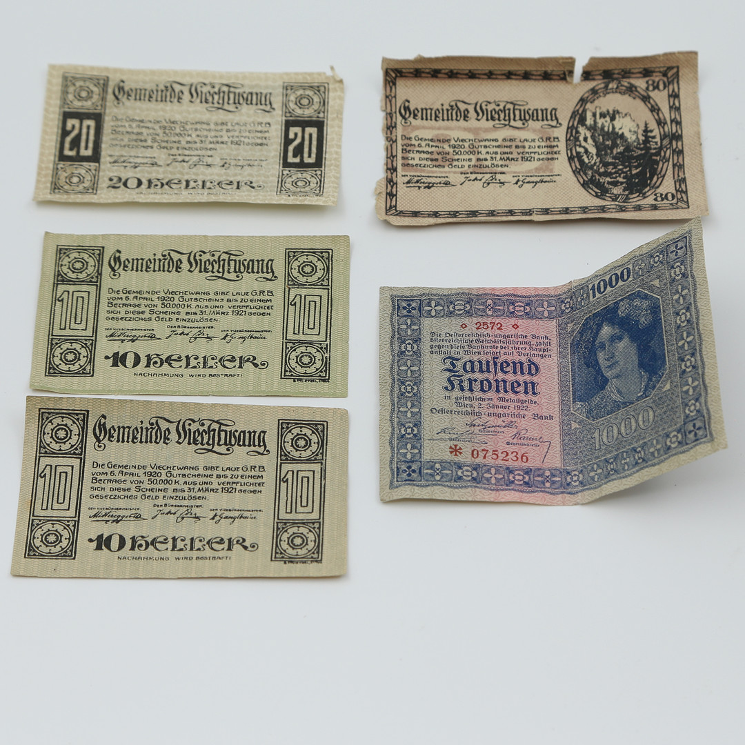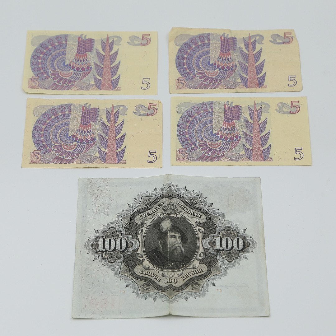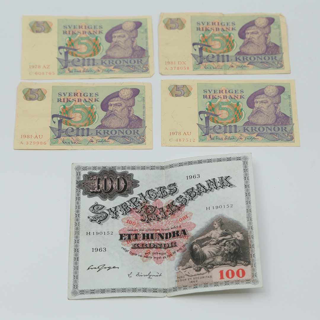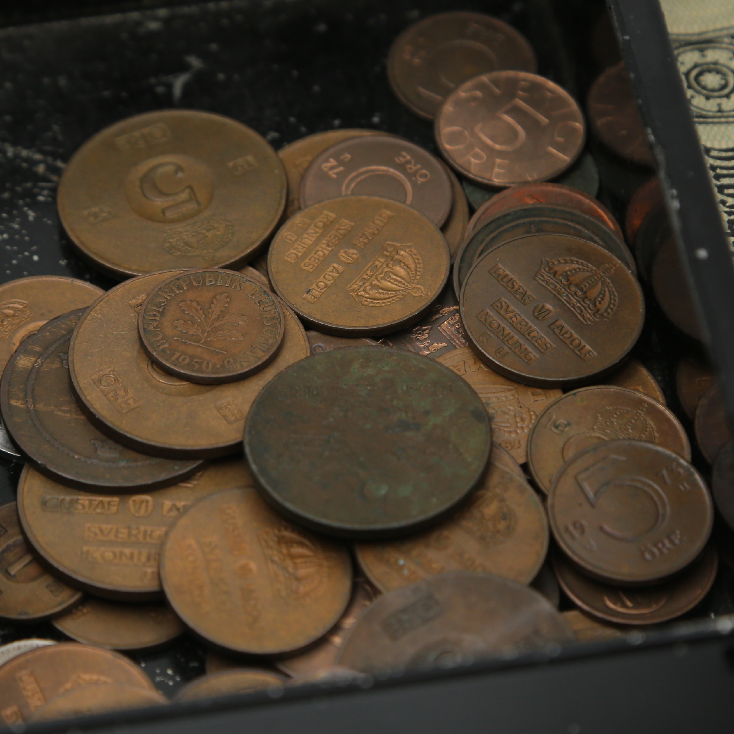 5008905. PENGESEDLER OG MØNTER I TINKASSER.