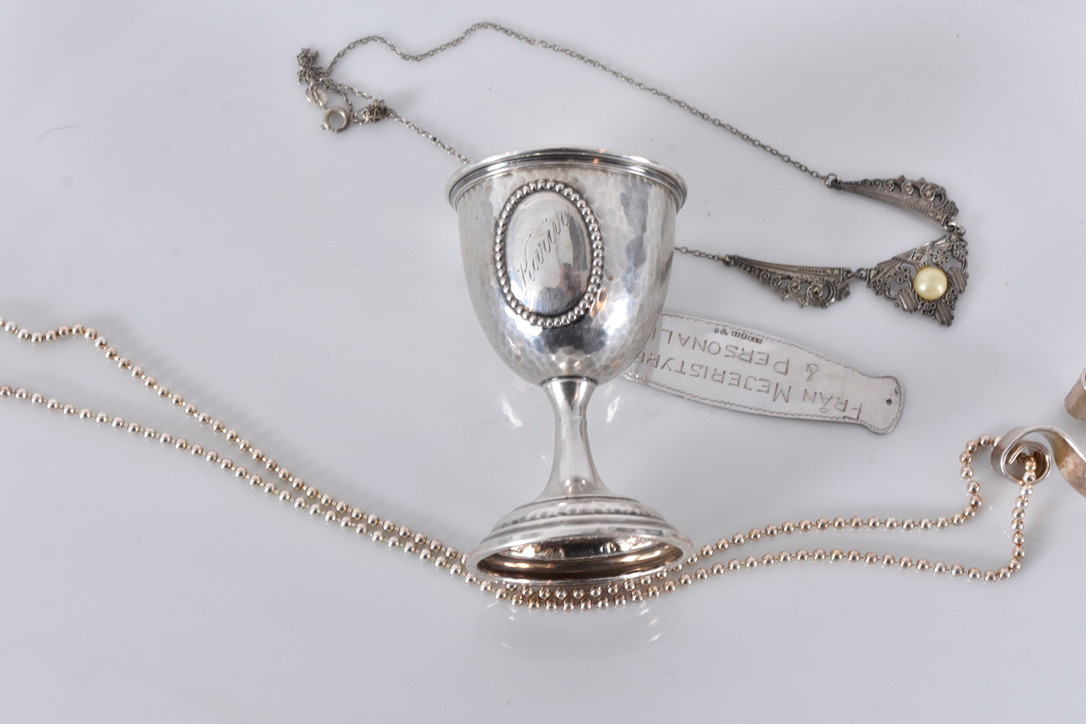 5009416. LOT SILVER; æggebæger, plak og smykker.