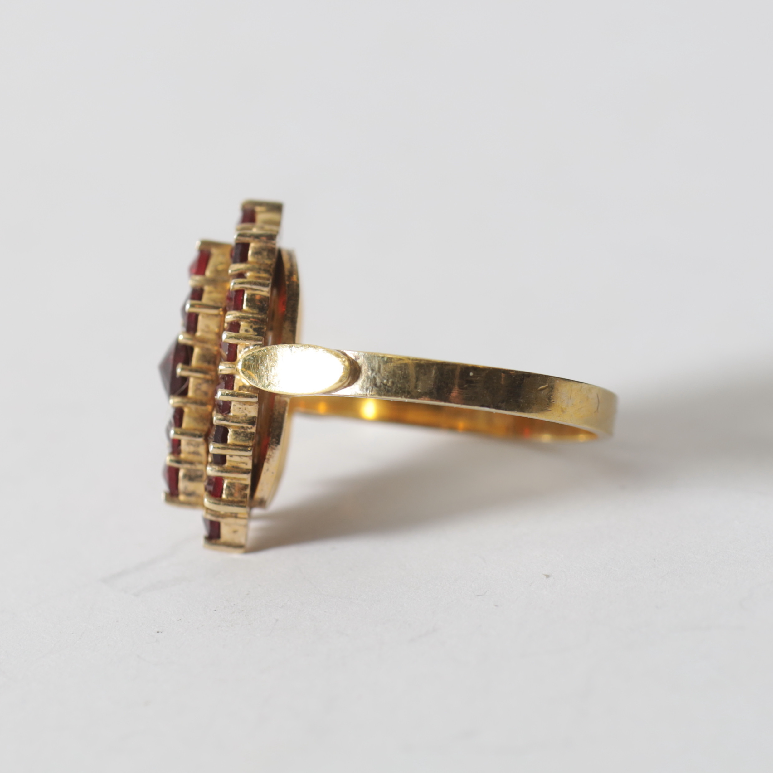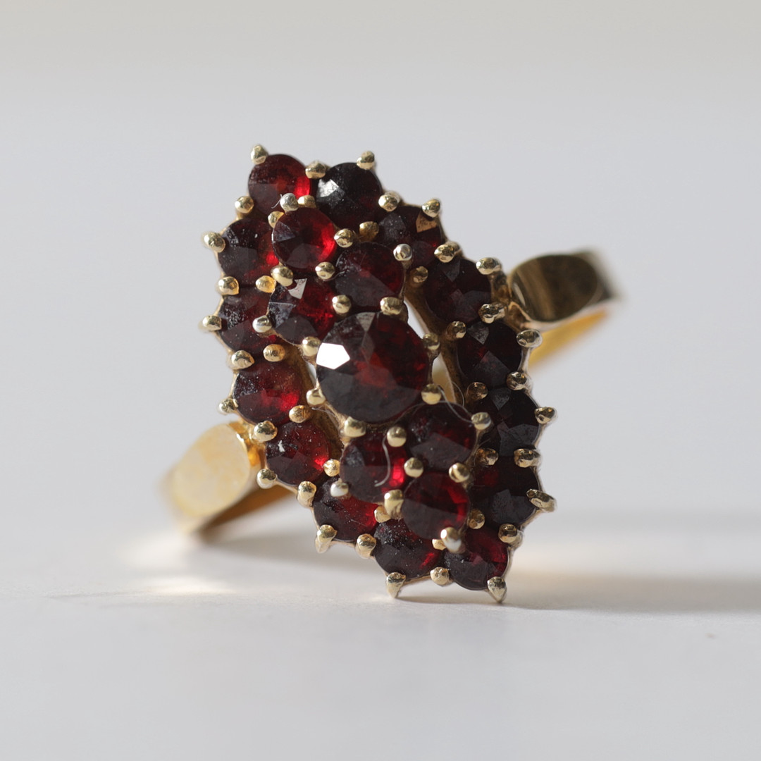 5010447. RING, forgyldt sølv & granater. Samlet vægt ca. 4,1 gram.