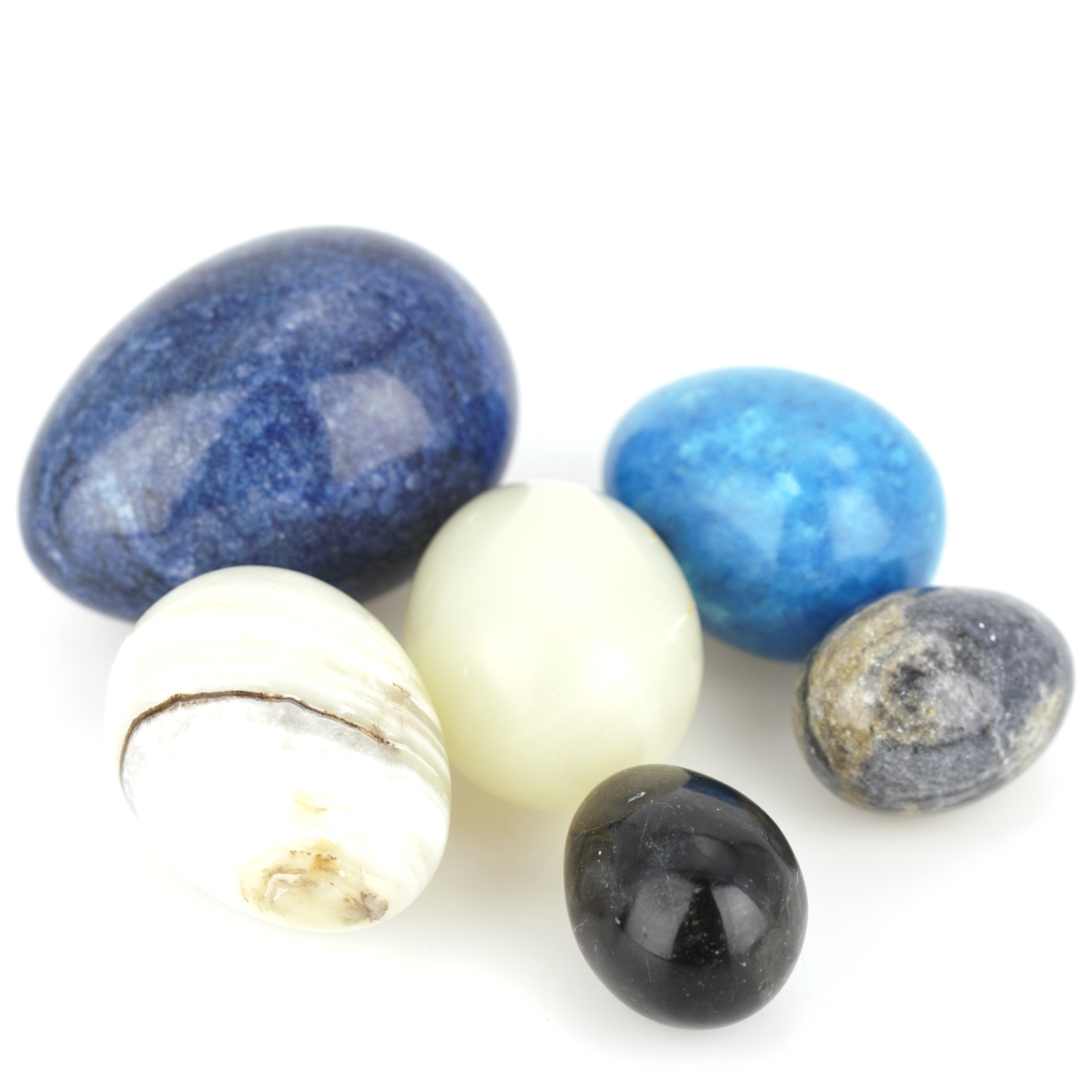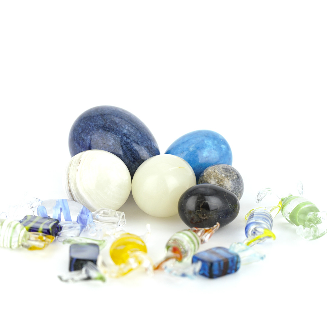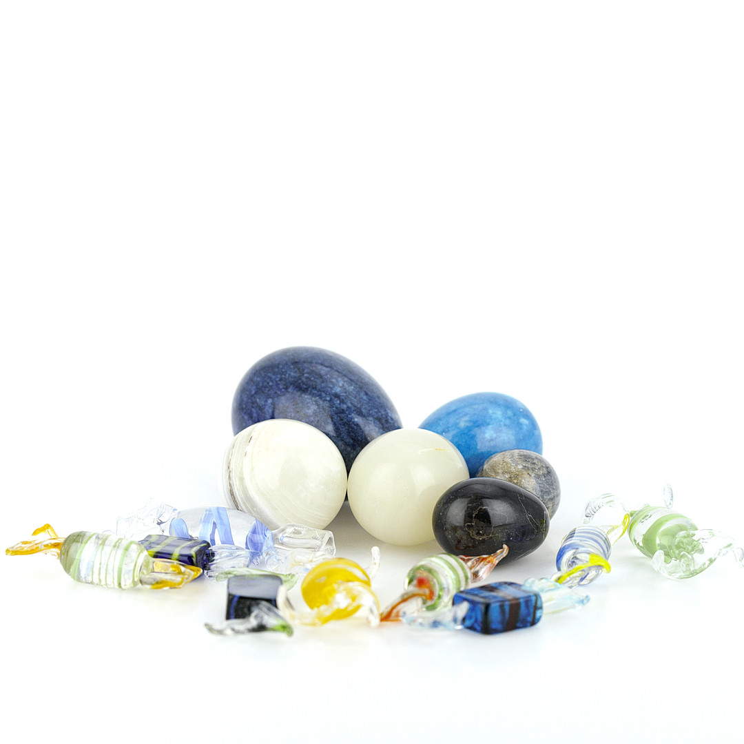5015551. STENÆG og GLASKARAMELLER, 6 + 9 stykker, marmor, sten, glas, moderne.