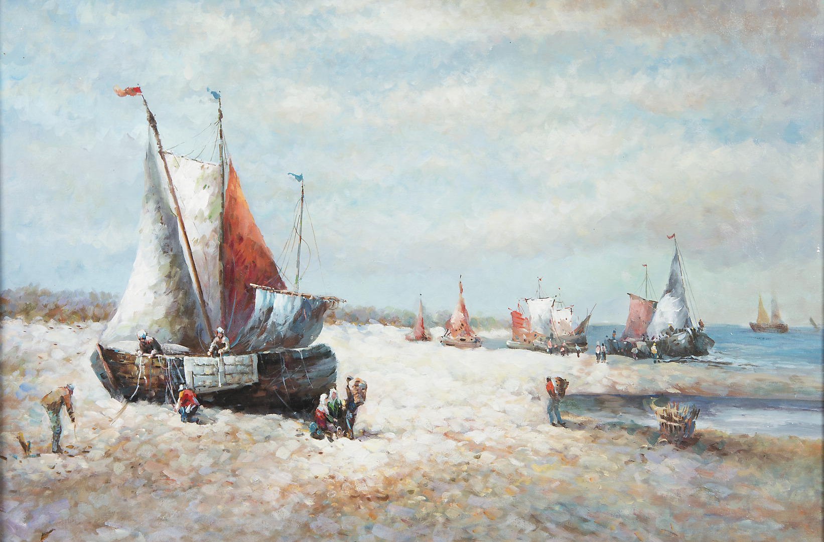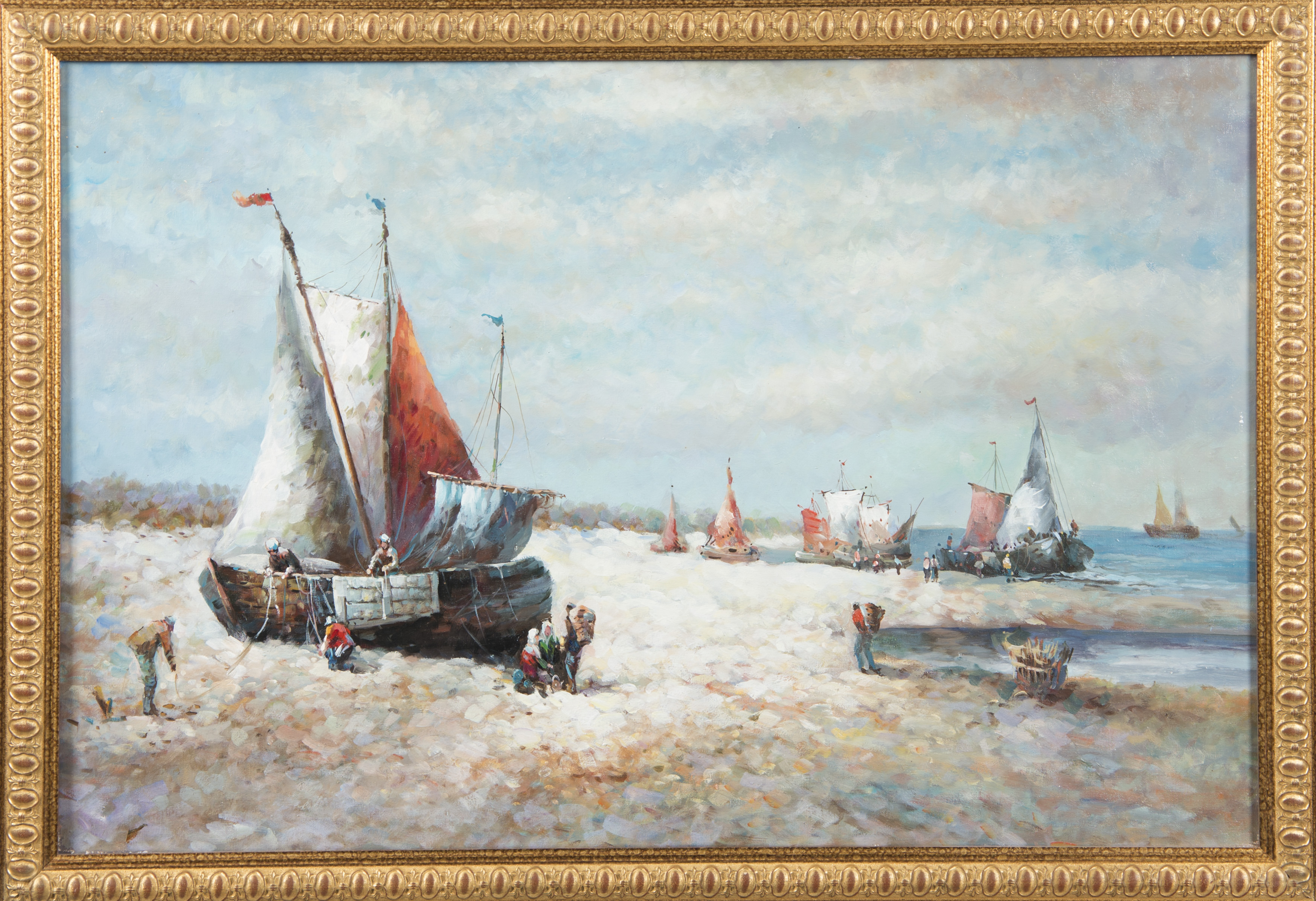 508125. OIDENTIFIERAD KONSTNÄR. Både ved lavvande, malet print, usigneret.