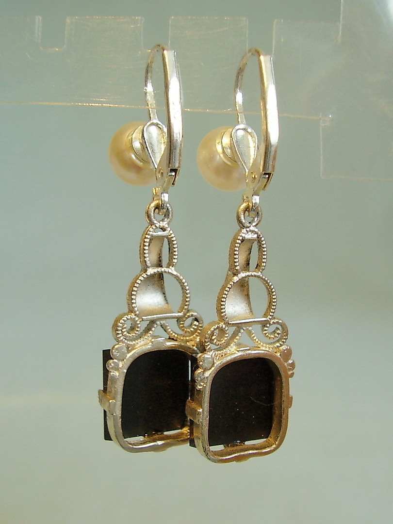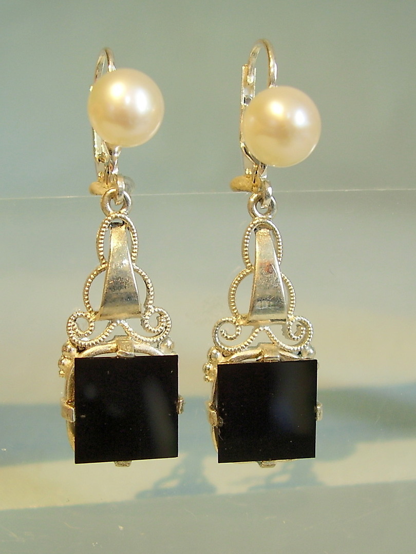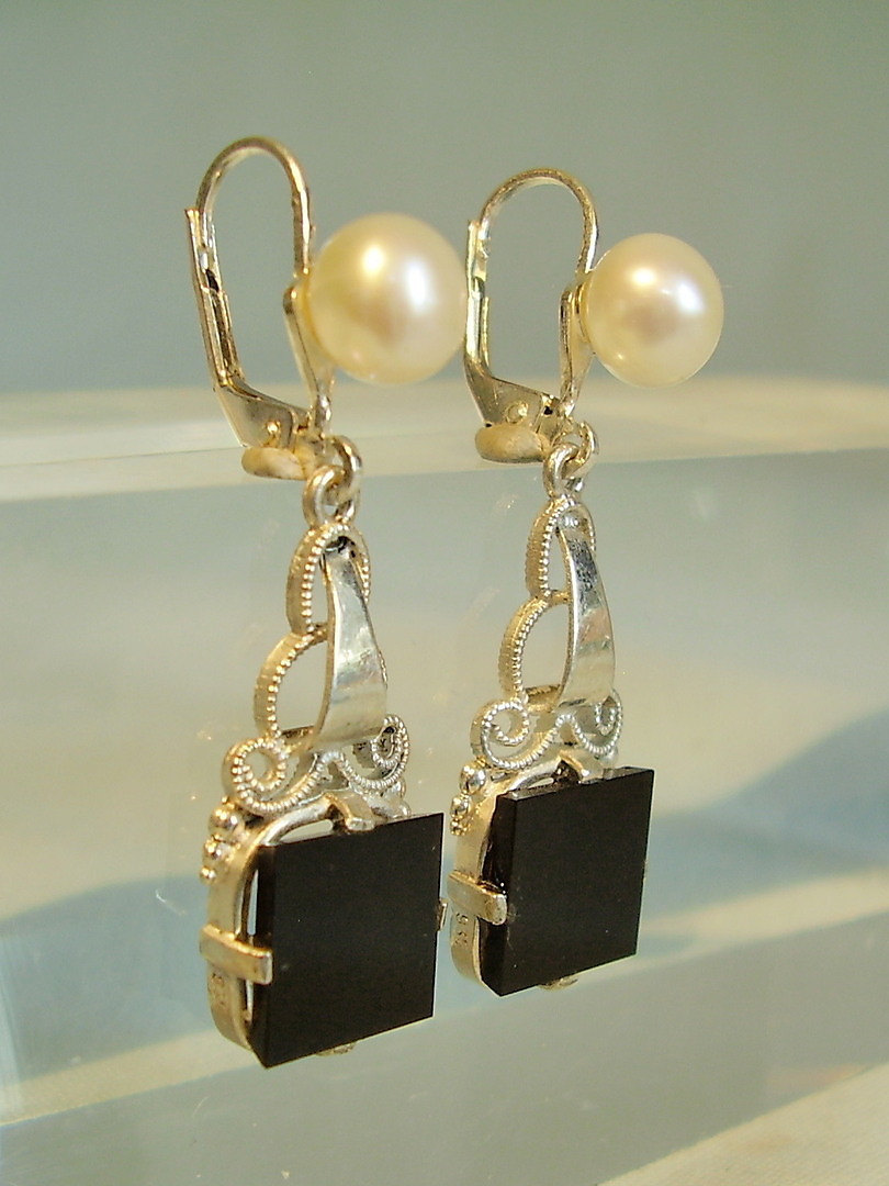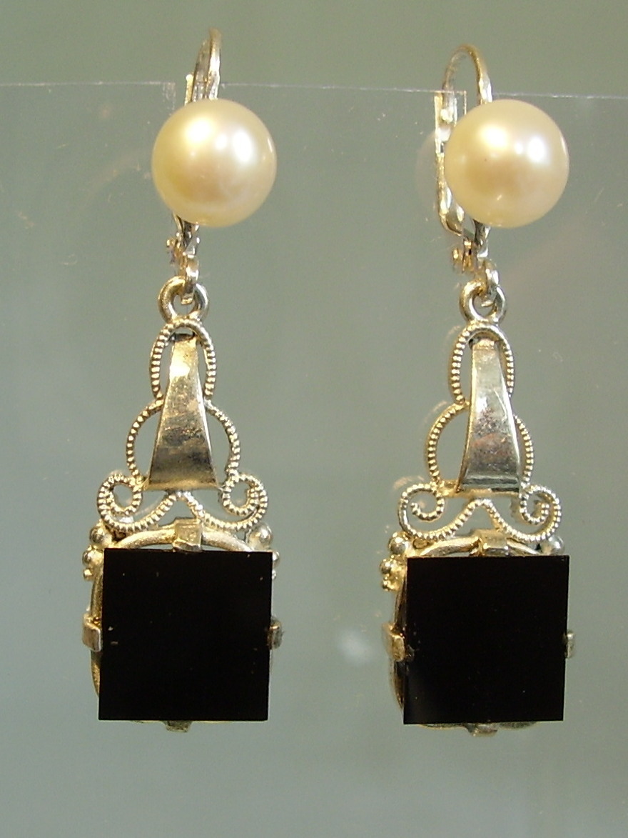 510084. ØRERINGE MED ONYX + PERLE ART DECO.