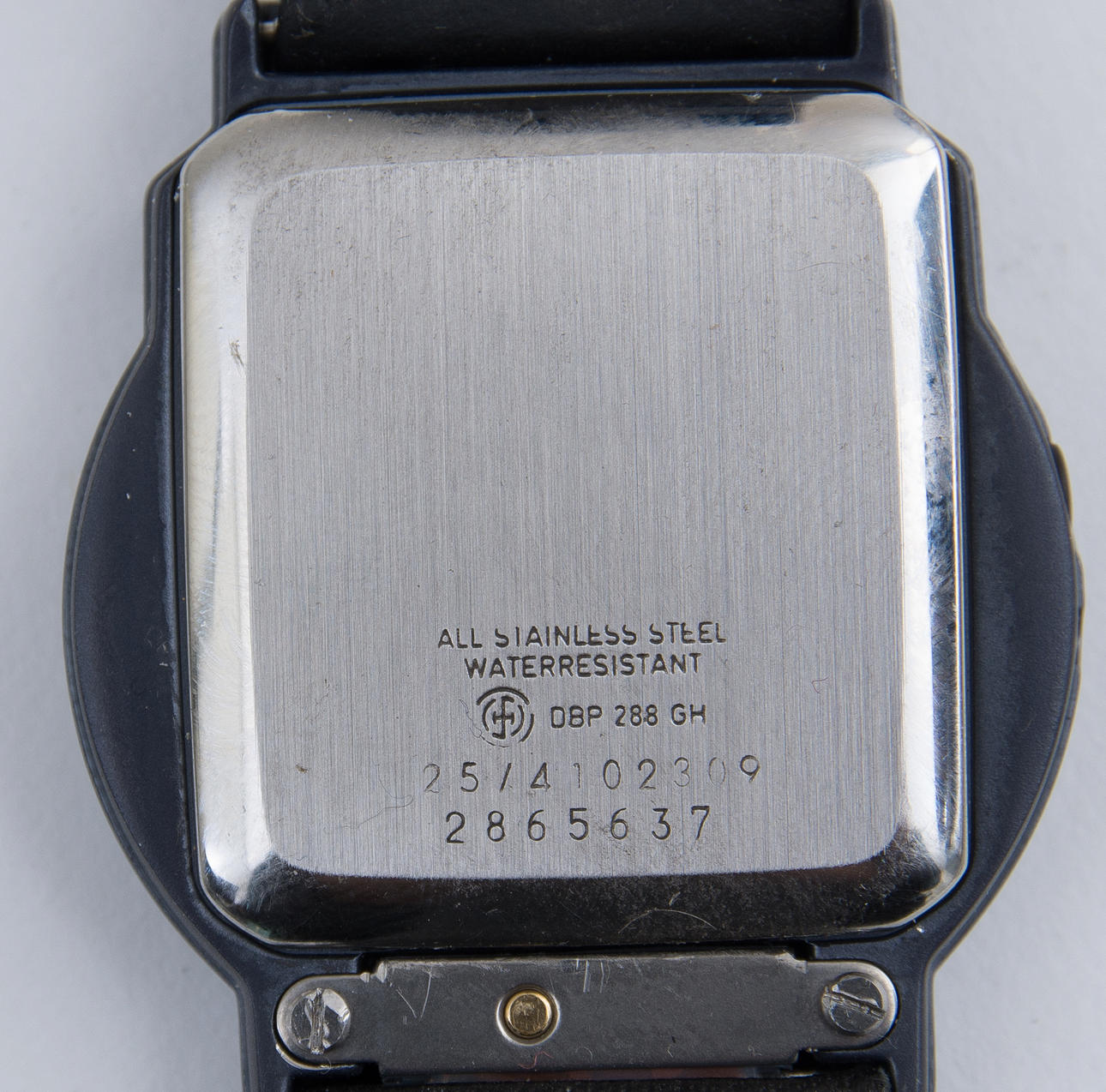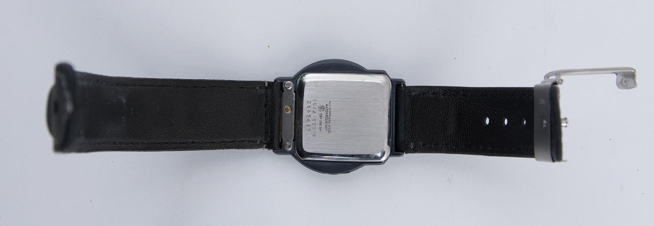 Farve antracit, 90'er, carbon urkasse og sort læderrem med trykknapper, automatisk, kassediameter: 35 mm, digital datovisning med ugedagsvisning, nummereret 25/4102309, 2865637, vandtæt og funktionel (testet af en guldsmed).