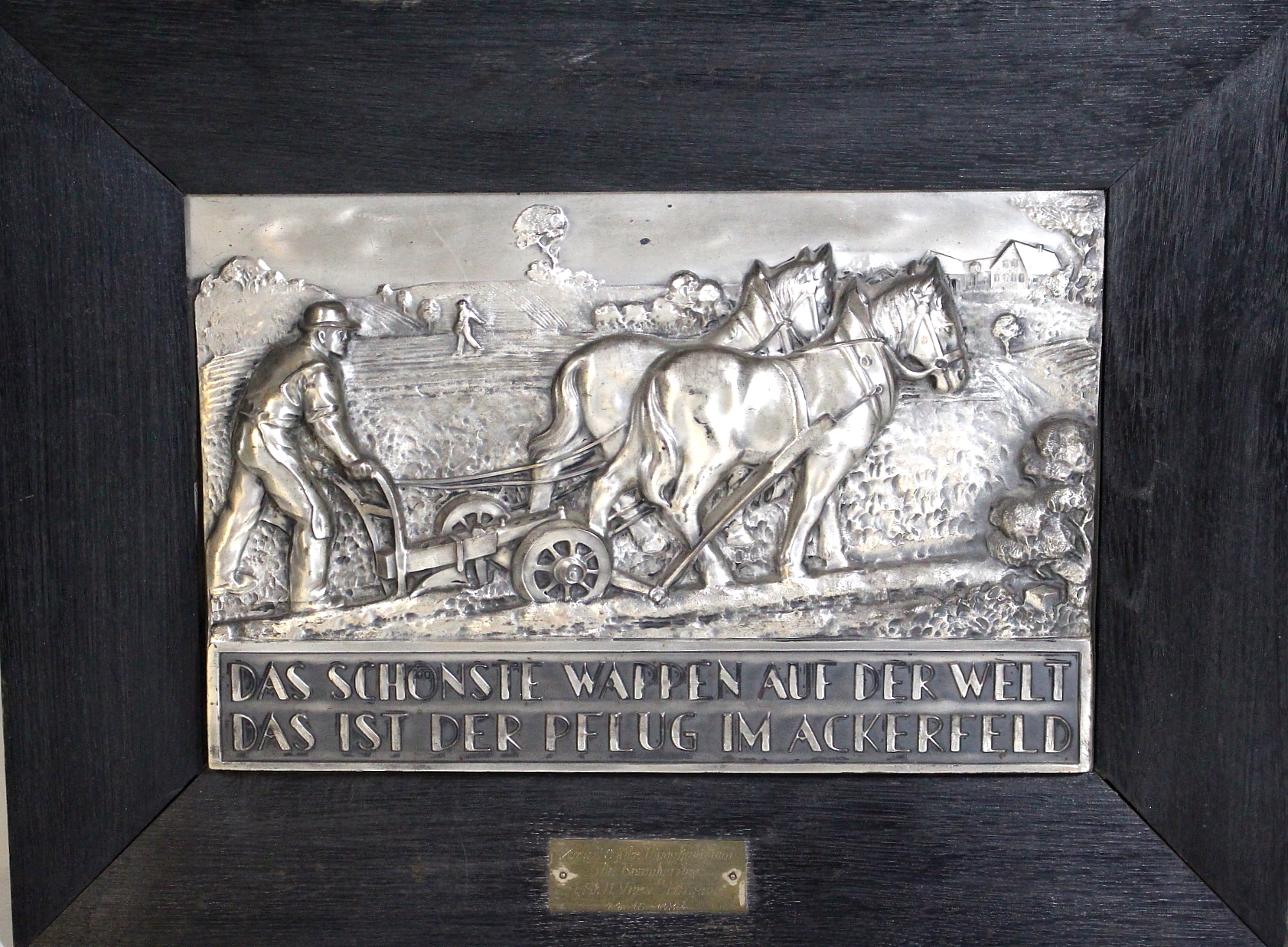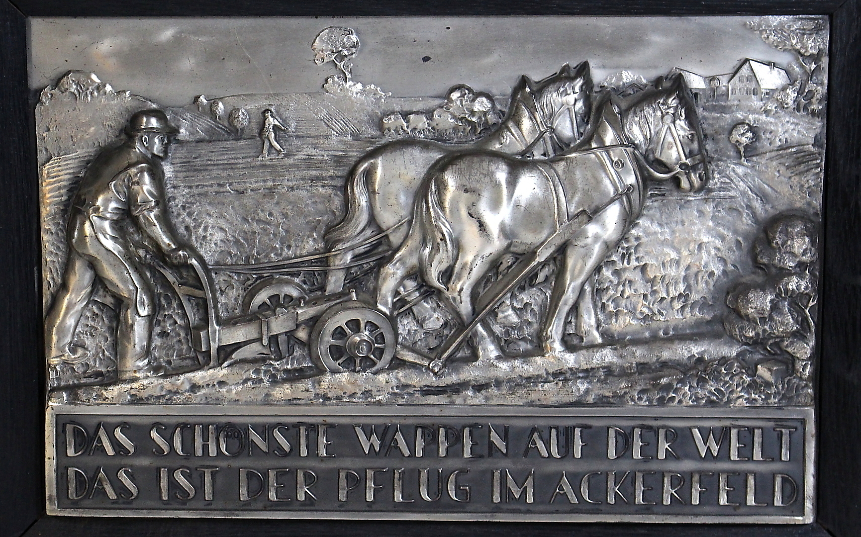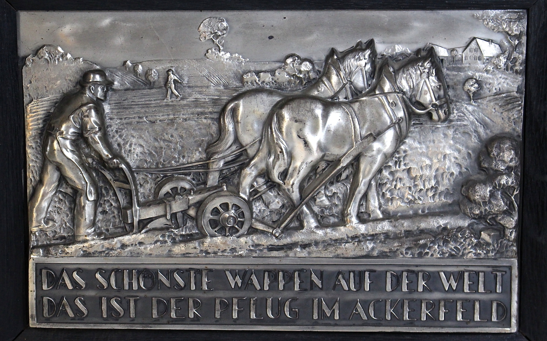 513506. OIDENTIFIERAD KONSTNÄR. Blikplade, heste der pløjer.