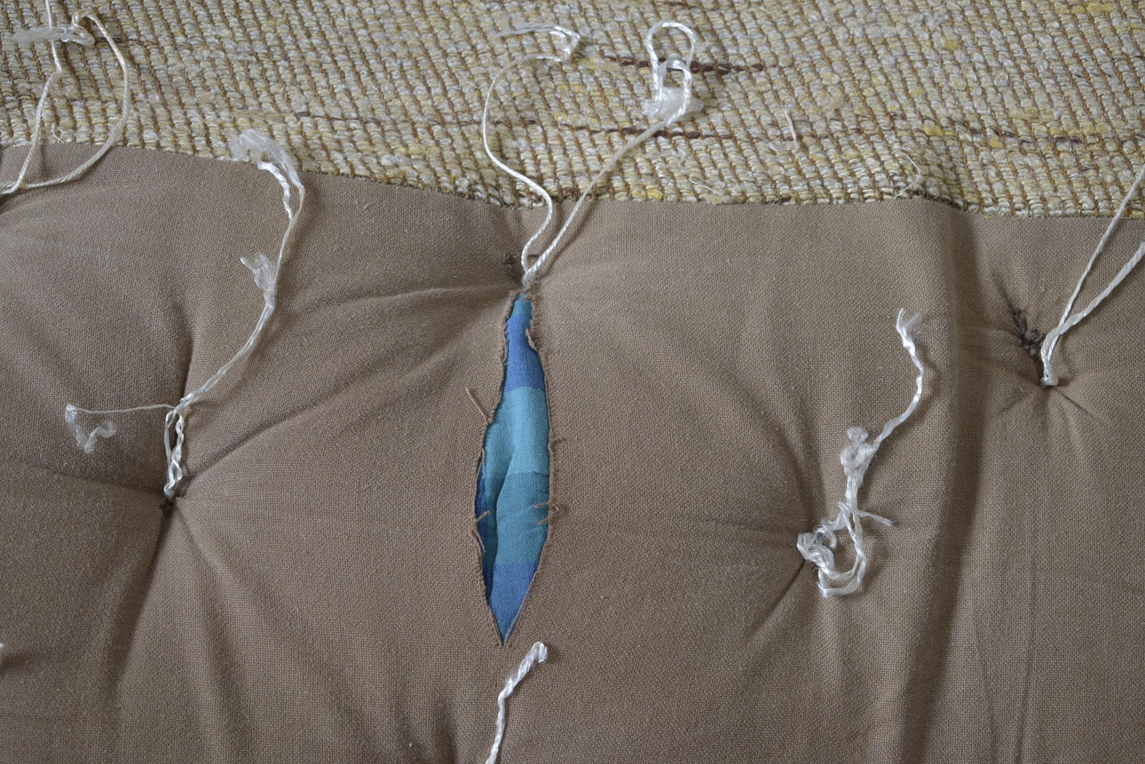 Brugt, Mærker, flænger, stof mangler på bagsiden af nakkestøtten, rem mangler.