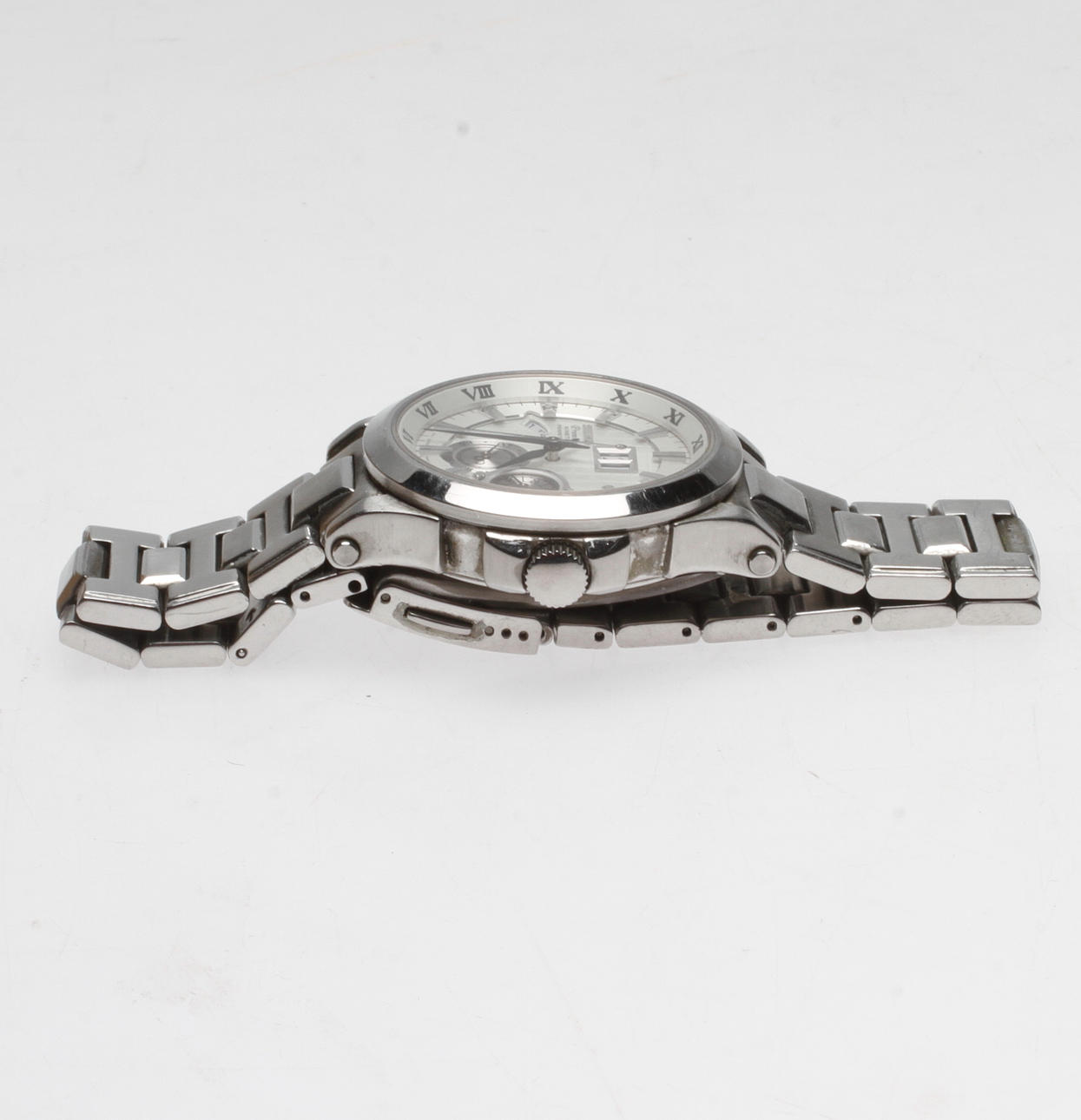 Stål. Urets diameter er cirka 42 mm. Dato.