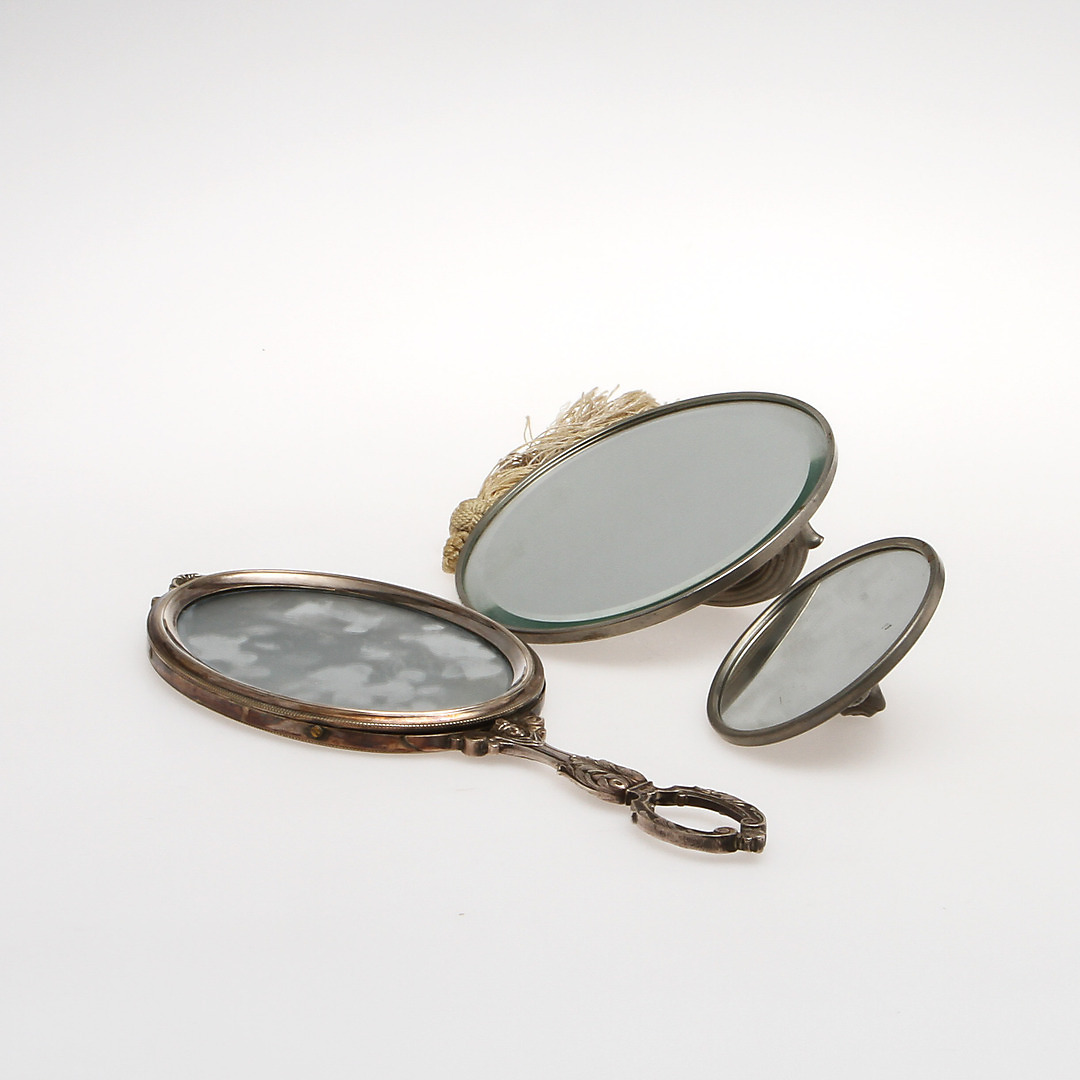 520781. HÅNDSPEJLE, 3 stk, nysølv og tin.