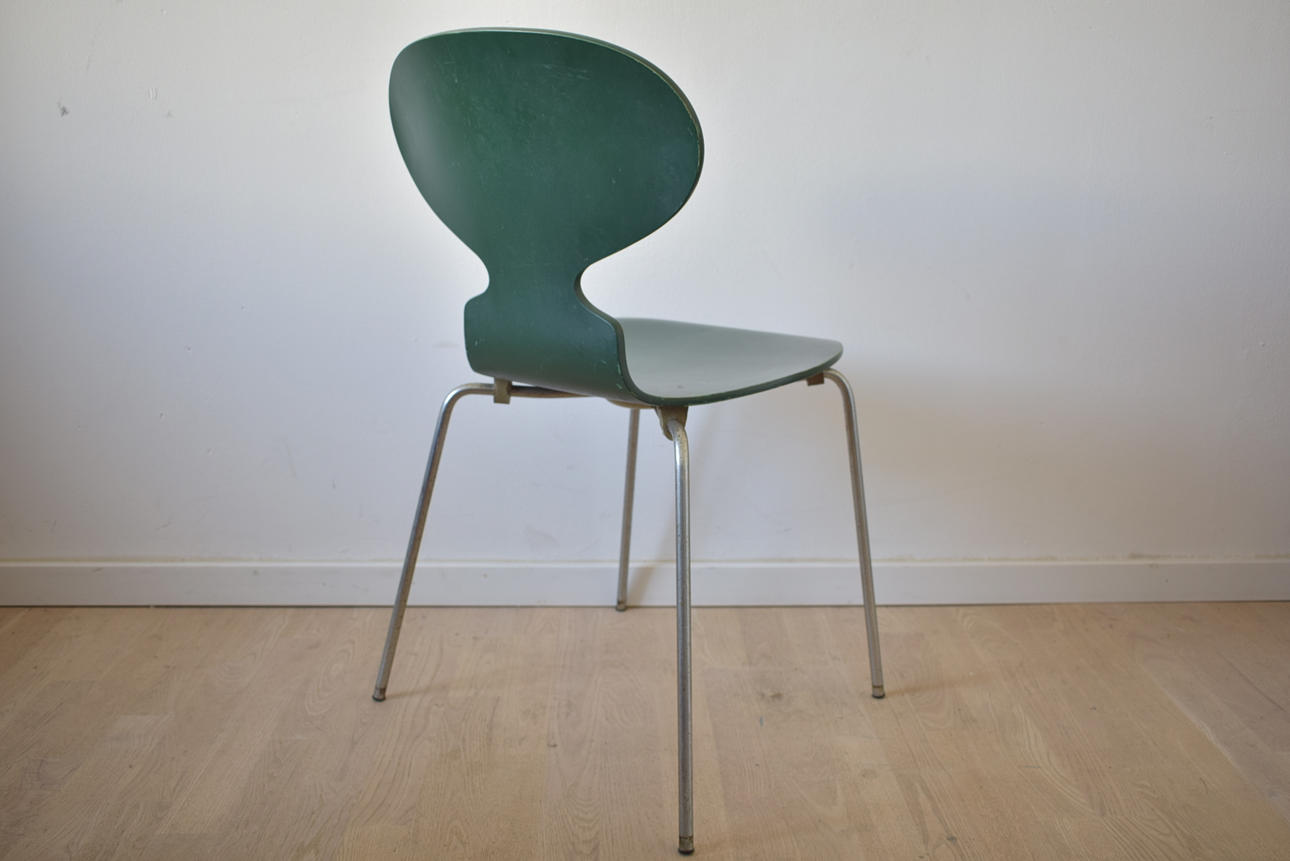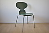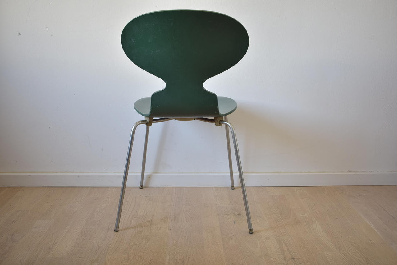 En grøn myrestol, designet af Arne Jacobsen, lavet af Fritz Hansen i Danmark i 1973.