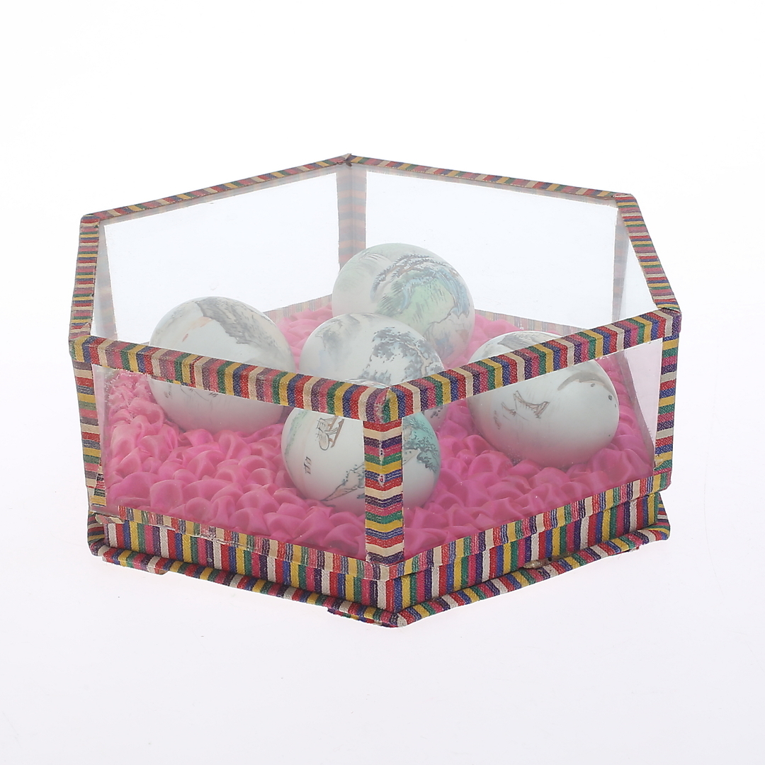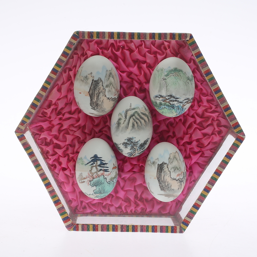 524827. MALEDE ÆGGESKÆL 5 stk, i monterask, orientalsk, 1900-tallet.