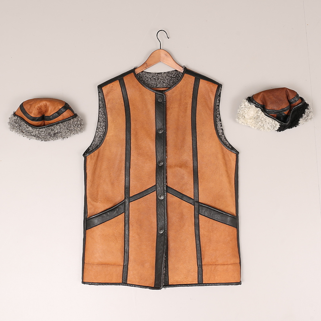 531975. FÅRESKINDSVEST. HATTE, 2 stk.