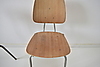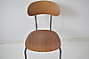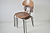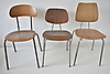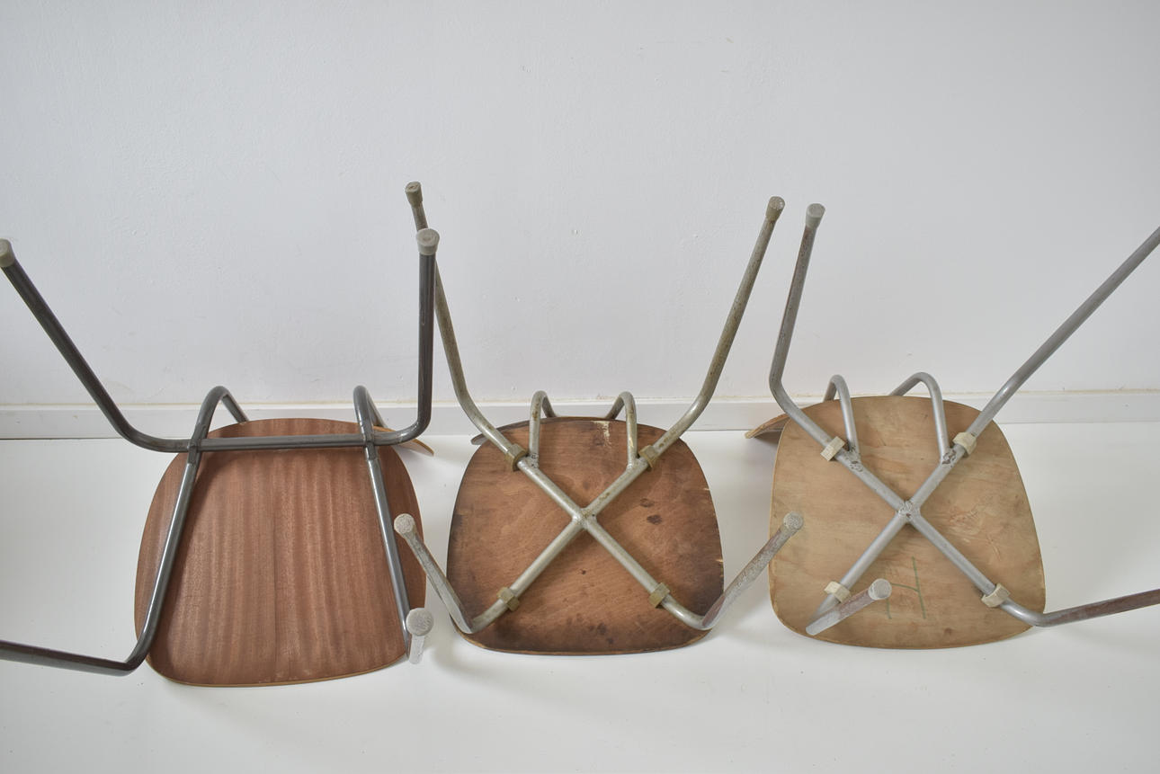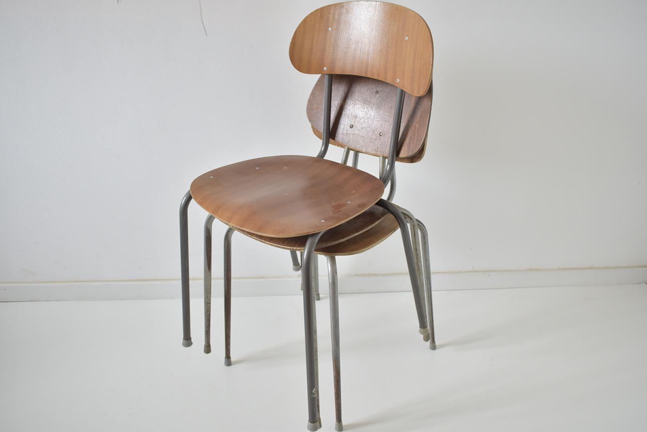 3 forskellige stabelbare skolestole i teak, med stel af stål.