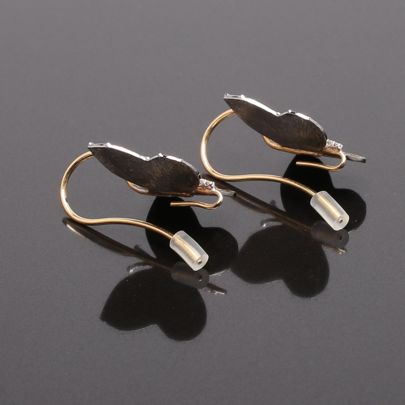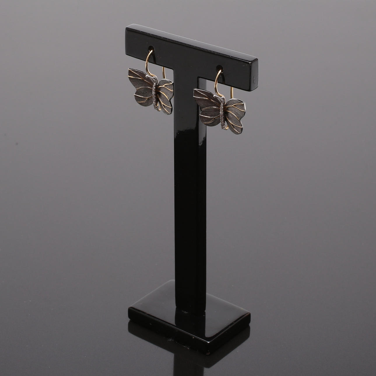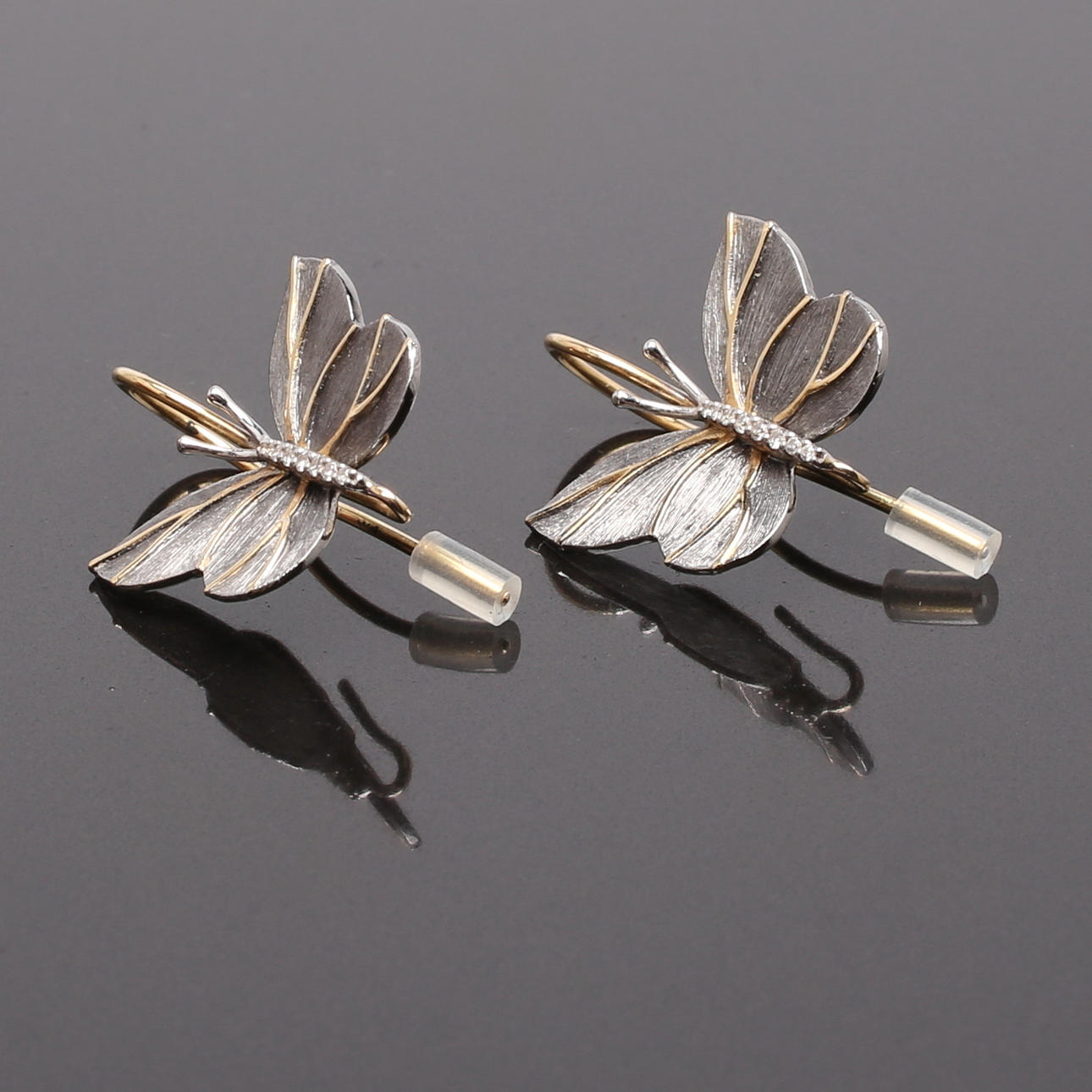 Dekoration af sommerfugle, gult guld, hvidguld og oxideret guld. Kroge.
