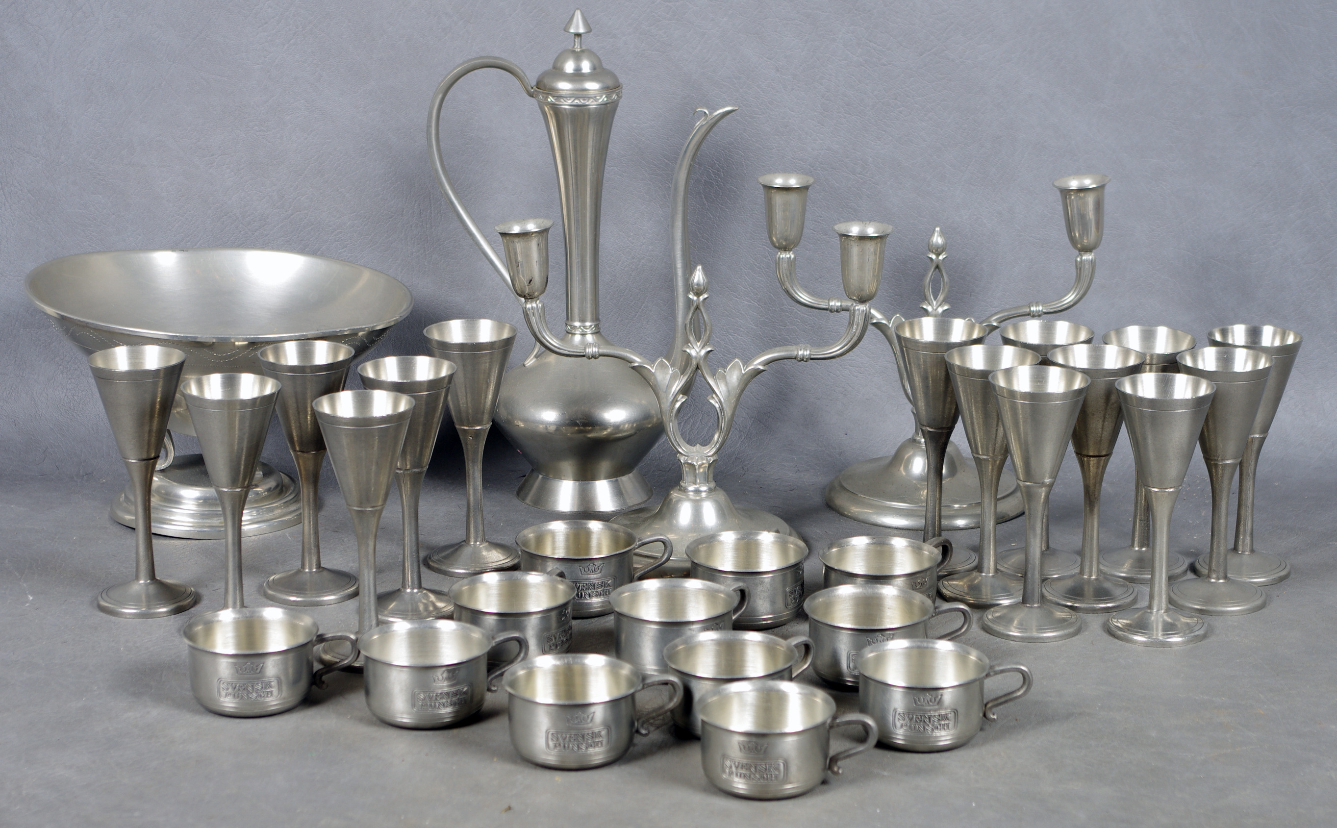 56038. TINNVARER, skåle, glas, lysestager mm.