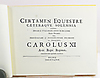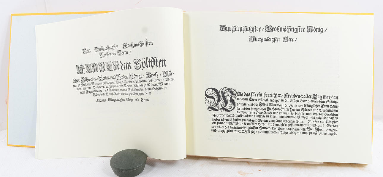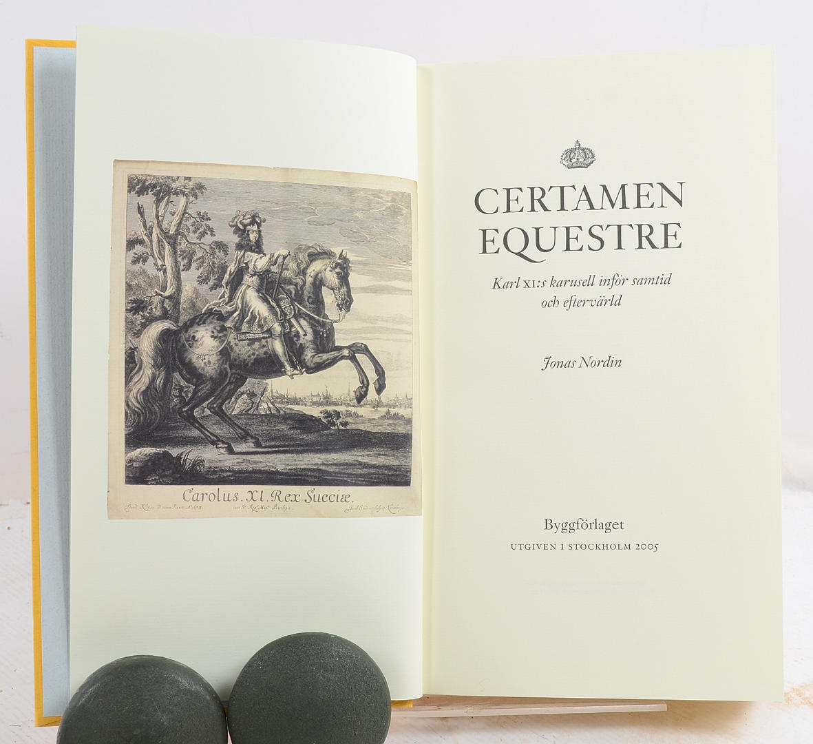 Karl XI's Karrusel for sin Samtid og for Eftertiden. Tekst: Jonas Nordin. Byggförlaget, Italien 2005. Tekstbind med kommentarer, 254 sider + et tallerkenbind med 82 plader, heraf 3 udfoldelige. Forlagets to gule papbånd med titeltekst i rødt. Opbevares i en robust gul kassette lavet af kraftigt pap. Tekstbind 29x17 cm + pladesektion 29x39 cm Smukt udført faksimile af Ehrenstrahls udgivne pladeværk fra 1686 af karrusellen og festlighederne ved Karl XI's tronbestigelse i 1672. Barokke ridderspil, ceremonier og hoffester vises i detaljer. Værket er en værdifuld kilde til viden om det svenske stormagtsrige og dets ritualer. Parallel tekst på svensk og engelsk.