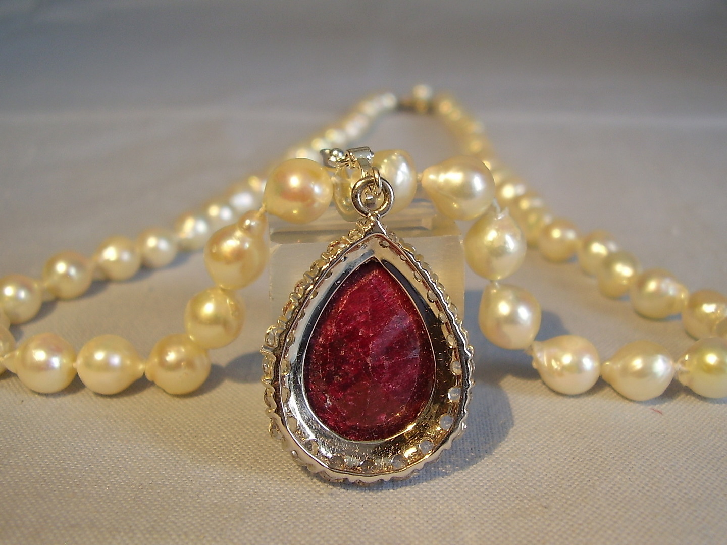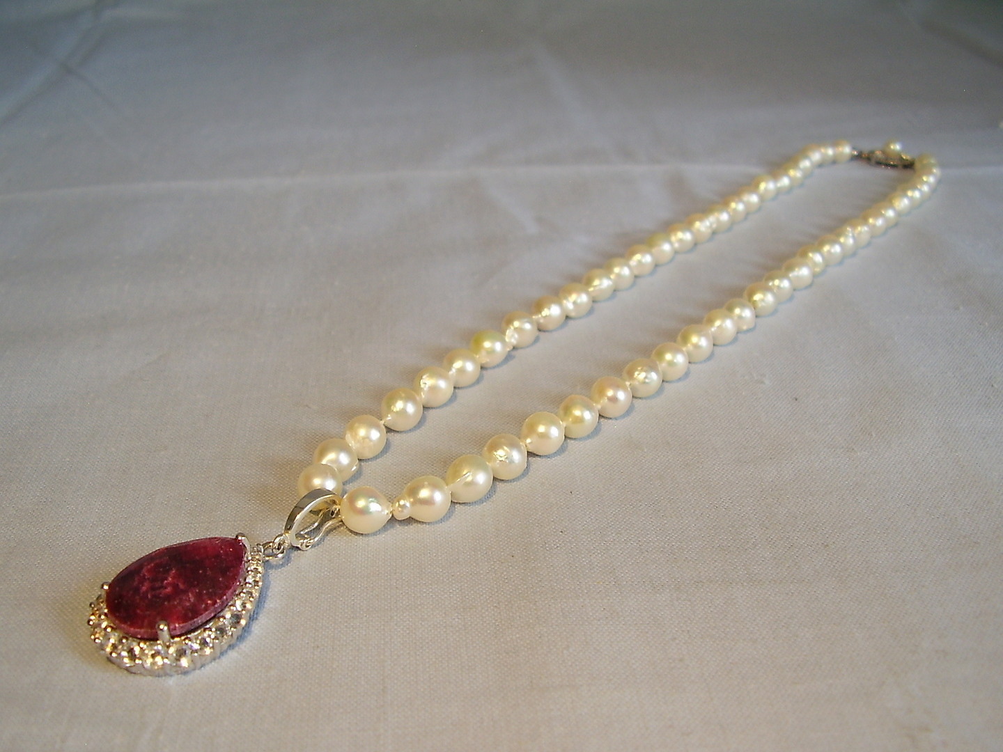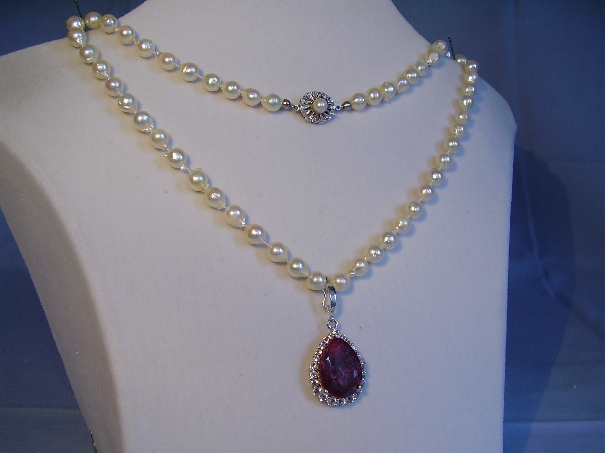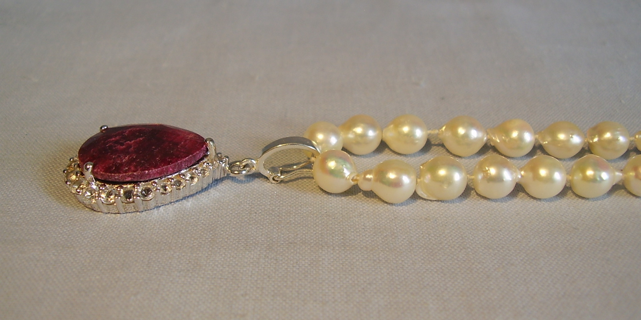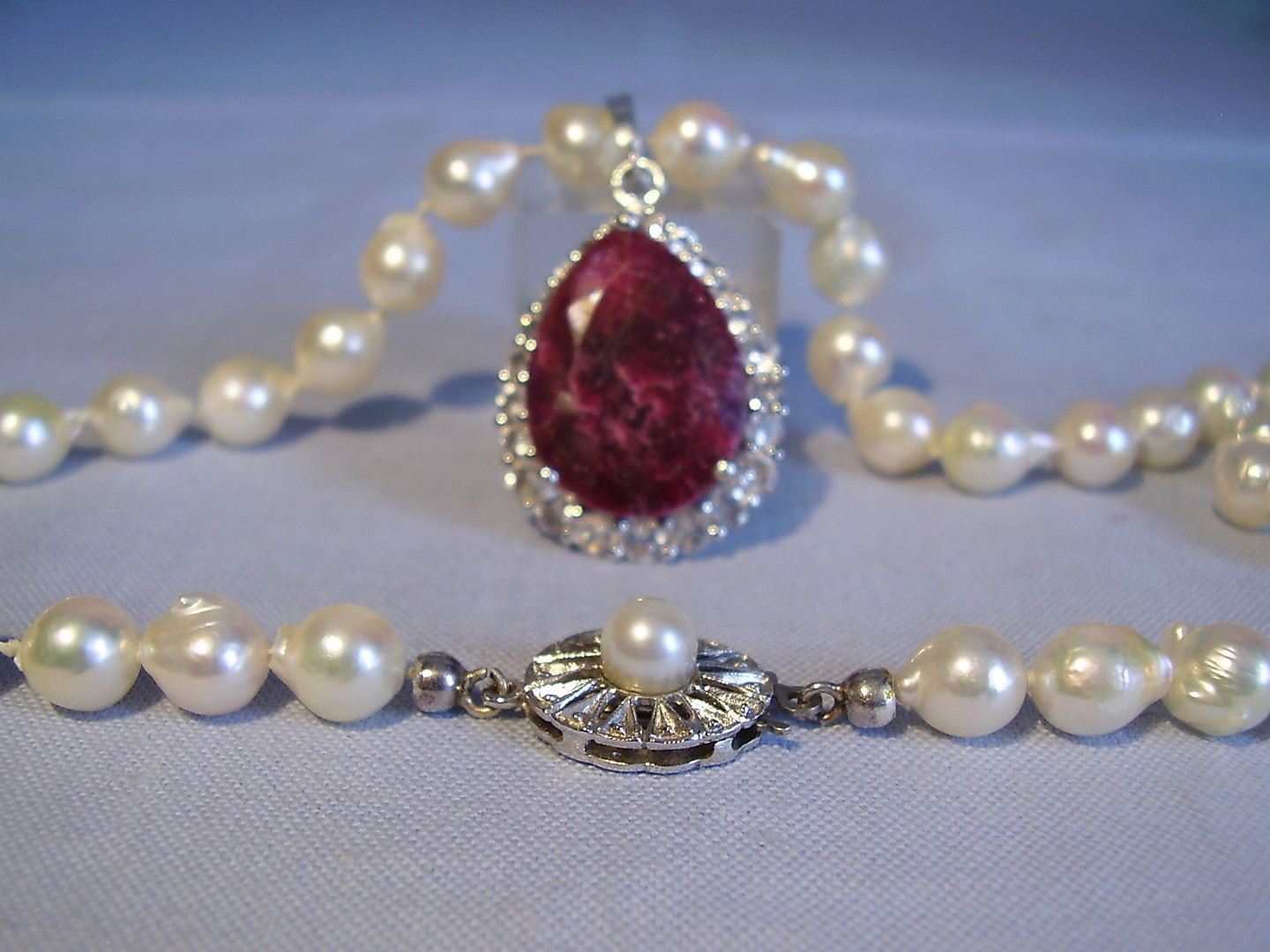 618934. AKOYA PERLEHALDSÆDE MED RUBYVÆNDING.