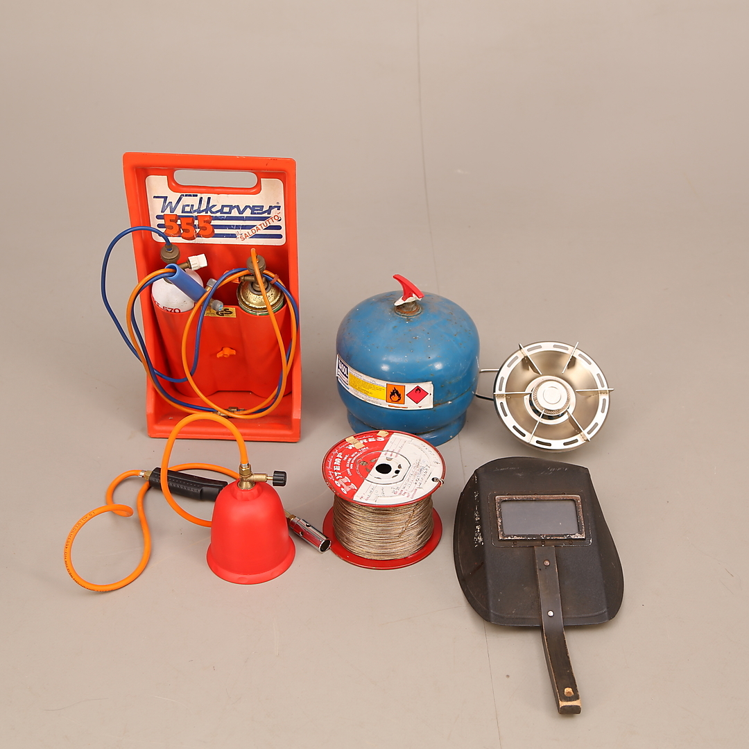 620105. GASVÆRKTØJ, 4 stk + TRÅDRULLE + SVEJSESKÆRM.