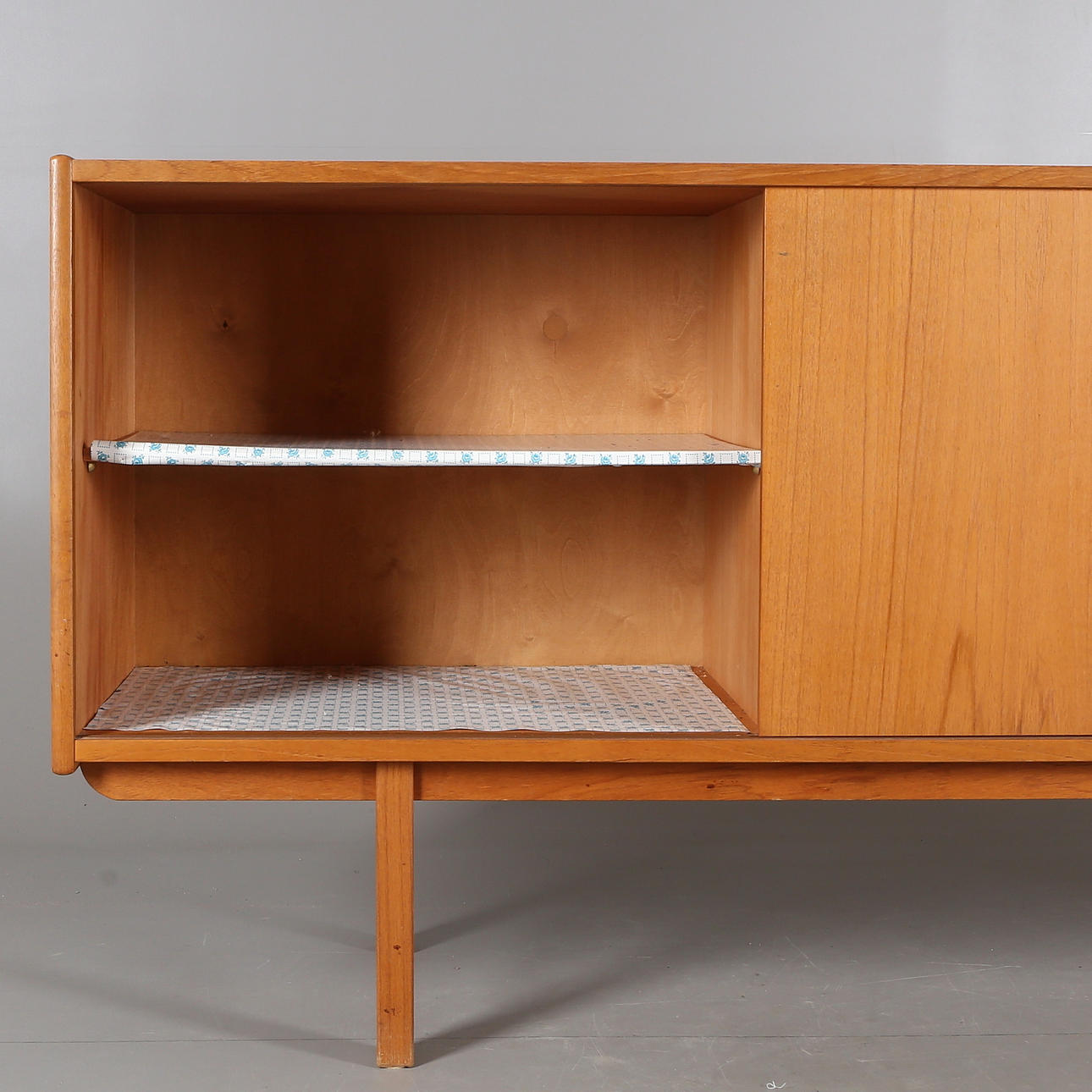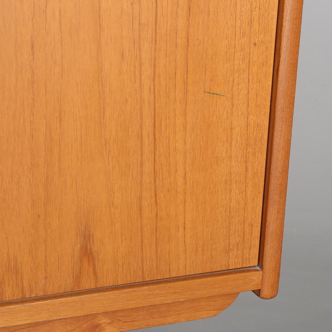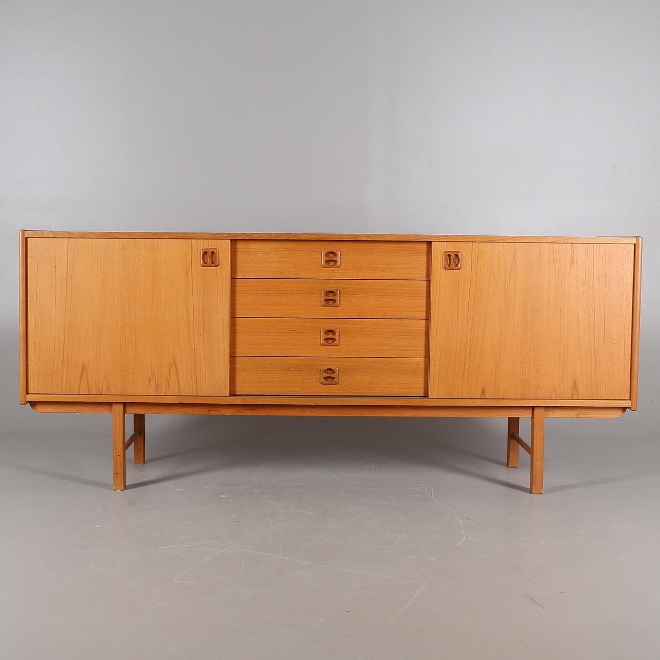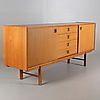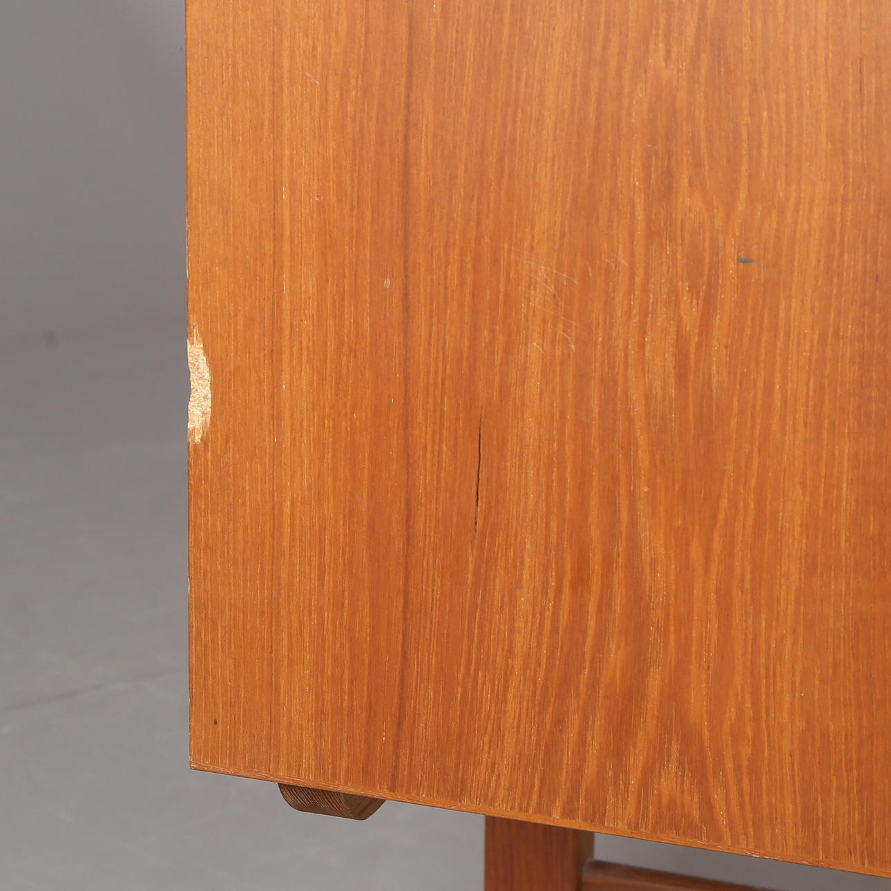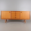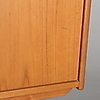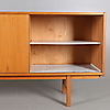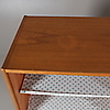 Teak finer. 4 skuffer og to skydelåger. Længde 182, bredde 42, højde 76 cm.