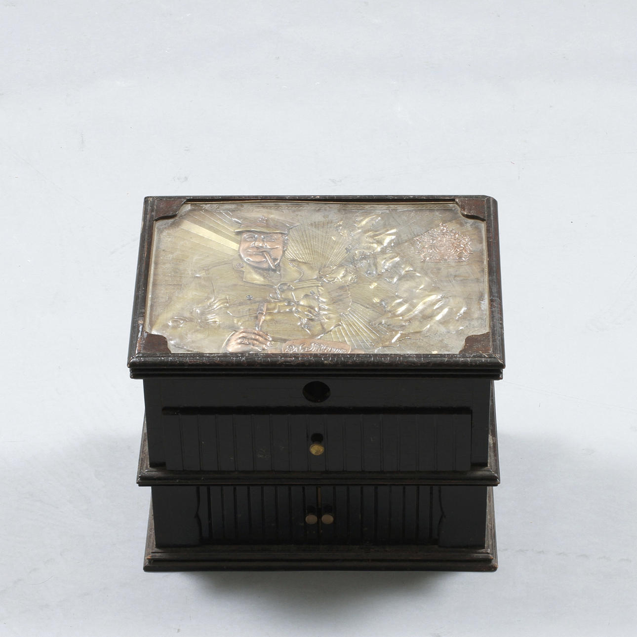 overdel glaseret med figur "Winston Churchill" i tin. Længde 41 cm, bredde 28 cm, højde 34 cm.