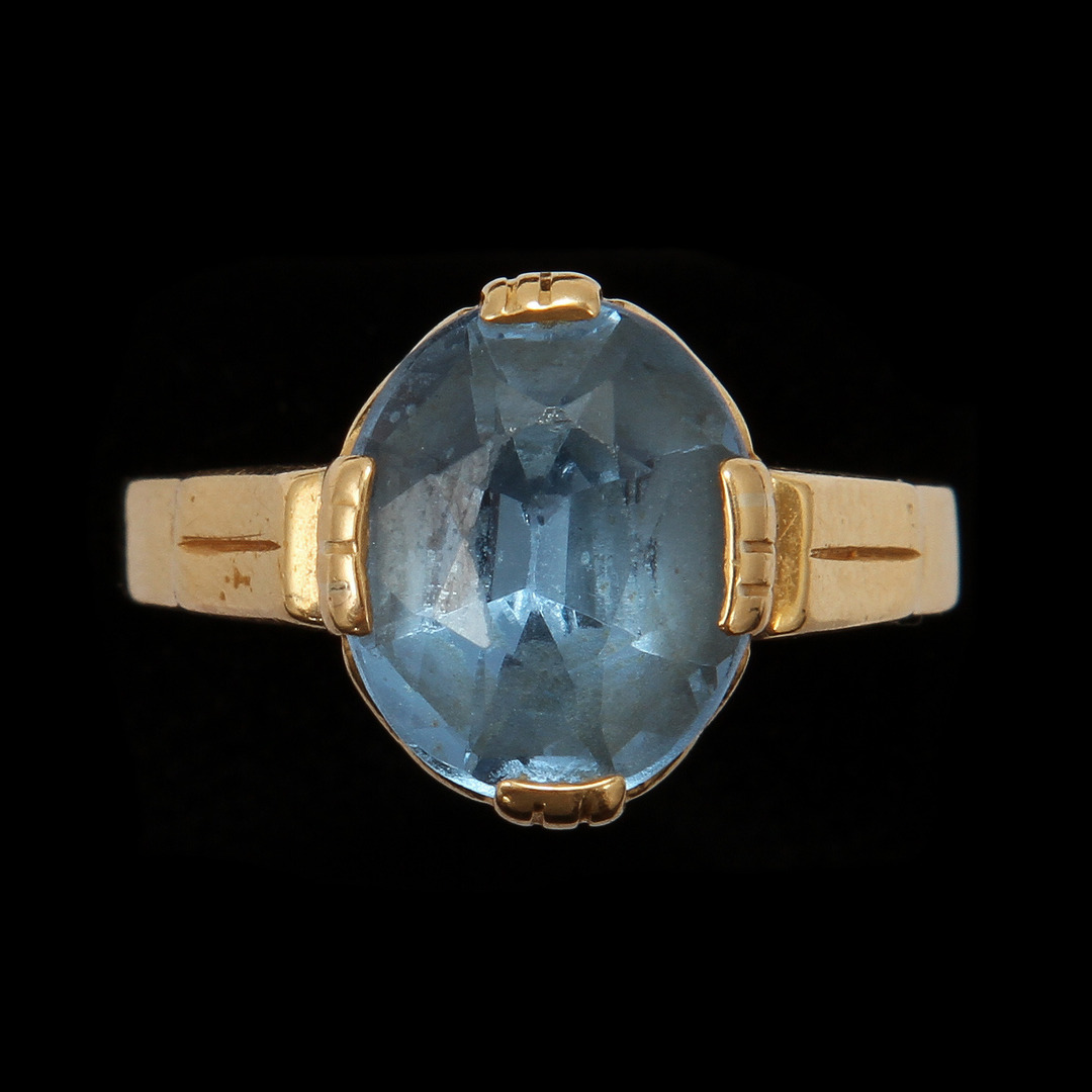 63904. RING, 18 karat guld med blå sten, 6,3 gram brutto.
